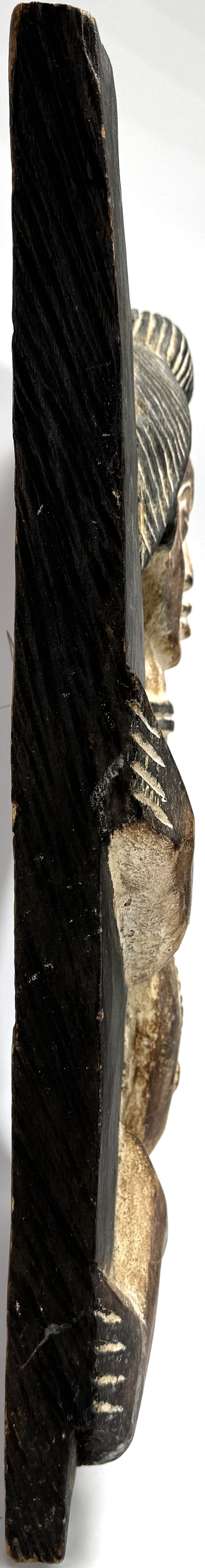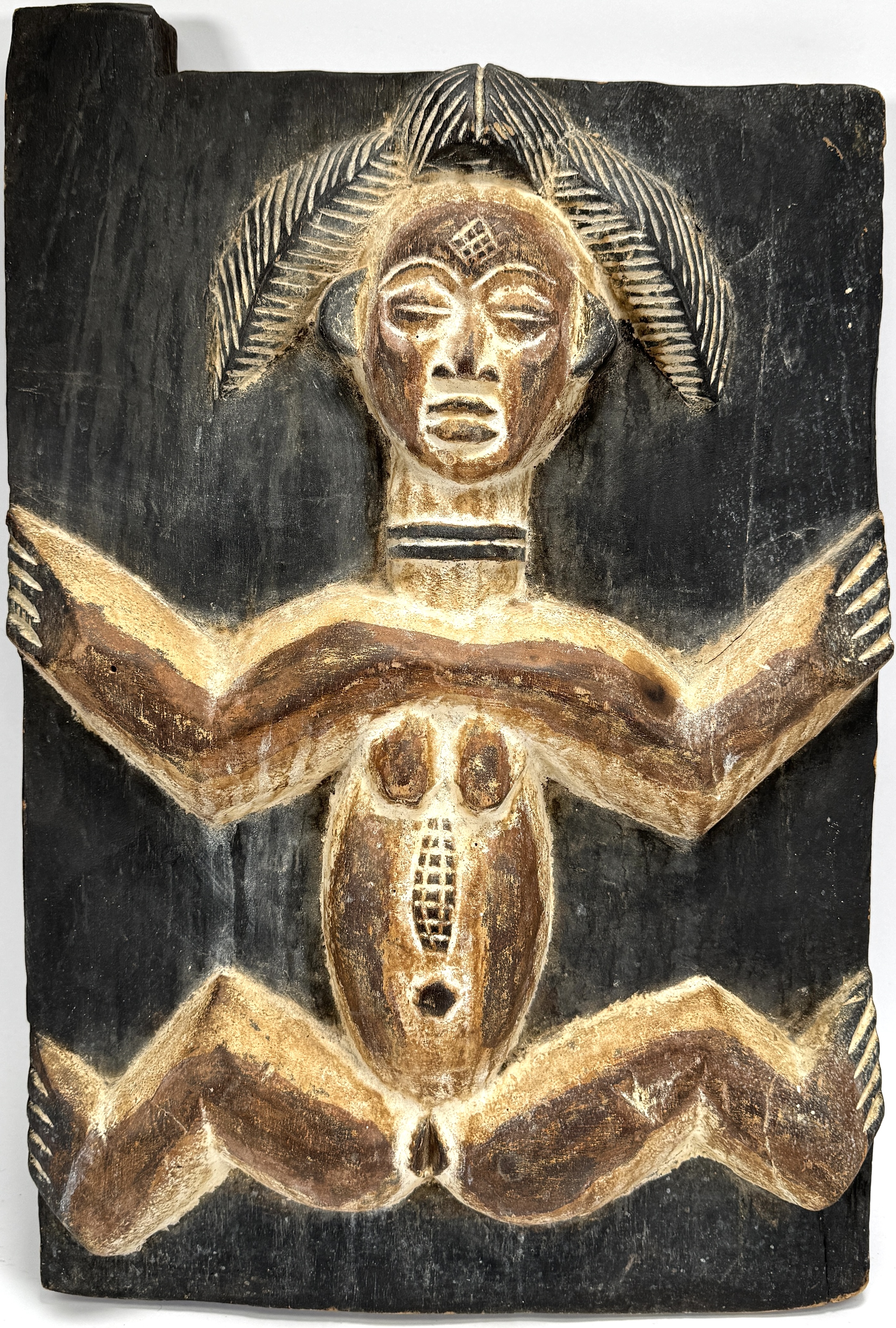 Een houten wandpaneel in tribale stijl, gedateerd midden 20e eeuw. Het object is handgesneden en toont een verhoogd figuratief reliëf van een gestileerde vrouw met hoofddeksel, armen en benen gespreid, Het paneel combineert donker gebeitste en lichter bewerkte houttinten, wat de details en textuur benadrukt. Beïnvloed door West-Afrikaanse sculptuurtradities, vermoedelijk uit Ivoorkust of omliggende regio.