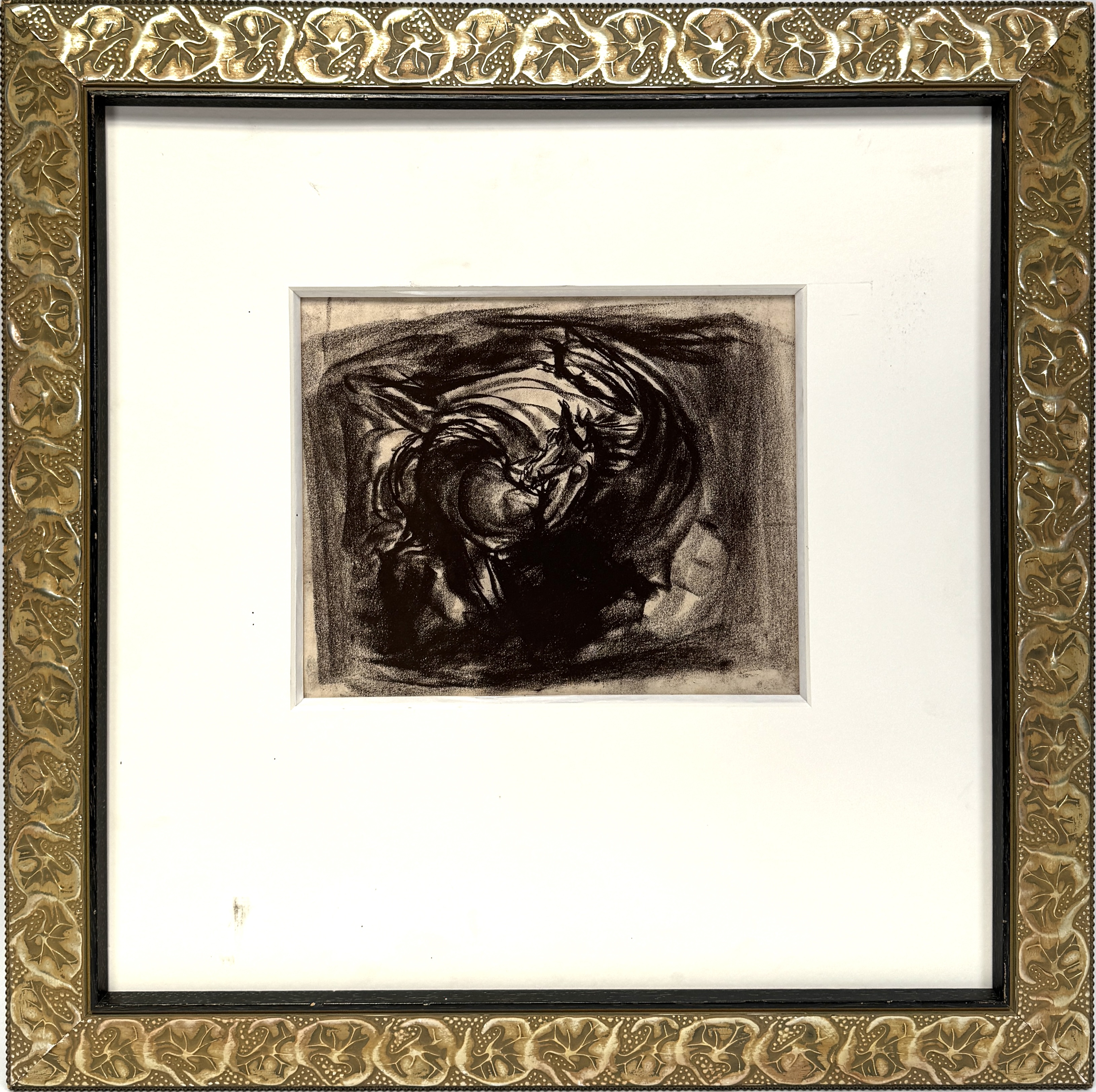 Expressieve litho, ca. 1950–1970, uitgevoerd in zwart-wit op papier. De voorstelling toont een abstract weergegeven paard in beweging, omgeven door krachtige lijnvoering en dramatische licht-donkercontrasten. Ongesigneerd, ingelijst achter passe-partout in goudkleurige lijst met florale reliëfdecoratie. Zelf beoordelen? Je bent welkom op onze kijkdagen op 29, 30 en 31 augustus! |