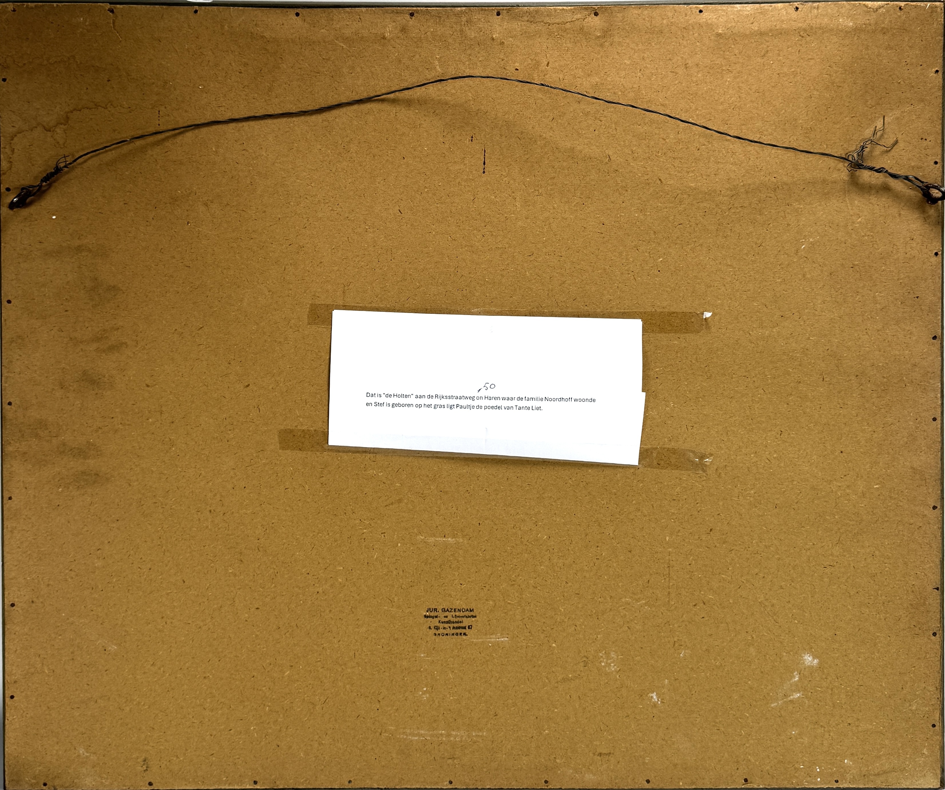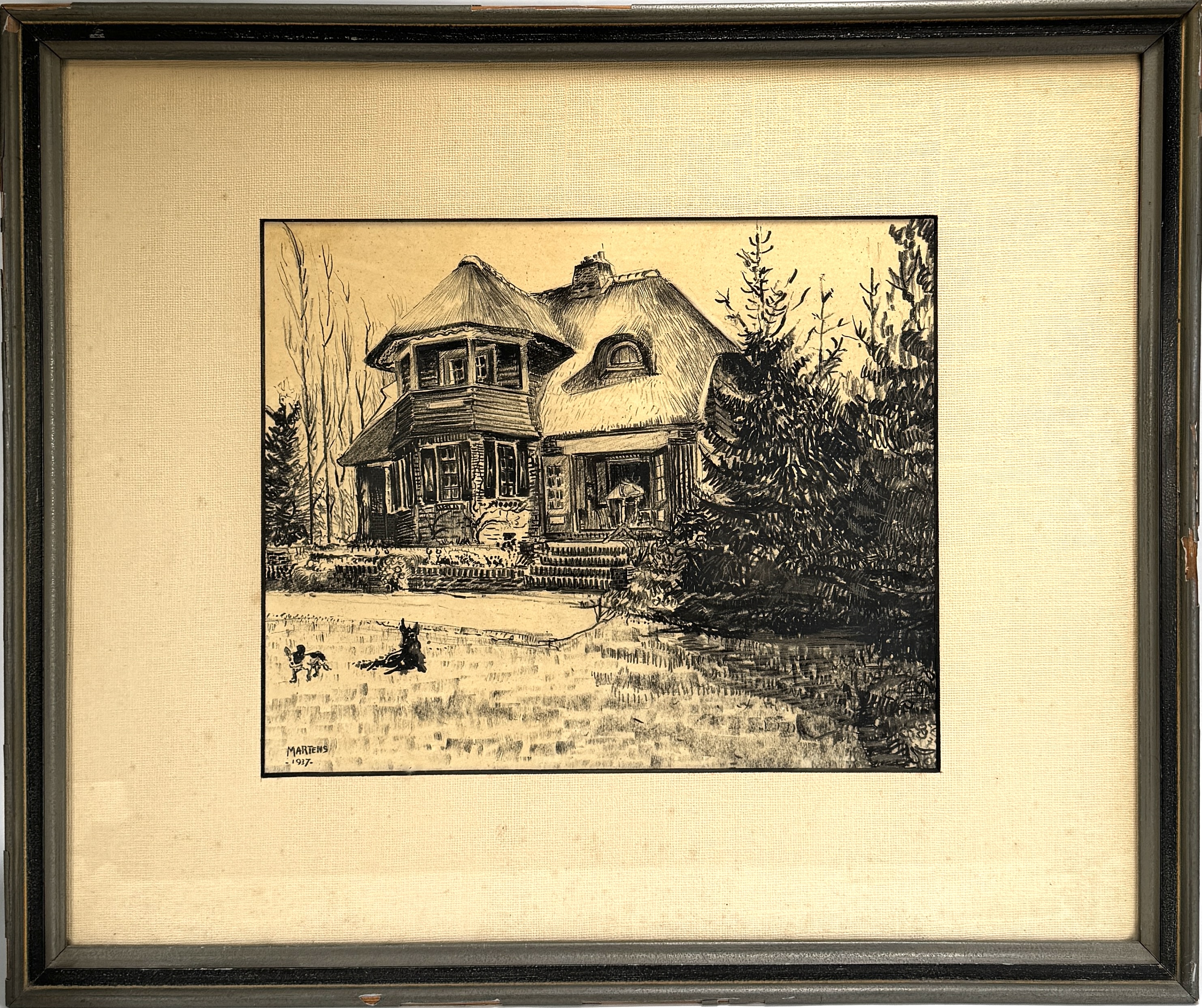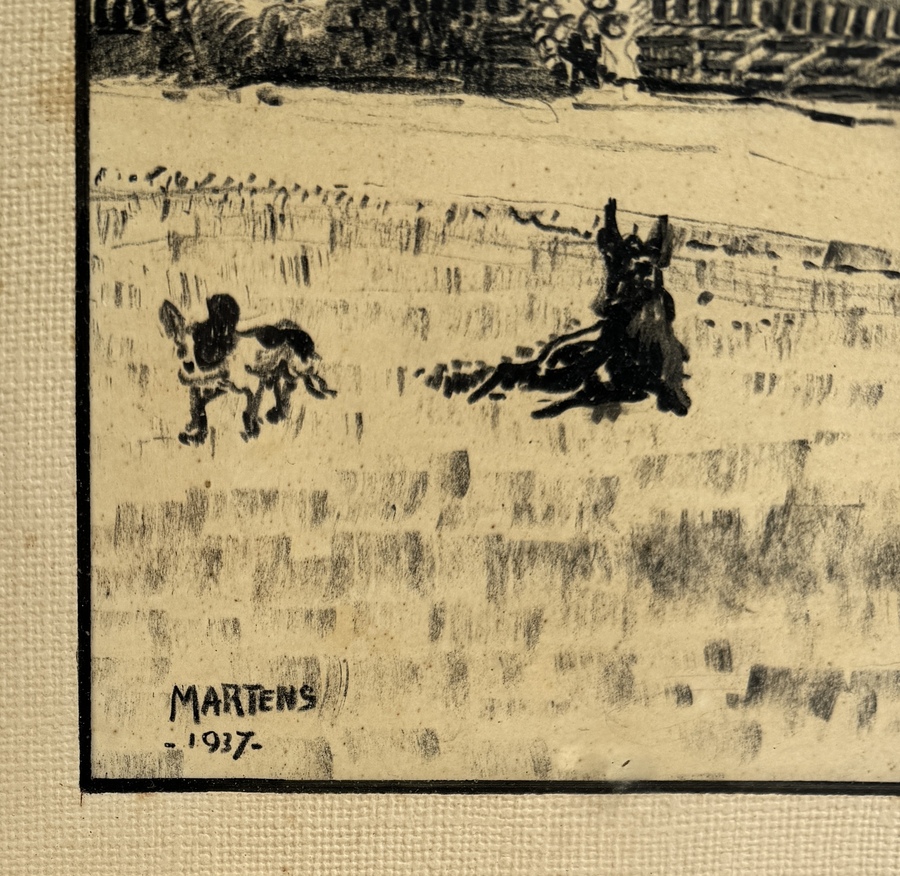 Klassieke interbellum tekening met architecturale focus door Georg Martens (1894–1979), gedateerd 1937. Uitvoering in pen en zwarte inkt met grijze lavis. Afgebeeld is villa De Holten aan de Rijksstraatweg in Haren, met erker, veranda, coniferen en twee honden. Linksonder gesigneerd en gedateerd. Geïnteresseerd? Bezoek onze kijkdagen voor een persoonlijke bezichtiging! |