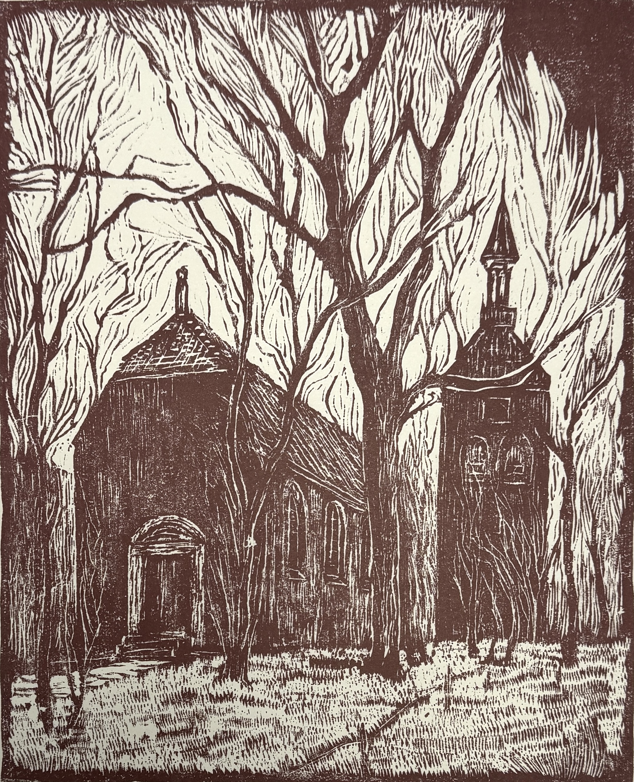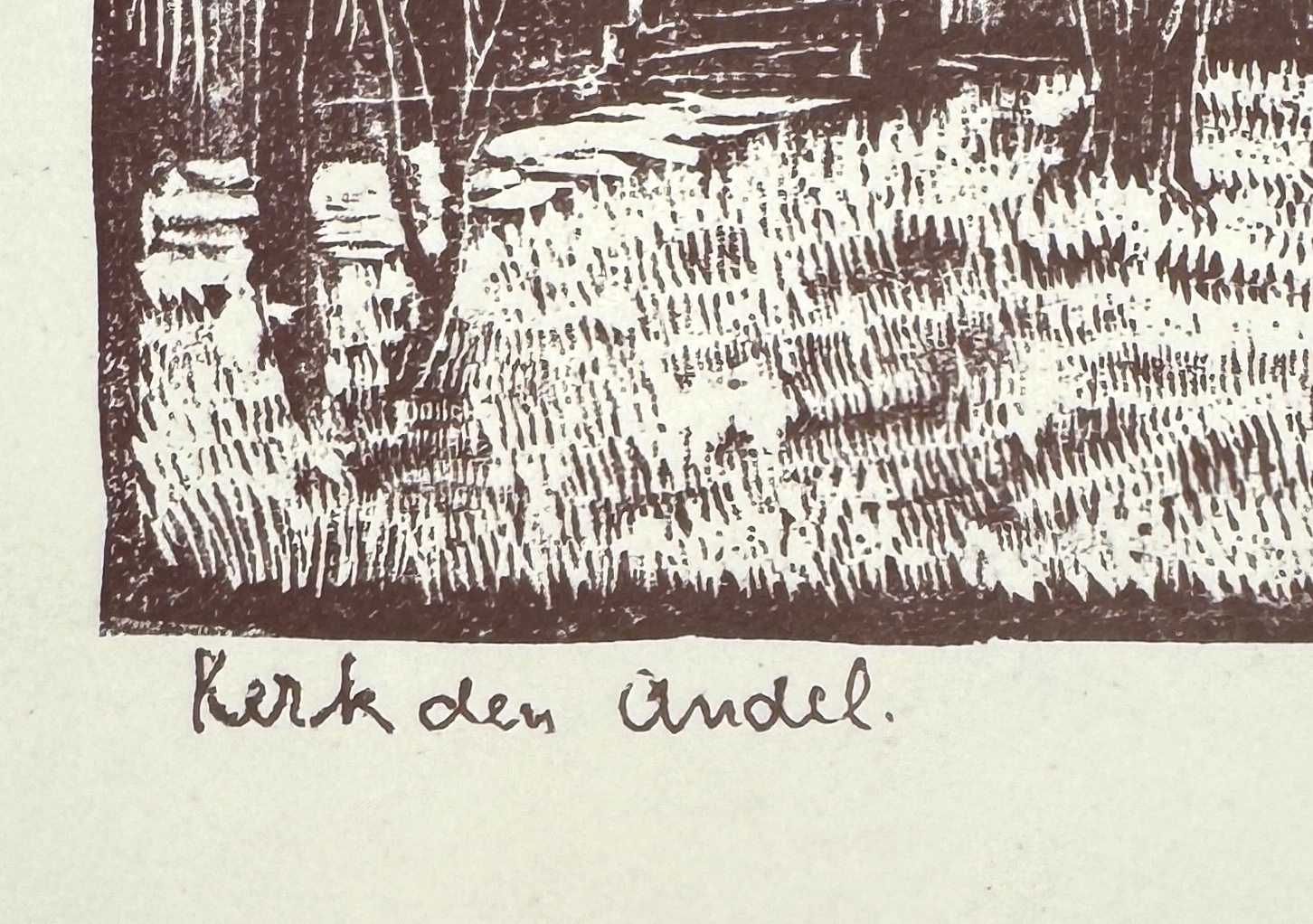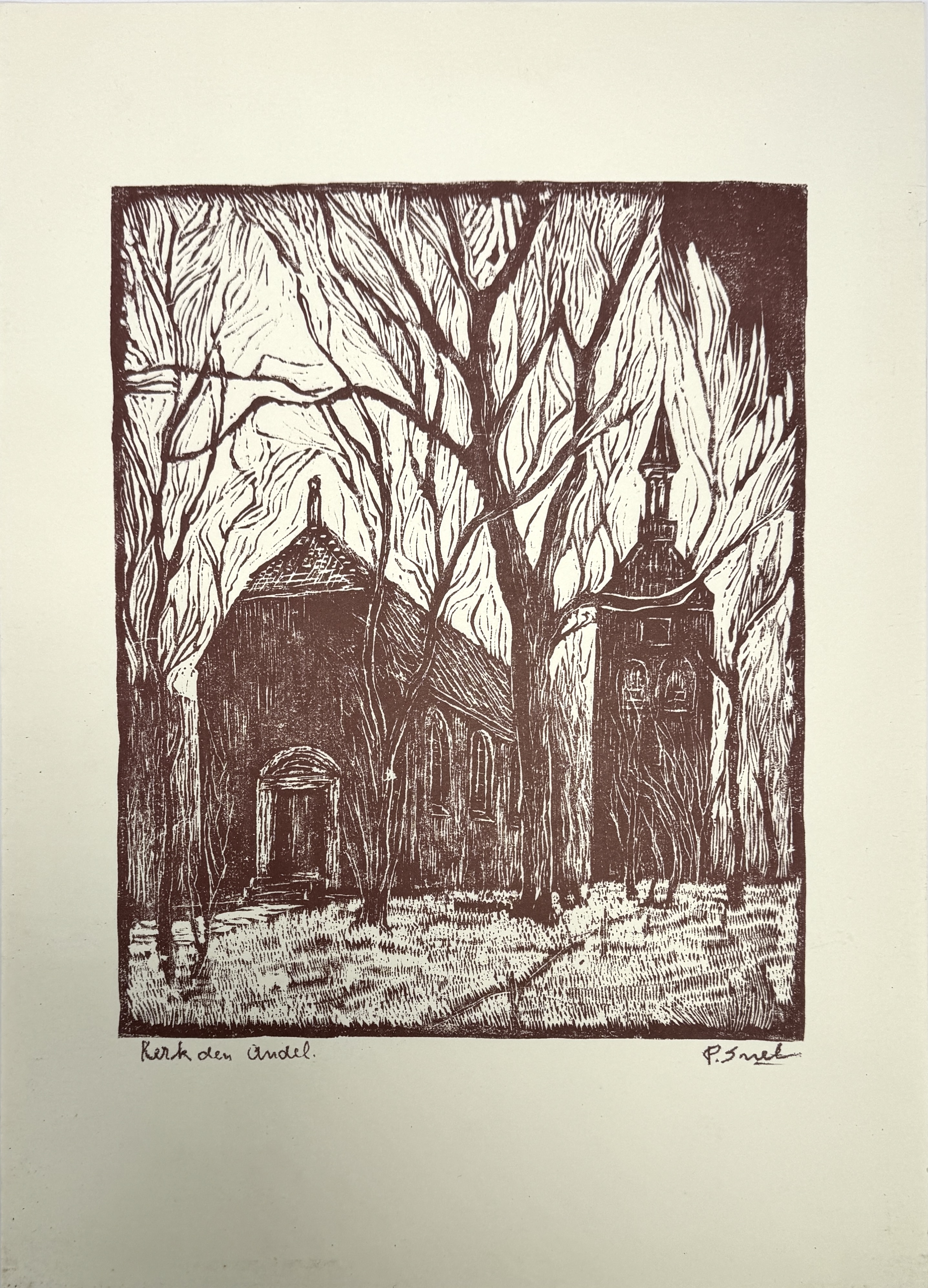 Houtsnede Piet Snel, "Kerk den Andel", midden 20e eeuw, Nederland