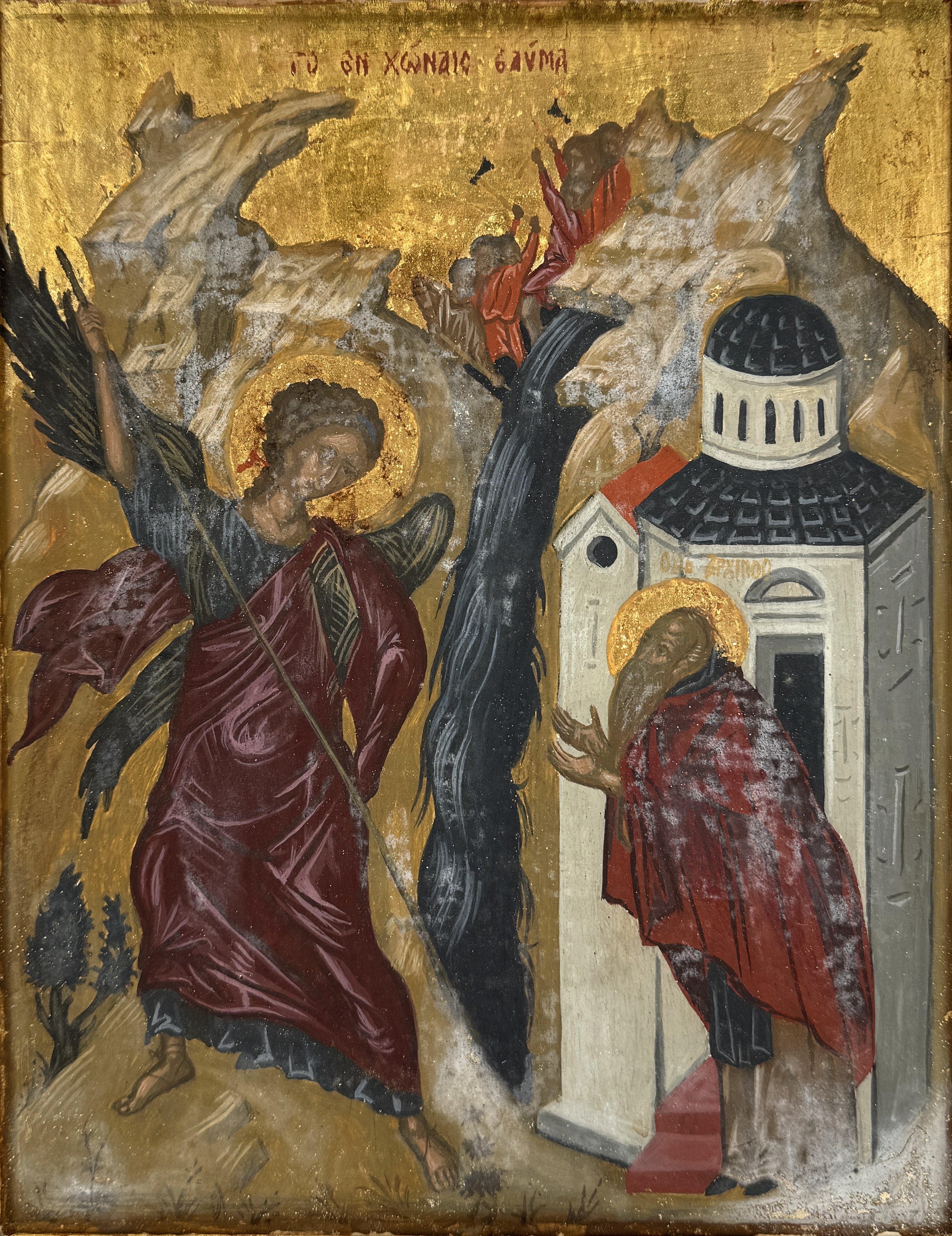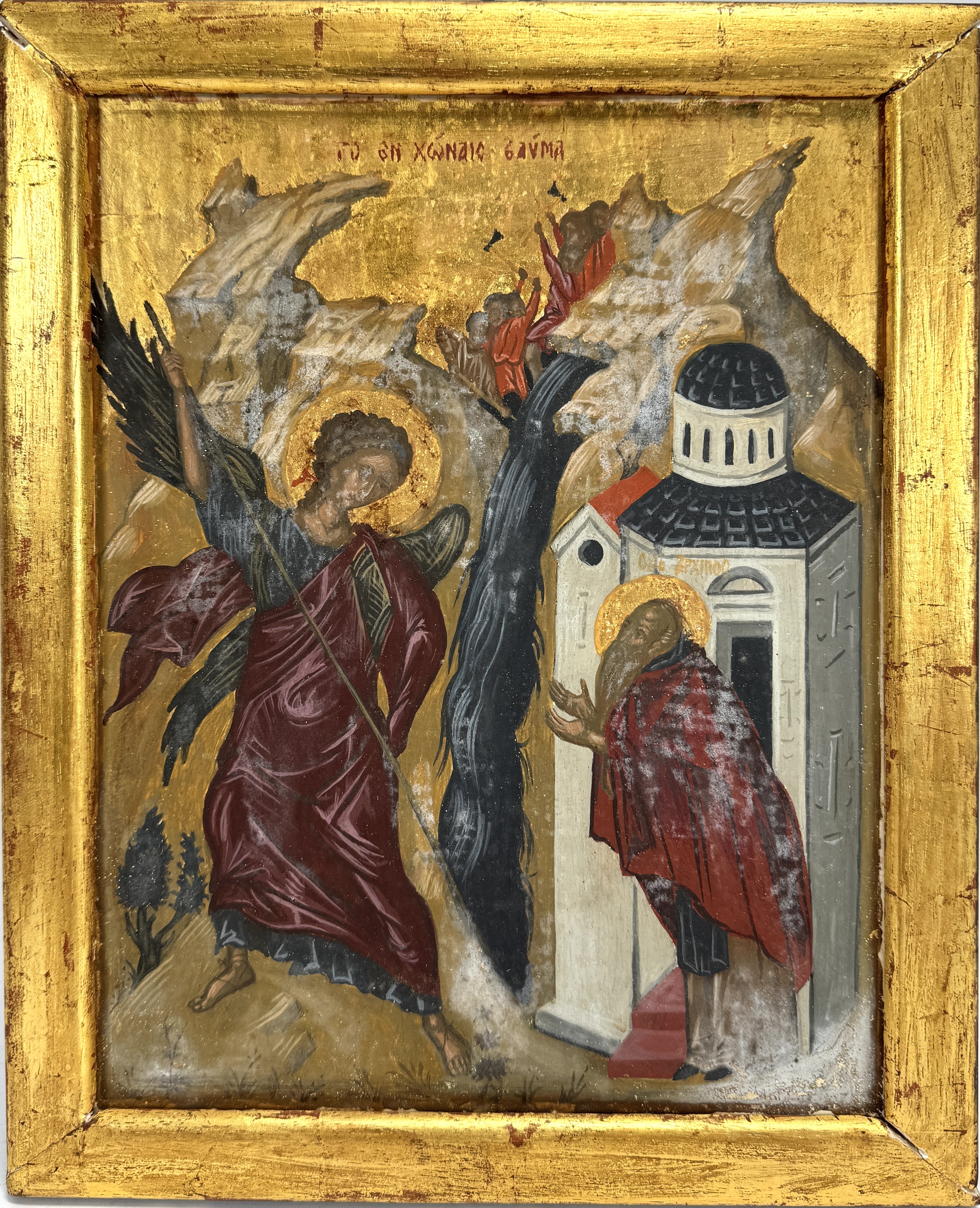Een icoon in de stijl van de orthodoxe iconografie, omstreeks midden 20e eeuw, is uitgevoerd in tempera en goudverf op een houten paneel en toont een religieus tafereel met de aartsengel Michaël en de heilige Archippos, bekend als 'Het wonder van Chonae'. Aartsengel Michaël verandert de stroming van het rivierwater dat door de heidense Hellenizontes naar zijn kerk werd geleid. De monnik Archippos rechts toont zijn dankbaarheid middels een gebedshouding. De icoon zelf beoordelen? Je bent welkom op onze kijkdagen op 29, 30 en 31 augustus! |