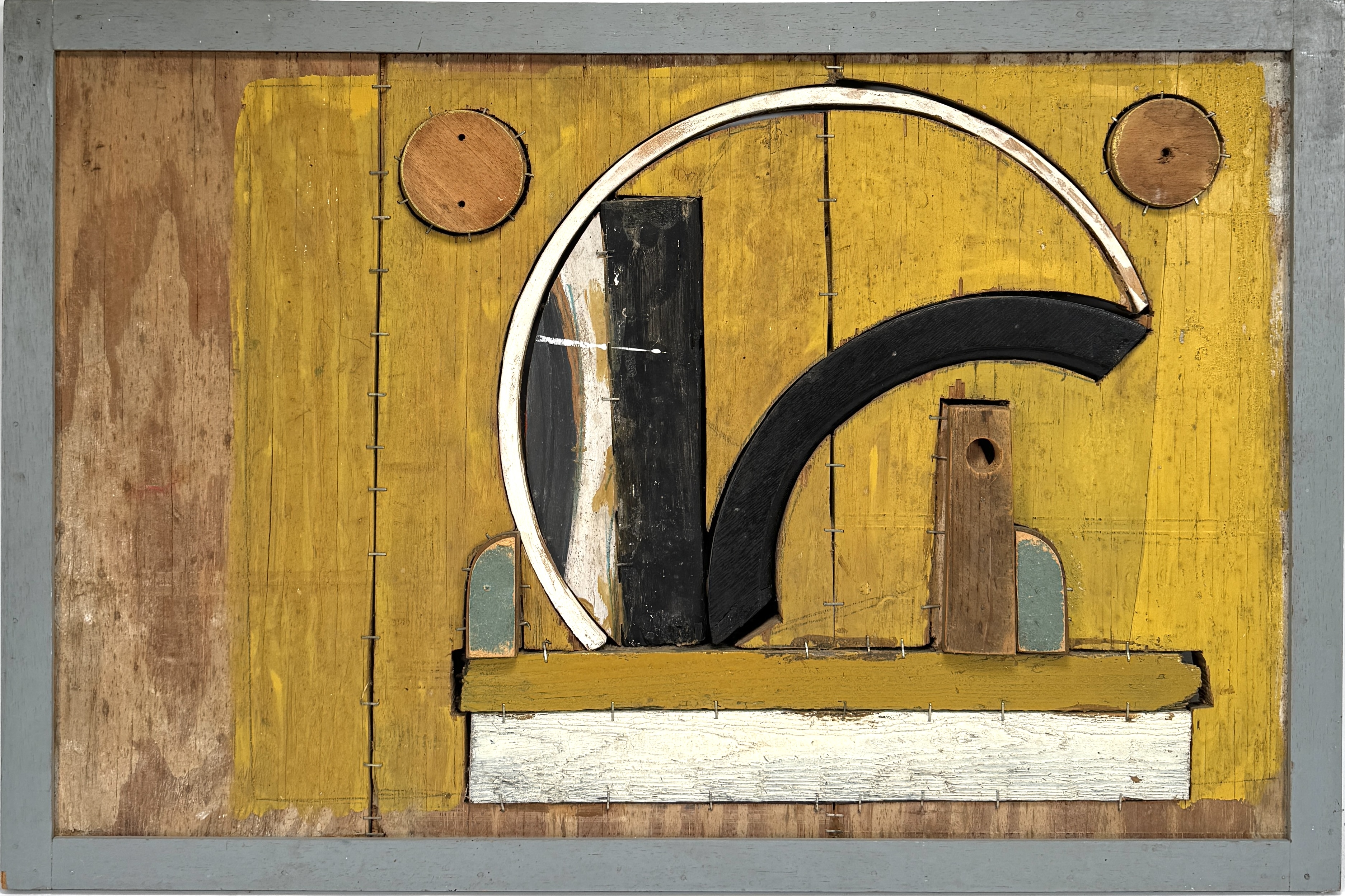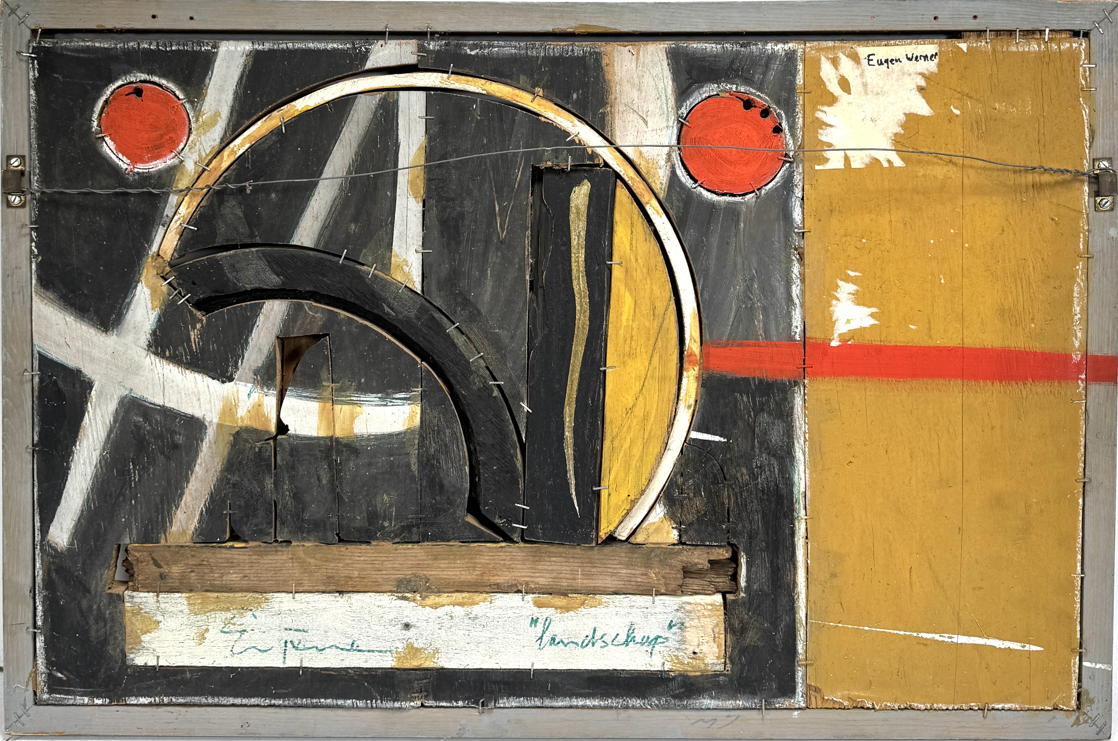 Dubbelzijdig abstract-constructivistische collage van hout, tweede helft 20e eeuw. Gemengde techniek: geschilderde houten elementen in acryl, geassembleerd met nieten op paneel met grijs houten rand. Voorzijde met geometrische boogvormen; keerzijde eveneens uitgewerkt met cirkels en rood accent. Onderrand gesigneerd (onleesbaar) en getiteld “landschap”, daarnaast rechtsboven naaminscriptie “Eugen Werner”. Zeker zijn van deelname? Plaats vanaf 22 augustus een schriftelijk bod online! |