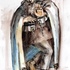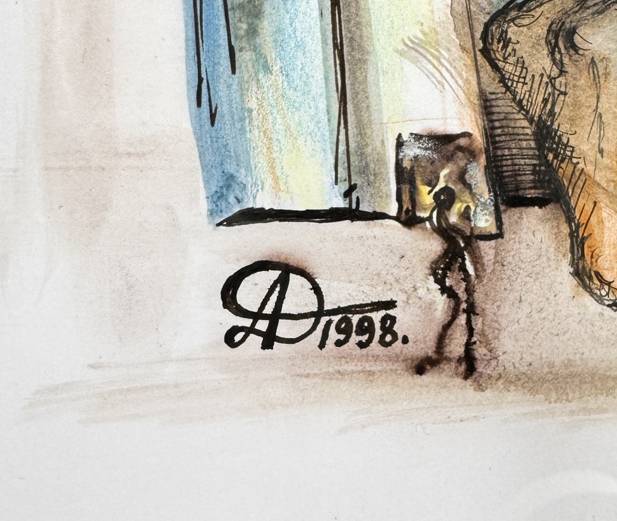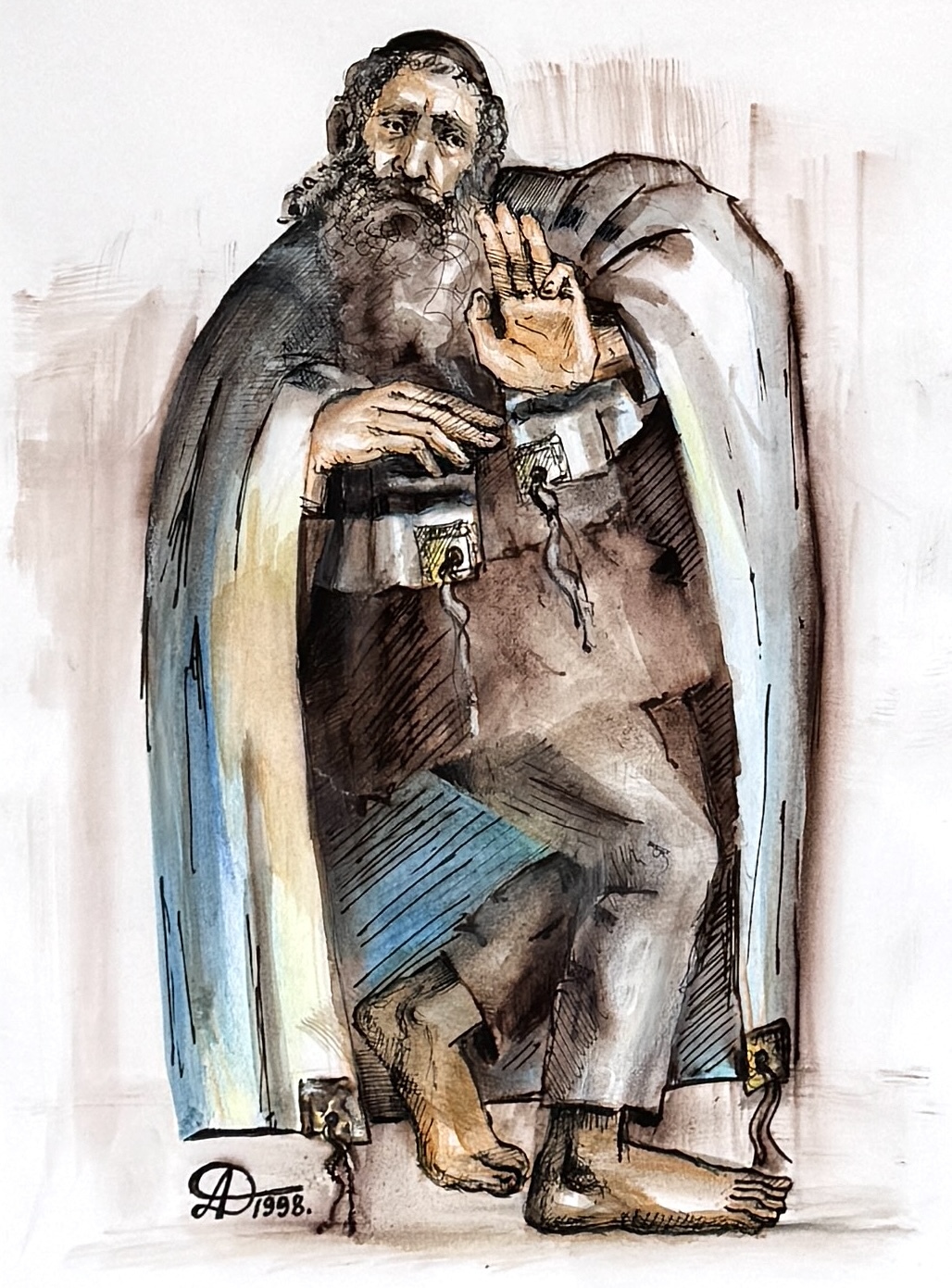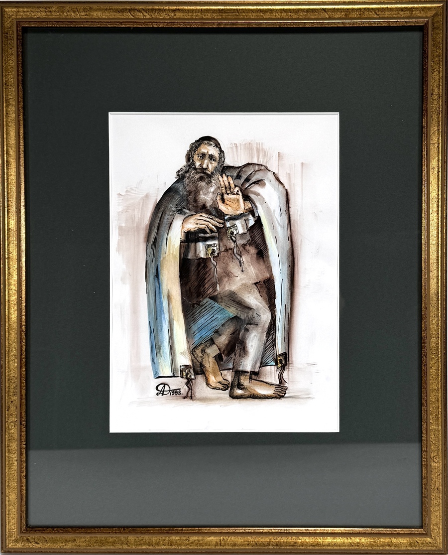Expressieve tekening op papier van een man met religieuze uitstraling, uitgevoerd in inkt en aquarel. Linksonder gesigneerd met monogram AD en gedateerd 1998. Gemonteerd in passe-partout en goudkleurige lijst achter glas.
