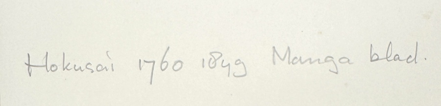 Japanse houtsnede toegeschreven aan Katsushika Hokusai (1760–1849), uitgevoerd in zwart op papier, circa begin 19e eeuw. De prent toont een vrouwelijk figuur en een draak in een dramatische compositie, gedrukt in de stijl van de manga-series. Ongesigneerd, met potloodannotatie op de achterzijde. De techniek betreft een fijn uitgesneden zwart-wit houtsnede op papier in ukiyo-e stijl. Kom langs tijdens de kijkdagen (29 t/m 31 augustus) en ontdek deze Japanse houtsnede zelf! |