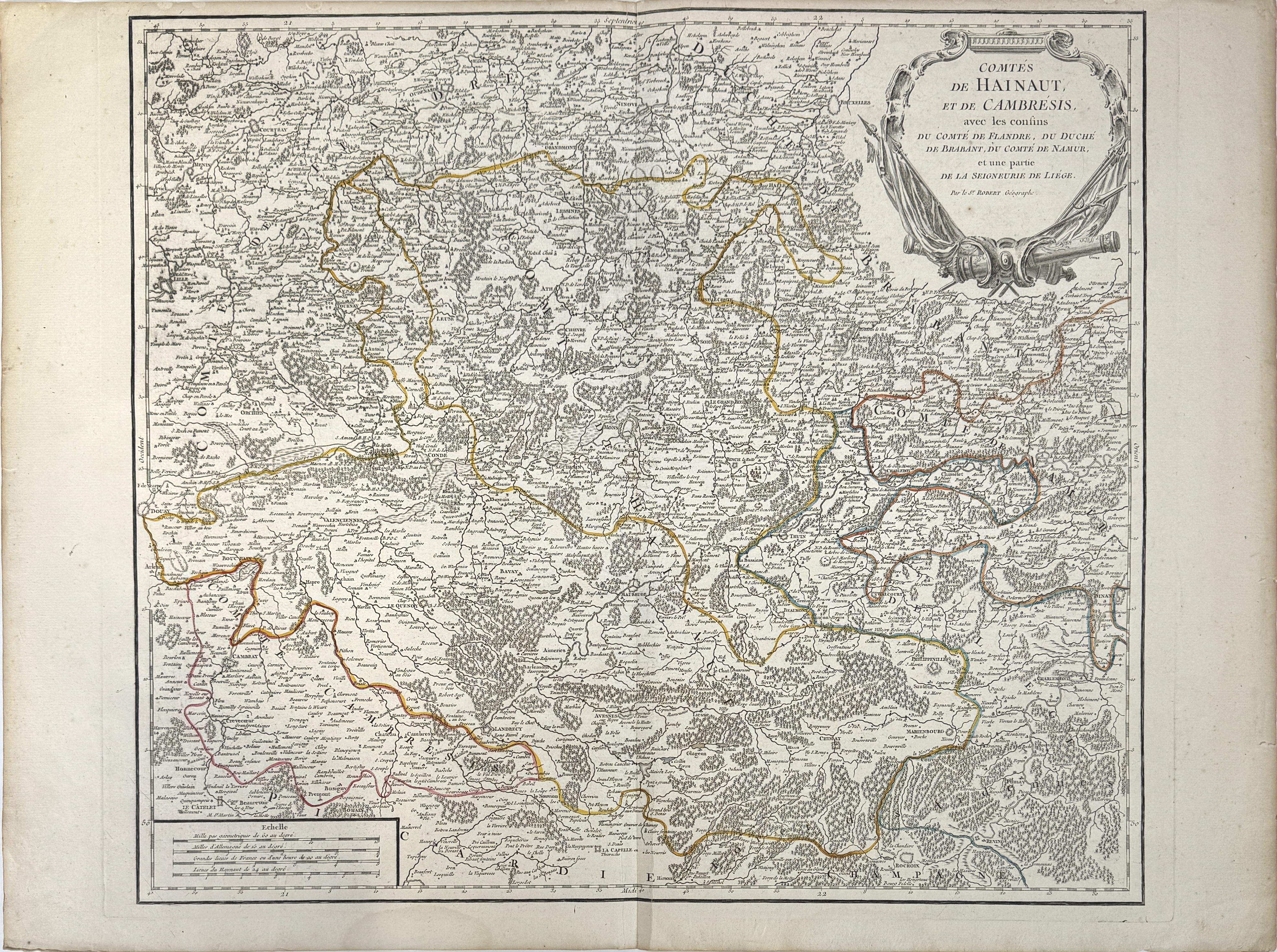 Antieke kaart van Gilles Robert de Vaugondy (1688–1766), uitgevoerd in kopergravure met handmatige contourinkleuring, gedateerd 1754. Titel “Comtés de Hainaut et de Cambrésis” met omliggende gebieden als Vlaanderen, Brabant en Luik. Uit het Atlas Universel. Met gegraveerde titelcartouche, middenvouw en paginanummer “60” recto. Zeker zijn van deelname? Plaats vanaf 22 augustus een schriftelijk bod online! |