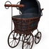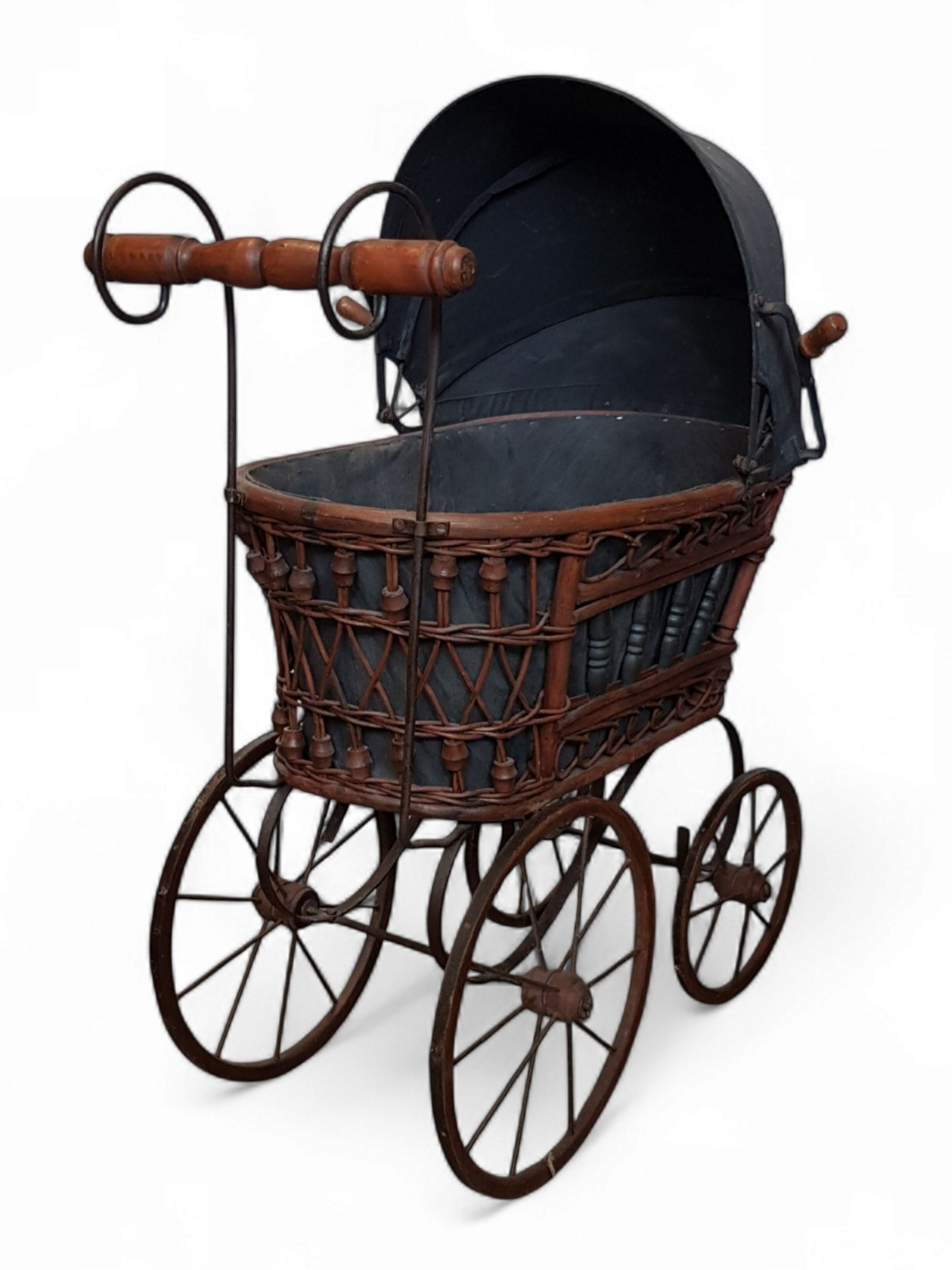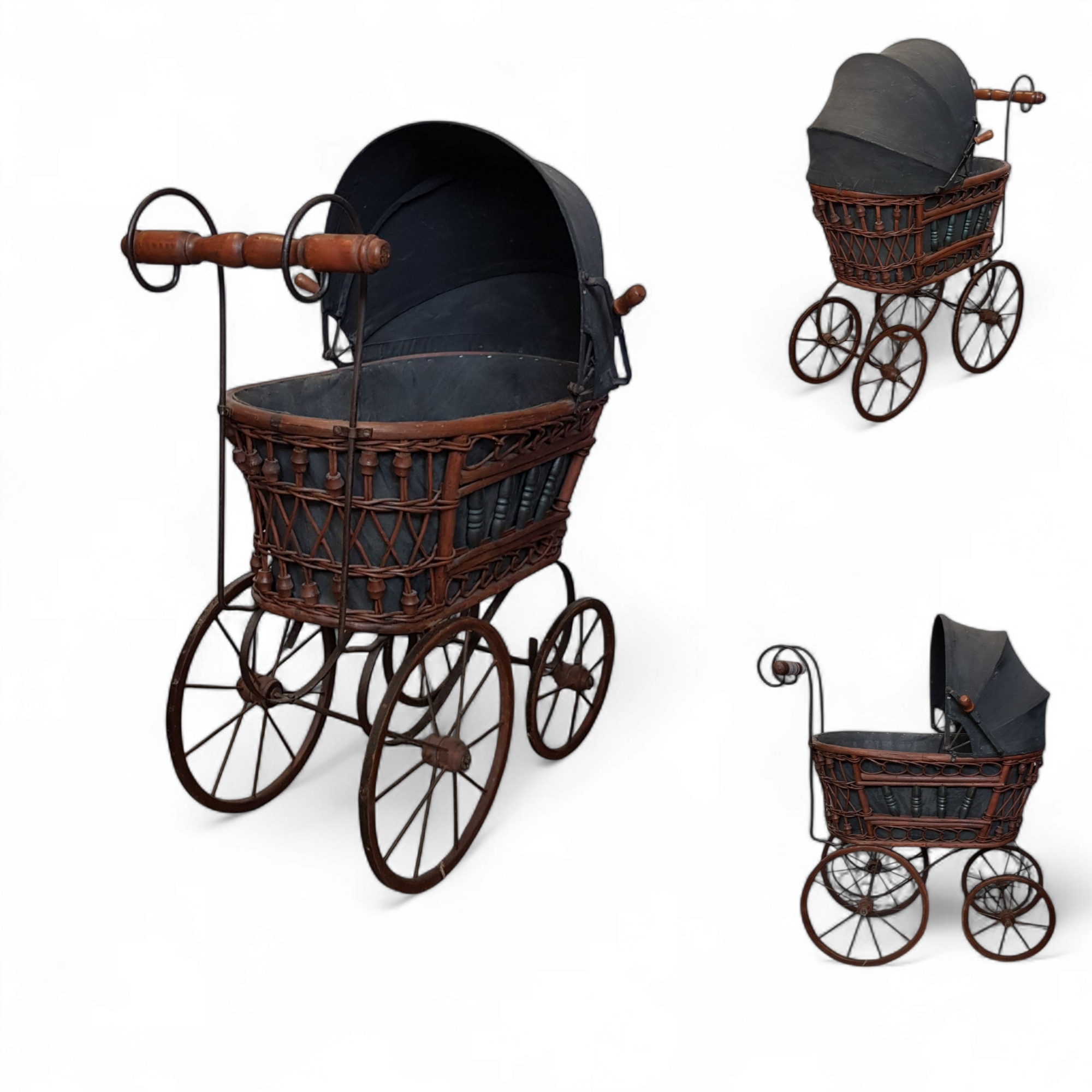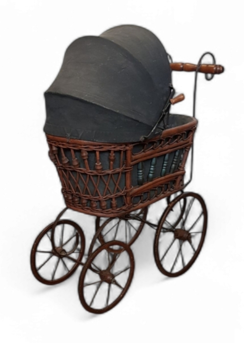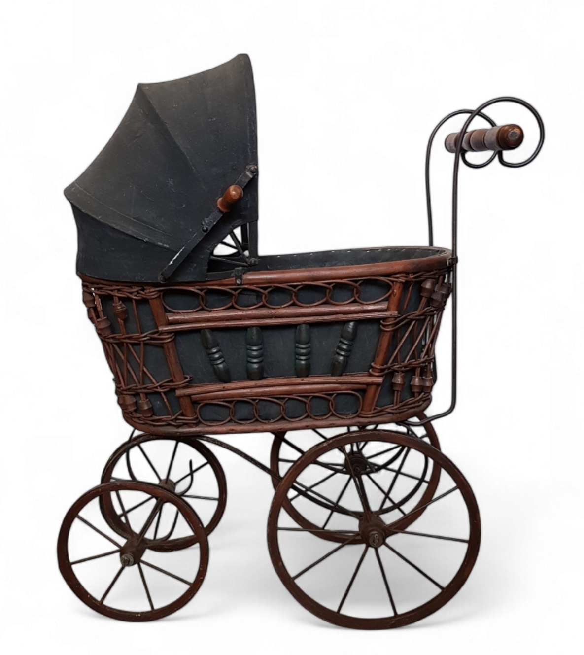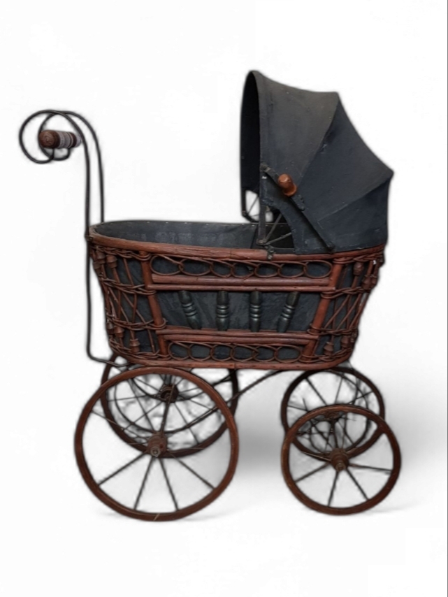 Poppenwagen uit de late 19e of vroege 20e eeuw, vervaardigd uit hout, riet en metaal met een vaste kap van zwart textiel. De constructie toont handgevlochten rietwerk, houten details en een metalen frame met spaakwielen. Opvallend zijn de ronde vormen van de duwstang en het open vlechtwerk van de bak. De kinderwagen illustreert het design en gebruiksdoel van vroege kinderwagens. Klaar om te bieden? Registreer je nu en doe mee aan de veiling! |