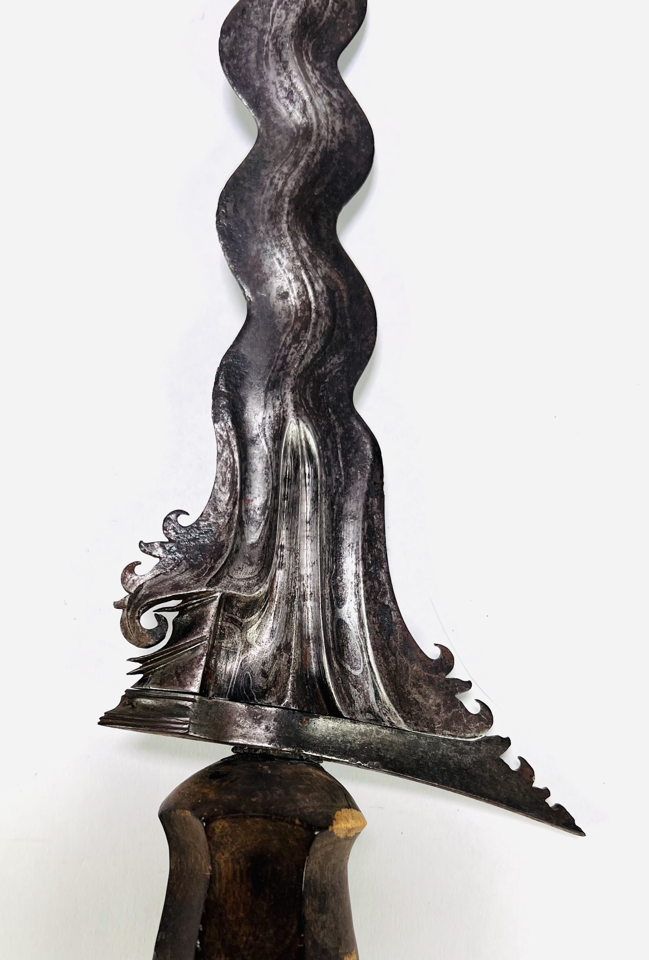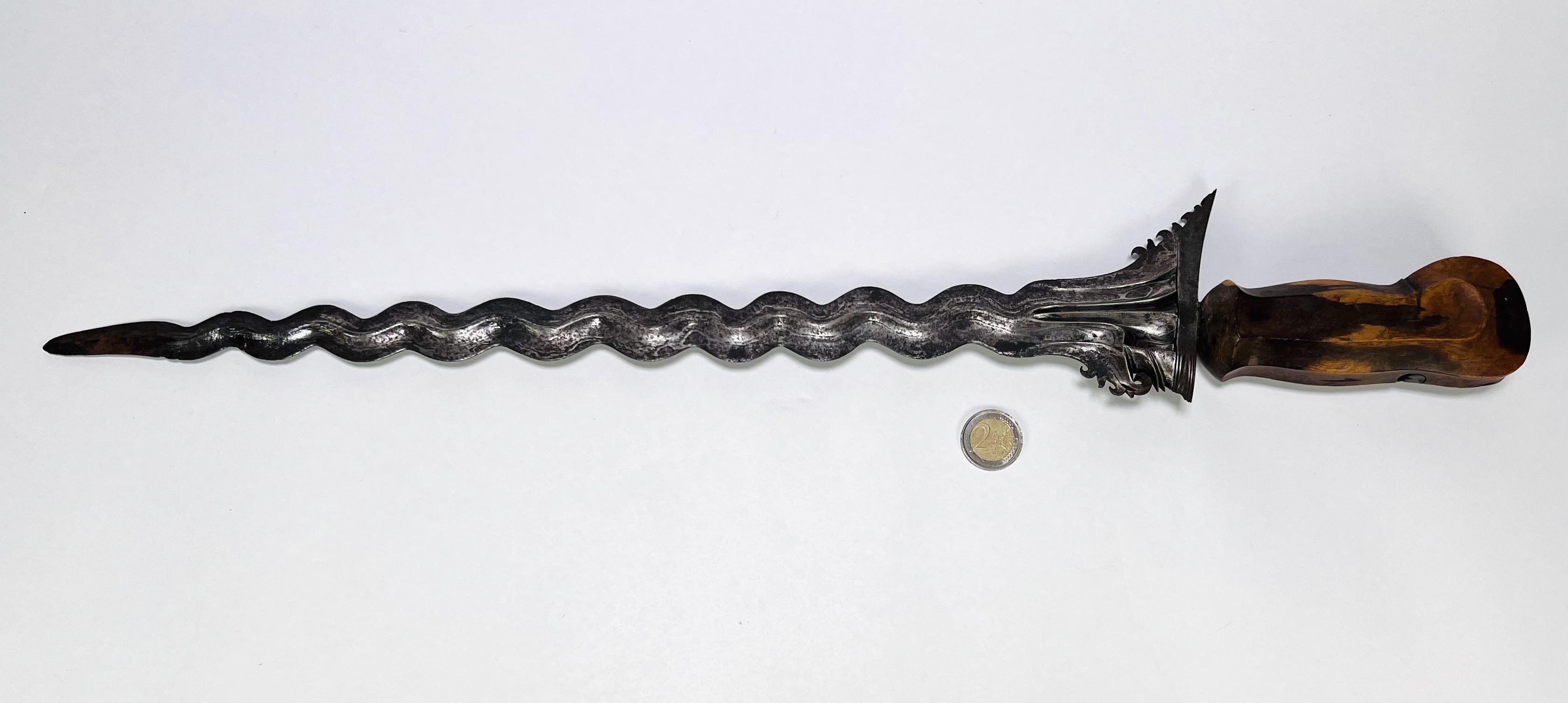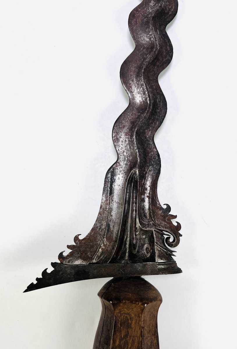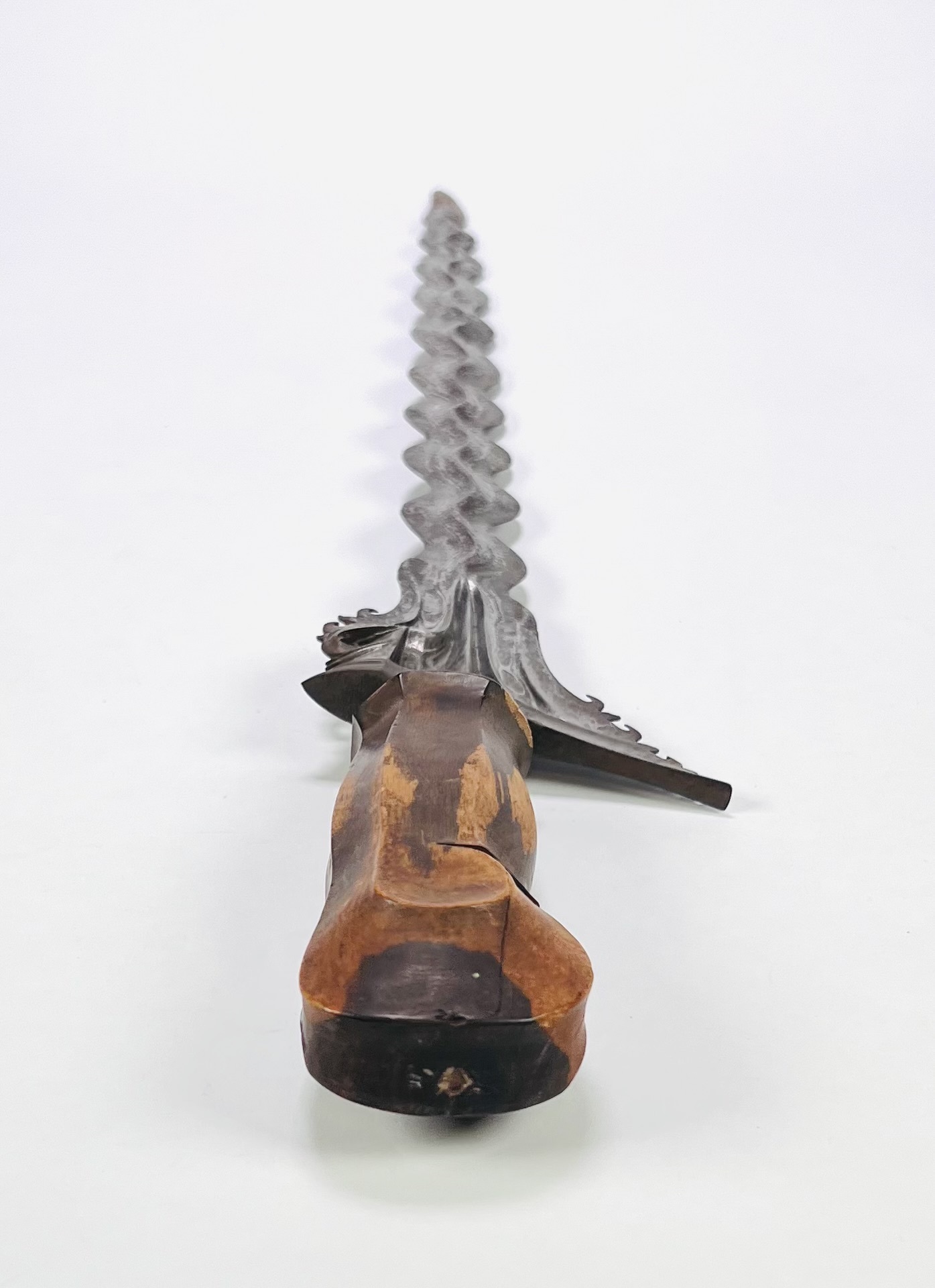 Traditionele Balinese keris, begin 20e eeuw, uitgevoerd in gepatroneerd smeedstaal met houten greep. Het lemmet met eenentwintig luk toont een zichtbaar pamor patroon en is voorzien van een rijk gedetailleerde ganja met decoratieve uitsteeksels. De greep is hoekig en gesneden uit hout. Ceremonieel wapen uit de Balinese culturele context. Kom langs tijdens de kijkdagen en ontdek dit object zelf! |