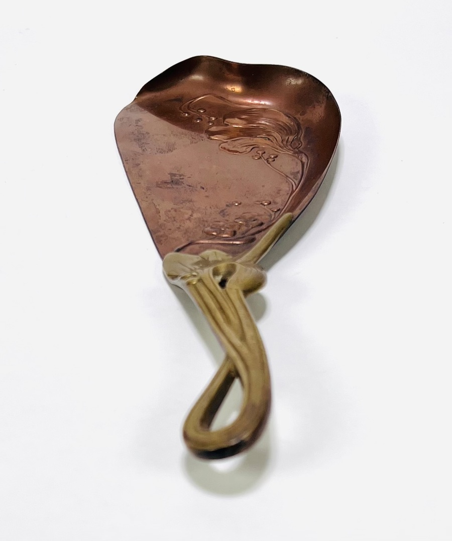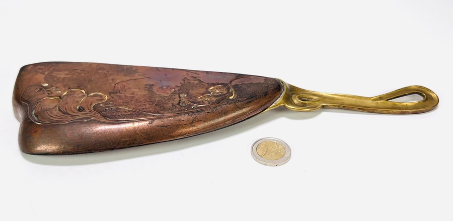 Een kruimelbakje uit de Art Nouveau periode, circa 1900. Het object is vervaardigd uit koper en met een messing handvat. Het koperen blad is gedecoreerd met een bloem en bessen reliëf, typerend voor de stijl rond 1900. De steel heeft een organische vorm die doet denken aan een bloemstengel. Geïnteresseerd? Bezoek onze kijkdagen op 29, 30 of 31 augustus van 11:00 tot 17:00 uur! |