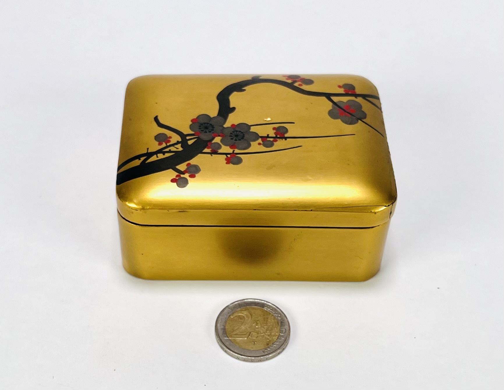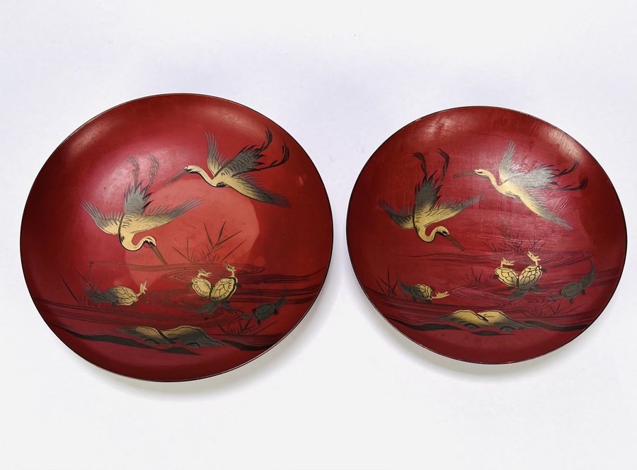 Set bestaande uit twee Japanse roodgelakte offerschalen met goud- en zwartdecor van kraanvogels en schildpadden, en een rechthoekige goudkleurige lakdoos met bloesemtak. Uitgevoerd in hout met urushi-laktechniek, deels gegraveerd en handbeschilderd. In traditionele Japanse stijl, niet gesigneerd. Midden 20e eeuw. Kom langs tijdens de kijkdagen (29 t/m 31 augustus) en ontdek deze objecten zelf! |