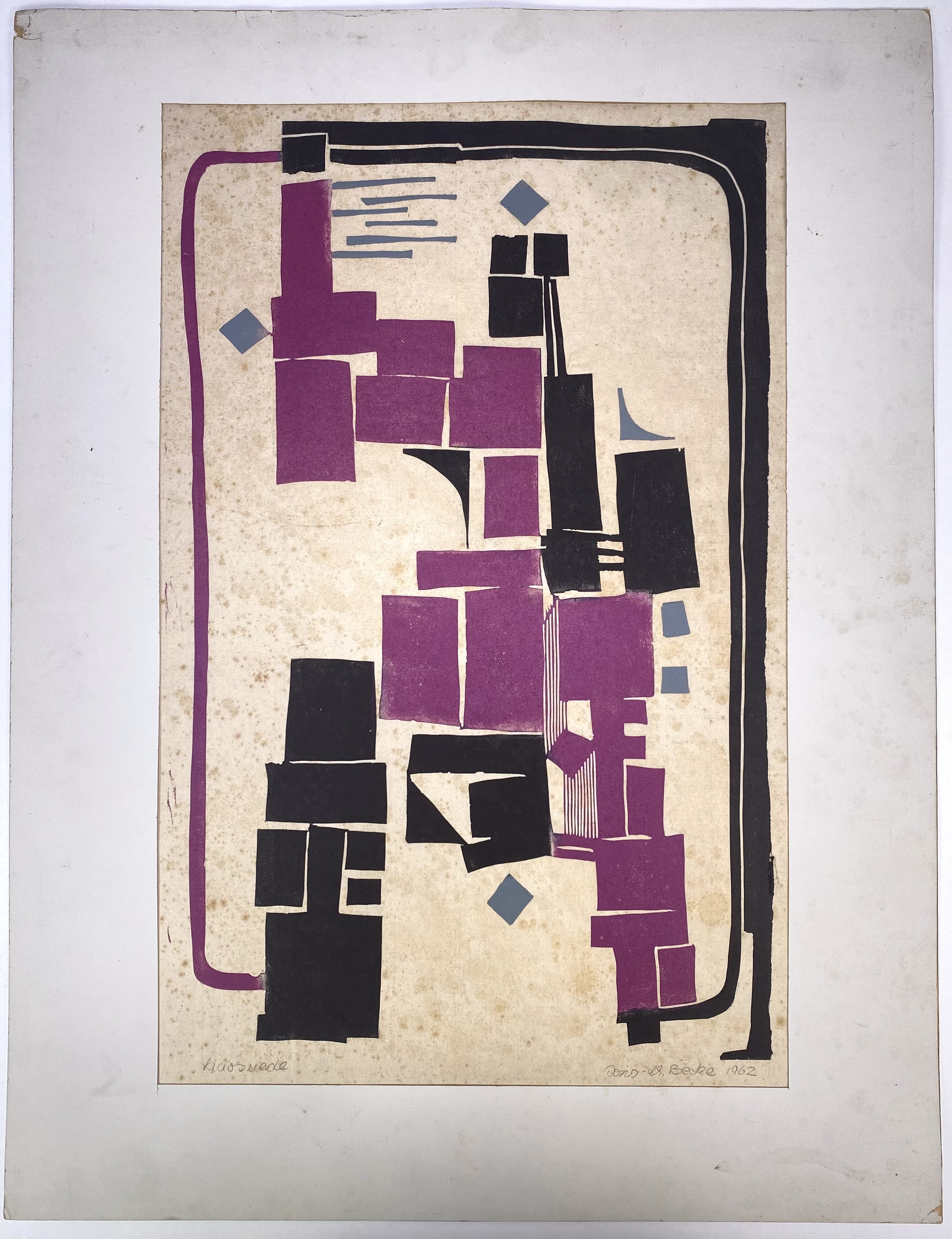 Linosnede van Doris Becke (1940), gesigneerd en gedateerd rechtsonder “Doris - Becke 1962”. Abstract geometrische compositie in zwart, paars en grijstonen op wit papier, gemonteerd op karton. Het werk toont een gestructureerde opbouw van vlakken en lijnen in modernistische stijl. Wil je direct deelnemen? Plaats vanaf 22 augustus alvast een schriftelijk bod via onze website! |