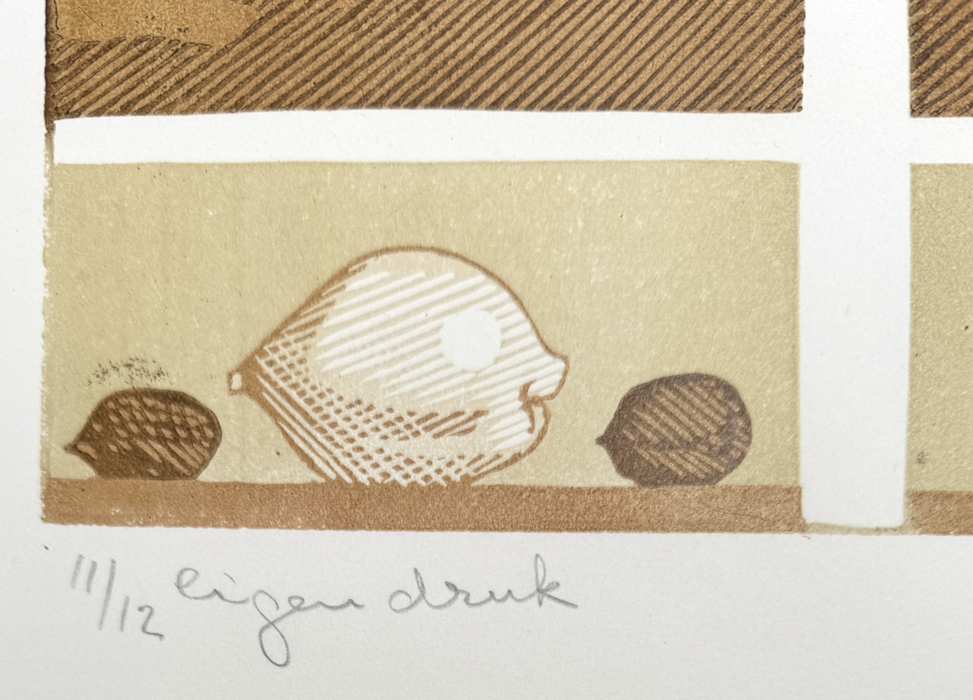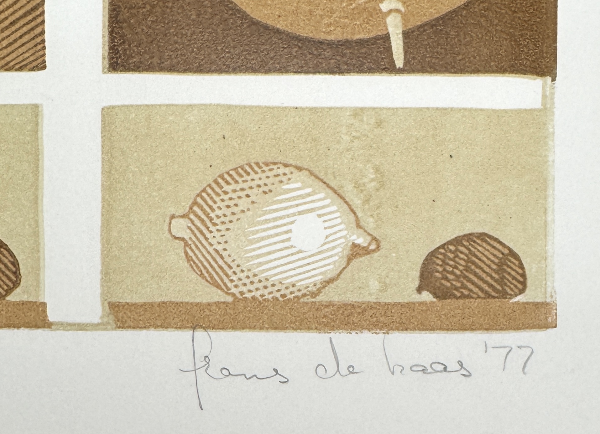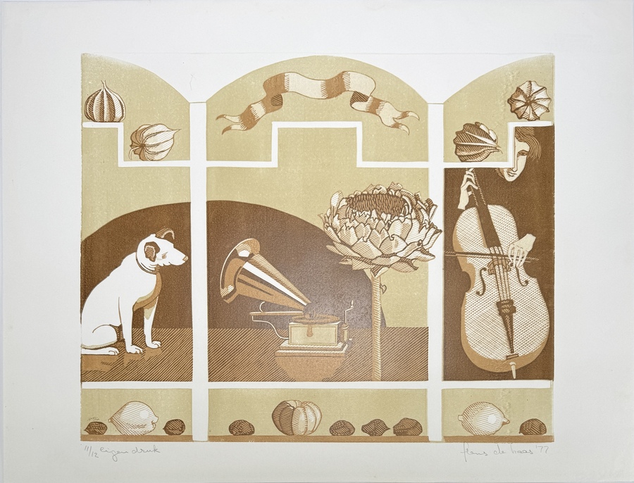 Litho op papier van Frans de Haas (1934–2007), uitgevoerd in 1977. De compositie toont een bloem, His Masters Voice en een cellospeler in een grafische vlakverdeling. Uitgevoerd in bruin- en beigekleuren. Linksonder in potlood genummerd 11/12 en aangeduid eigen druk, rechtsonder met potlood gesigneerd en gedateerd “frans de haas ’77”. Geïnteresseerd? Bezoek onze kijkdagen op 29, 30 of 31 augustus van 11:00 tot 17:00 uur! |