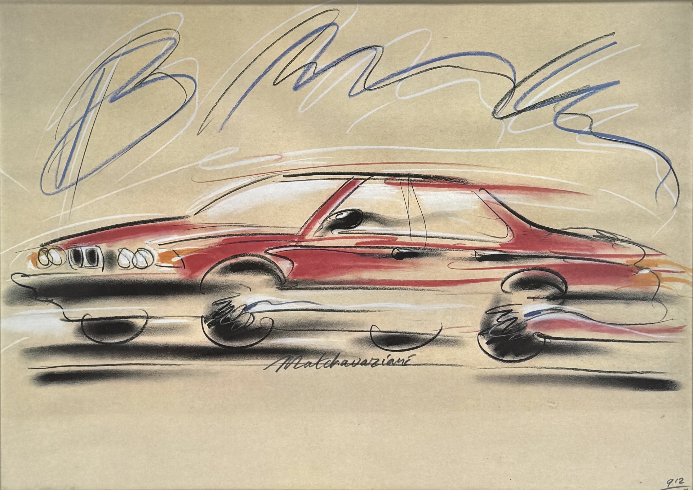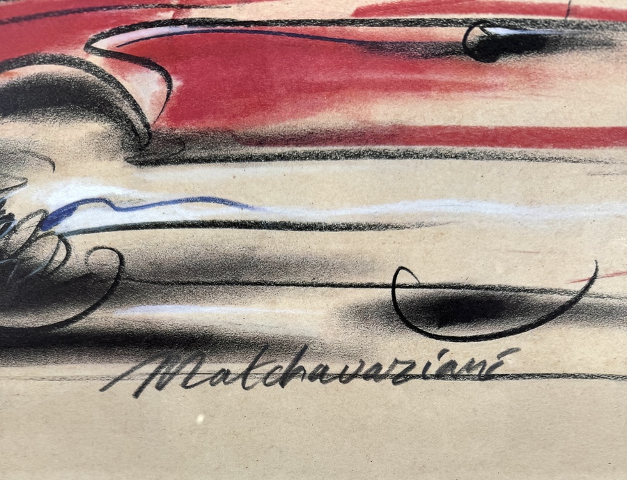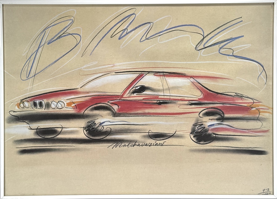 Werk op papier van Henri Matchavariani (1939–2011), uitgevoerd in gemengde techniek met krijt en pastel op papier. Horizontale voorstelling van een rode BMW in beweging, weergegeven met expressieve lijnen en vereenvoudigde vormgeving. Rechtsonder gesigneerd en rechtsonder oplagenummer 912/1000. Afkomstig uit een reeks grafisch werk uit eind 20e eeuw met focus op autoschetsen en snelheid. Zelf beoordelen? Je bent welkom op onze kijkdagen op 29, 30 en 31 augustus! |
