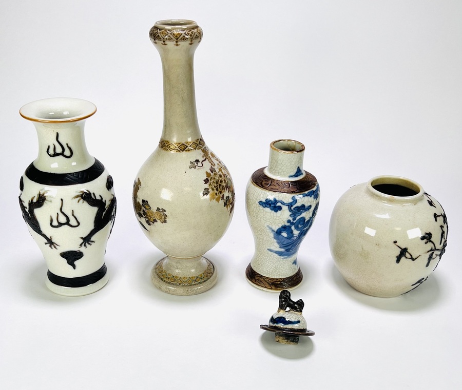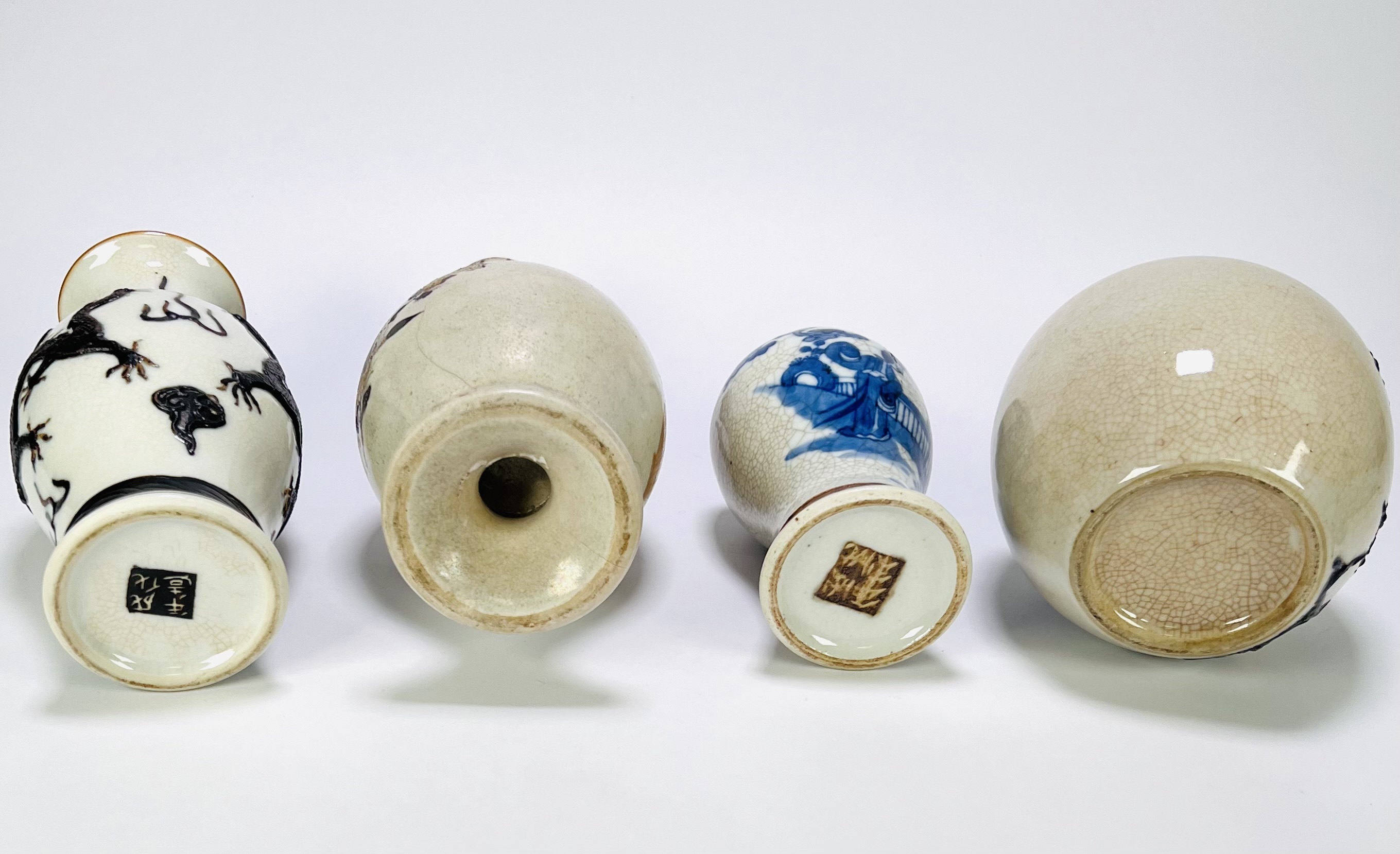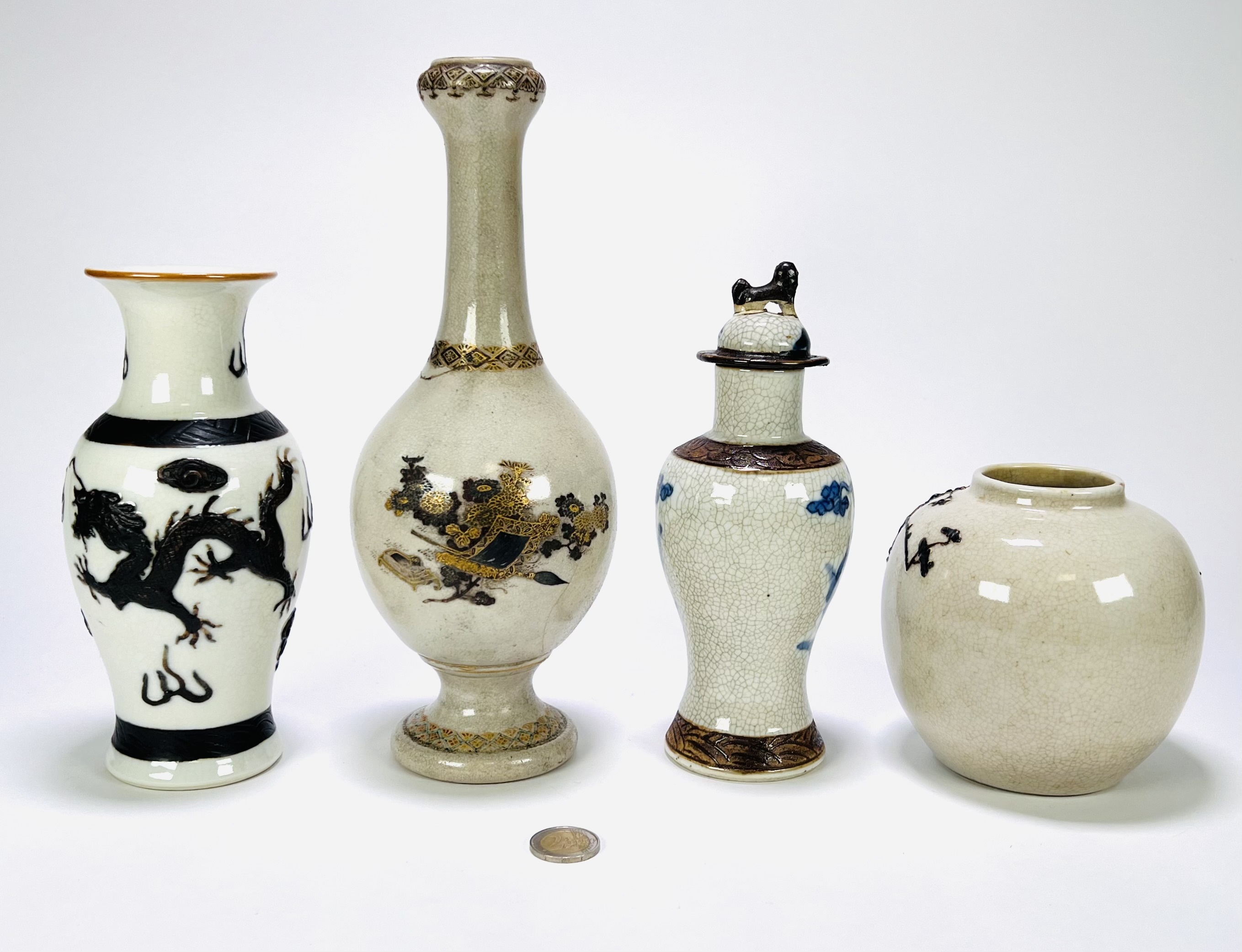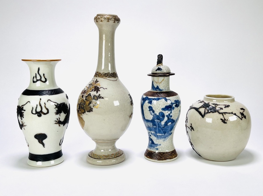 Convoluut porseleinen vazen uit omstreeks eind 19e eeuw tot begin 20e eeuw, uitgevoerd in craqueléglazuur met handbeschilderde decoraties en zwarte reliëfversieringen. Twee vazen zijn onderaan gemerkt met Chinese karakters. Wil je direct deelnemen? Plaats vanaf 22 augustus alvast een schriftelijk bod via onze website! |