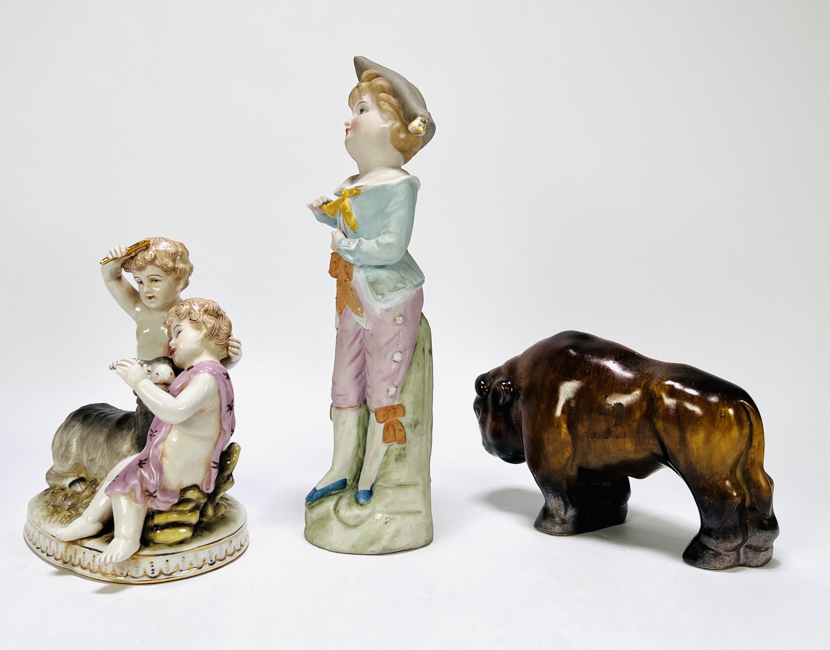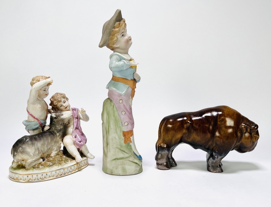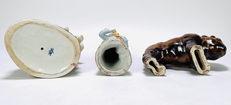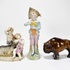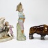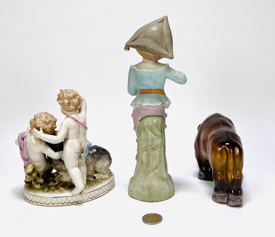Drie porseleinen beelden, daterend uit eind 19e eeuw – begin 20e eeuw (circa 1880-1920); putti en een lam, een staande jongeling in 18e-eeuwse kleding en een bizon. De beeldjes zijn handgeschilderd, een beeldje is gemerkt met een blauwe stempel "R" met kroon en ster. Kom langs tijdens de kijkdagen (29 t/m 31 augustus) en ontdek deze beeldjes zelf! |