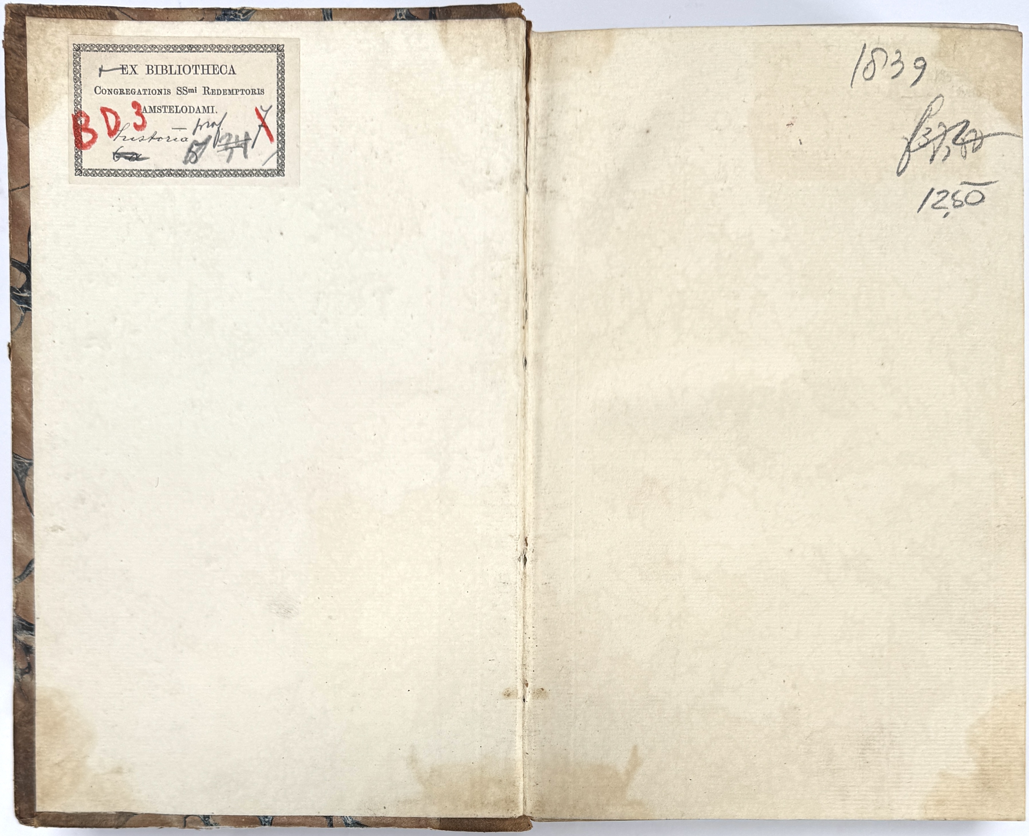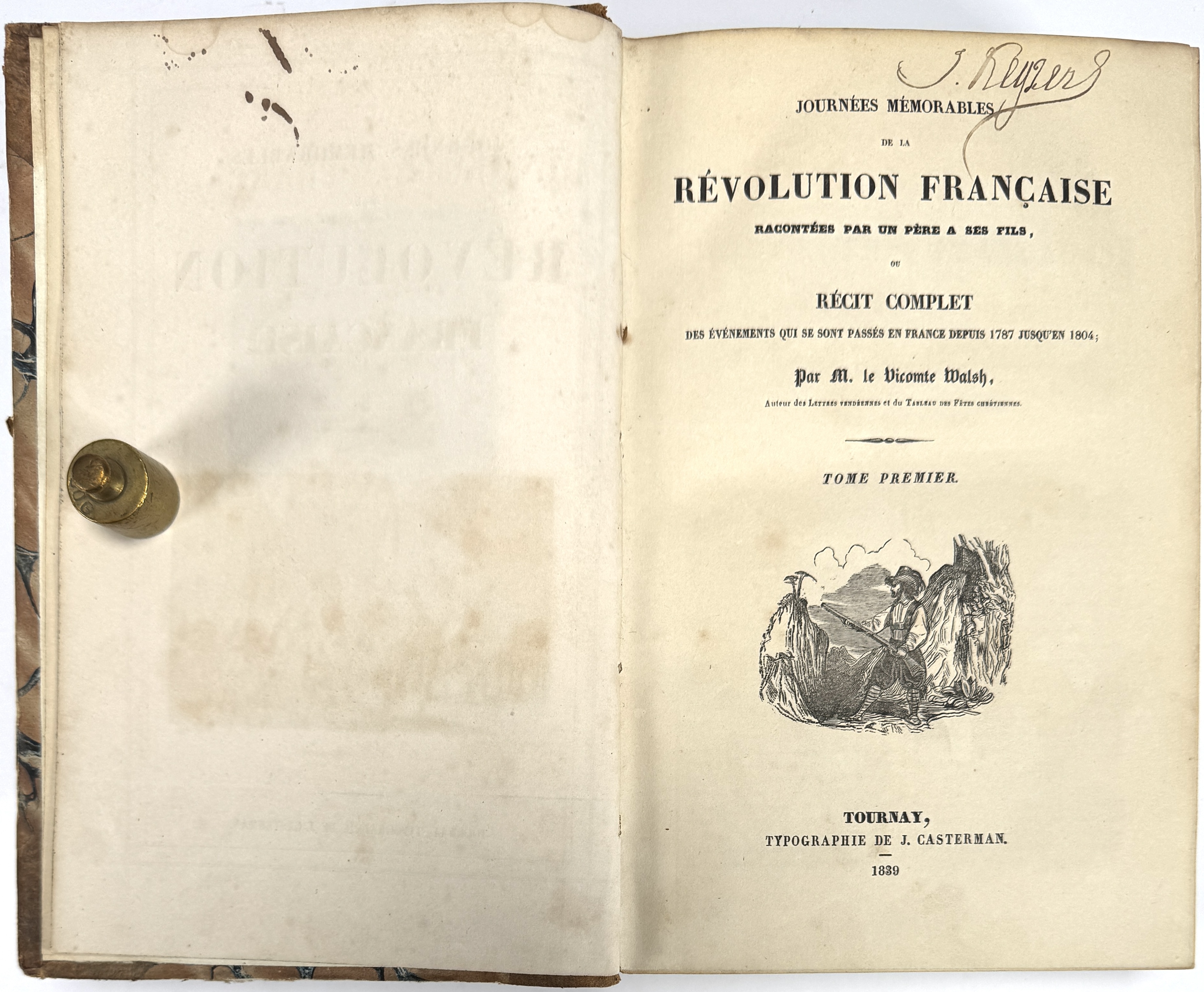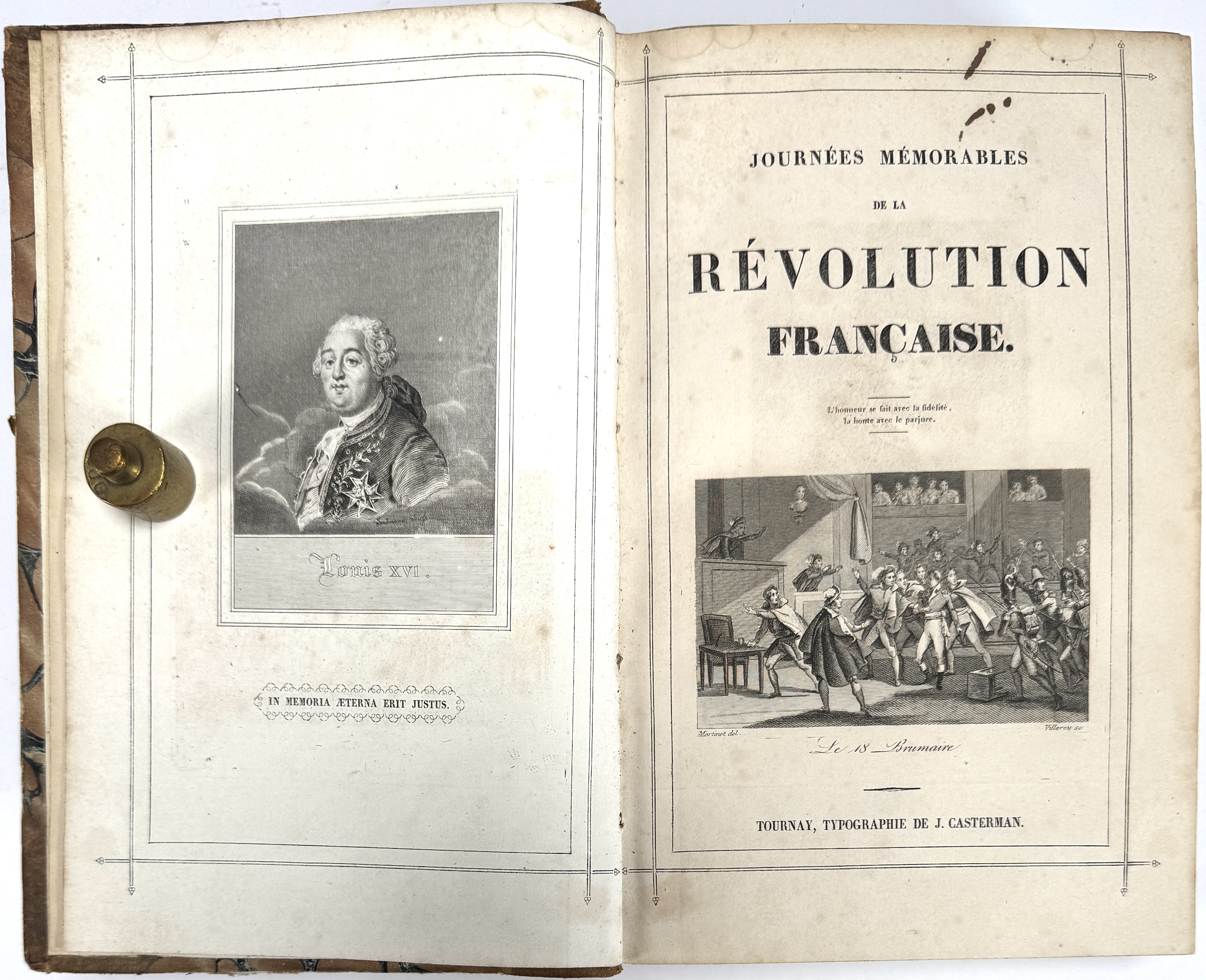 Franstalig boek getiteld Journées Mémorables de la Révolution Française door Vicomte Walsh (1798–1860), gedrukt in 1839 te Tournai. Uitgevoerd in papier met gegraveerde illustraties en originele halfleren band met gemarmerde platten. Met patriottische beeldtaal, portret van Louis XVI, toneelgravure “Le 18 Brumaire”. Ex libris “Congregatio SSmi Redemptoris”. Bevat typografie, kopergravures en eigentijdse annotaties. Registreer nu en bied eenvoudig online mee op dit boek! |