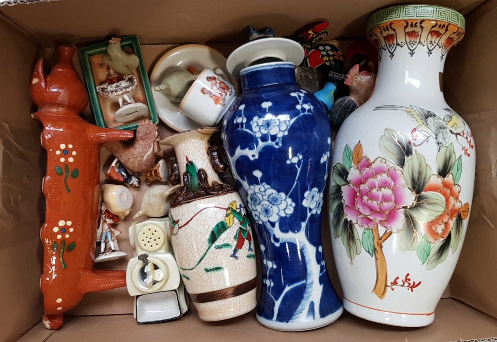 Lot porselein en aardewerk omstreeks 20e eeuw, bestaande uit meerdere vazen, beeldjes en gebruiksvoorwerpen. De collectie toont een variatie in decoratie met onder meer polychrome schildering, craqueléglazuur en Aziatisch geïnspireerde motieven. Wil je dit in het echt bekijken? Kom naar de kijkdagen op 29, 30 en 31 augustus! |