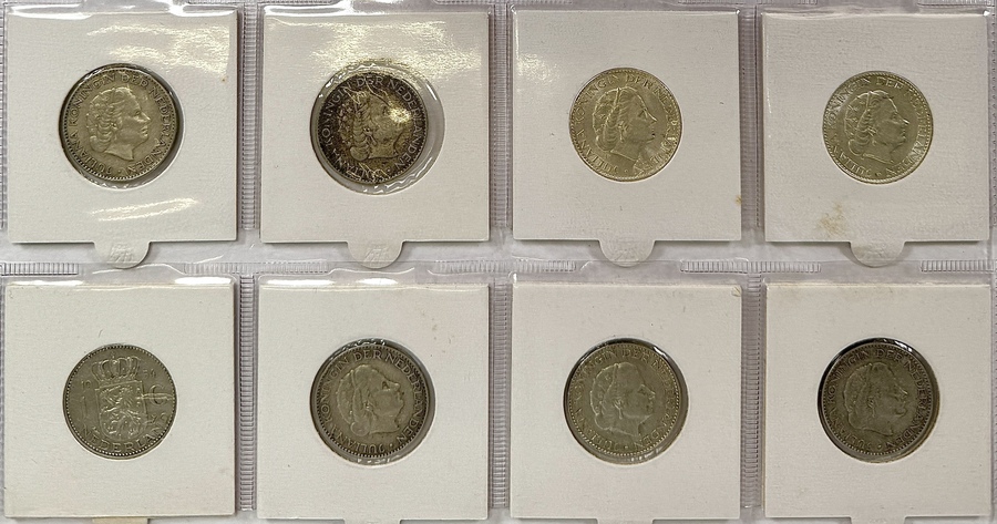 Set van acht Nederlandse guldens uit 1954–1964 met portret van koningin Juliana (1909–2004), uitgevoerd in zilver en vervaardigd via slagtechniek. De realistische stijl toont haar profiel met opschrift, terwijl de keerzijde het Nederlandse wapen met jaartal en waarde “1 G” weergeeft. Geïnteresseerd? Bezoek onze kijkdagen voor een persoonlijke bezichtiging! |