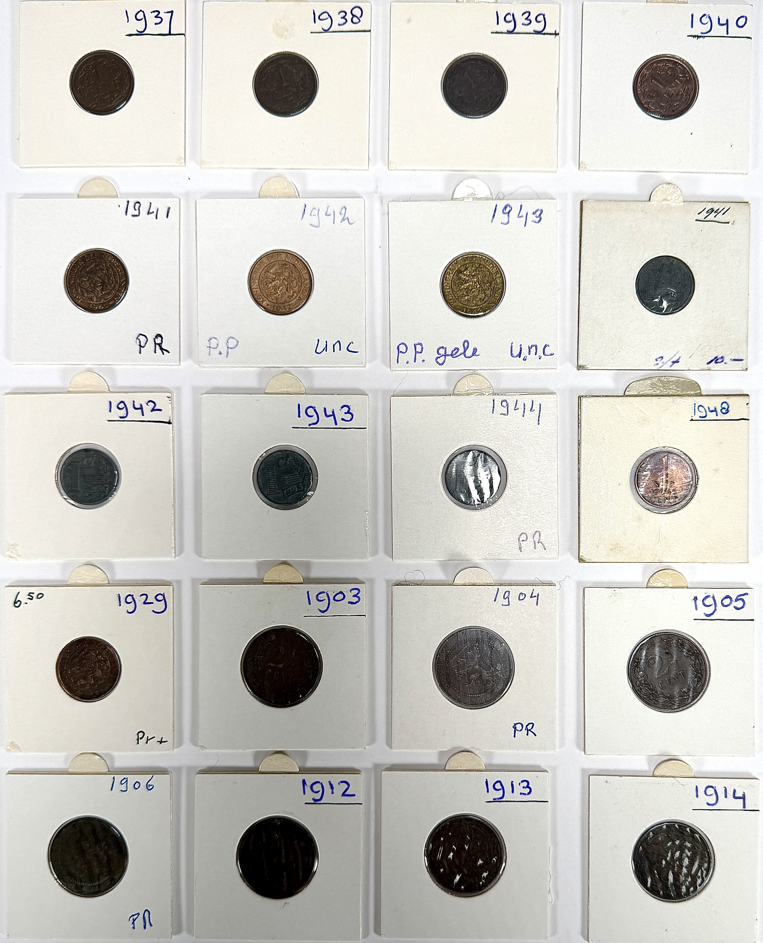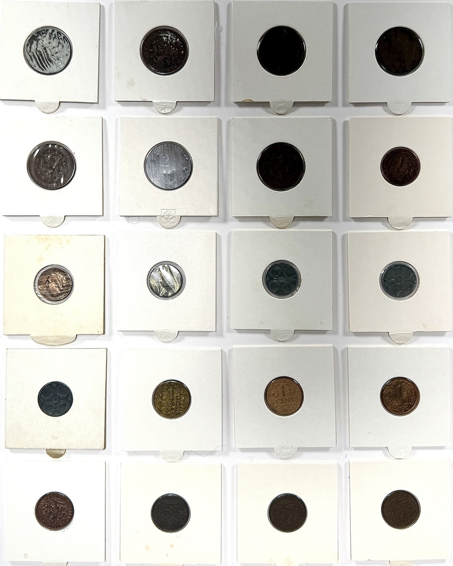 Een kavel van twintig Nederlandse centen uit de periode 1903-1948. De munten zijn vervaardigd van koper en messing door middel van muntpersing. De ontwerpen, waaronder van Pier Pander en J.C. Wienecke, tonen portretten van Koningin Wilhelmina en Koningin Emma. De munten, in verschillende jaargangen, zijn opgeborgen in kartonnen houders waarop de datering en enkele classificatie handgeschreven zijn. Klaar om te bieden? Registreer je nu en doe mee aan de veiling! |