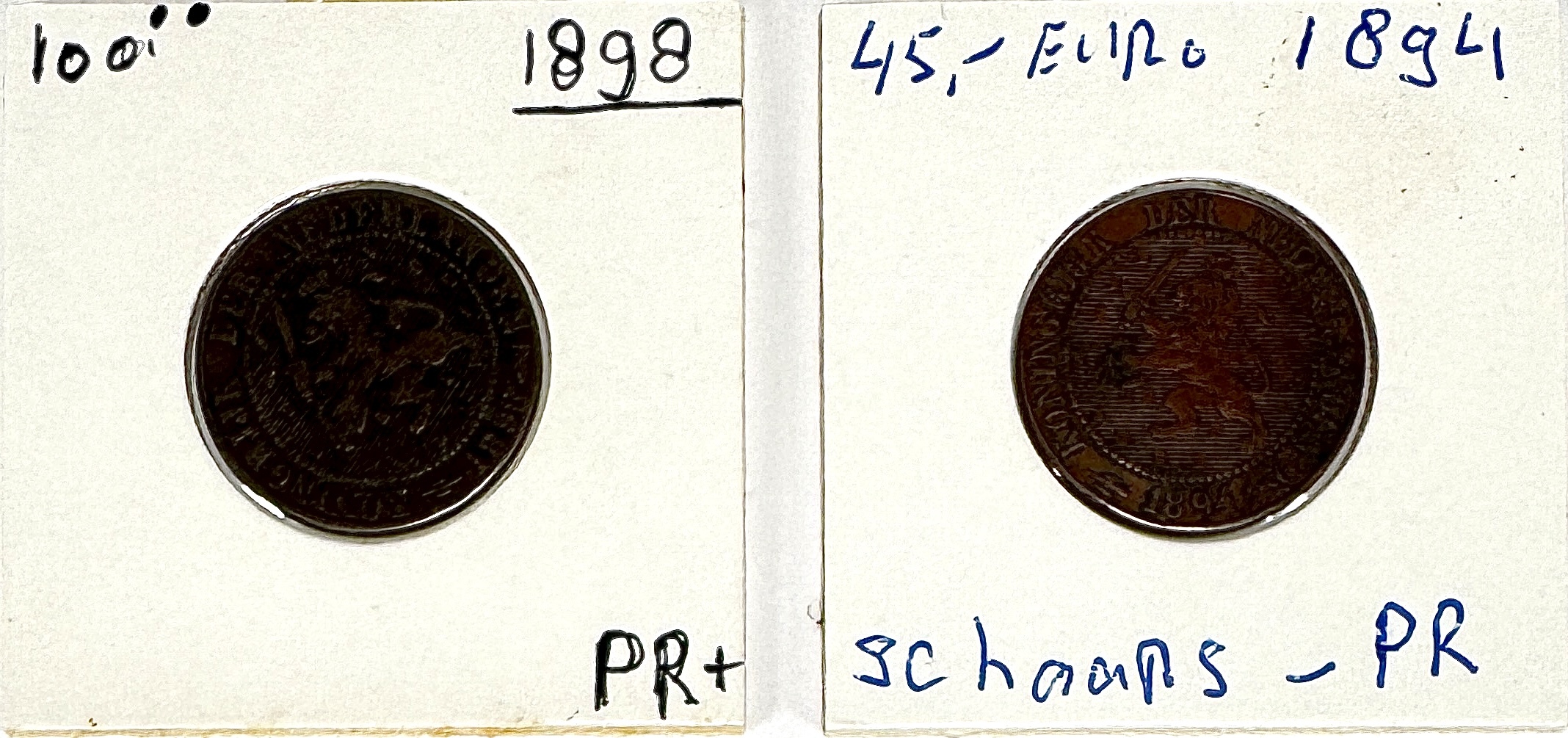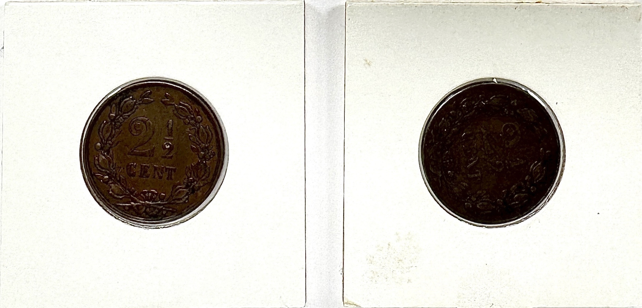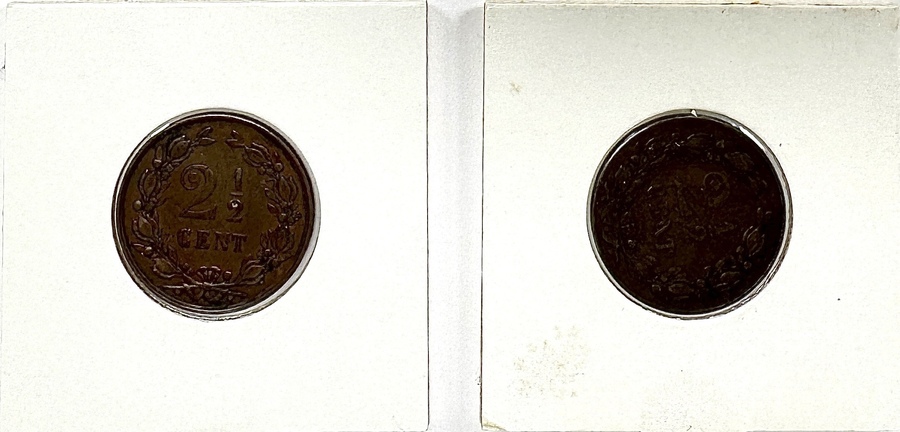 Set van twee bronzen tweeëneenhalf cent munten van het Koninkrijk der Nederlanden, jaartallen 1894 en 1898. Eind negentiende-eeuwse rijksmuntstijl met lauwerkrans rond “2½ CENT” en een gekroond rijkswapen met leeuw en zwaard, omschrift “KONINGRIJK DER NEDERLANDEN”. Machinaal geslagen, rand glad. Uitgegeven door de Rijksmunt te Utrecht. Zeker zijn van deelname? Plaats vanaf 22 augustus een schriftelijk bod online! |