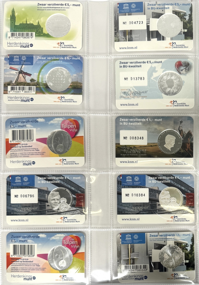 Een kavel van tien Nederlandse verzilverde herdenkingsmunten van €5. De munten, geslagen in de jaren 2013-2015 in Prooflike en Brilliant Uncirculated kwaliteit, zijn in hun originele verpakkingen van de Koninklijke Nederlandse Munt. De ontwerpen van onder meer Erik van de Veen en Rini Hurkmans herdenken onder andere de Van Nellefabriek, het Vredespaleis, de molen en het Rietveld Schröderhuis. Klaar om te bieden? Registreer je nu en doe mee aan de veiling! |
