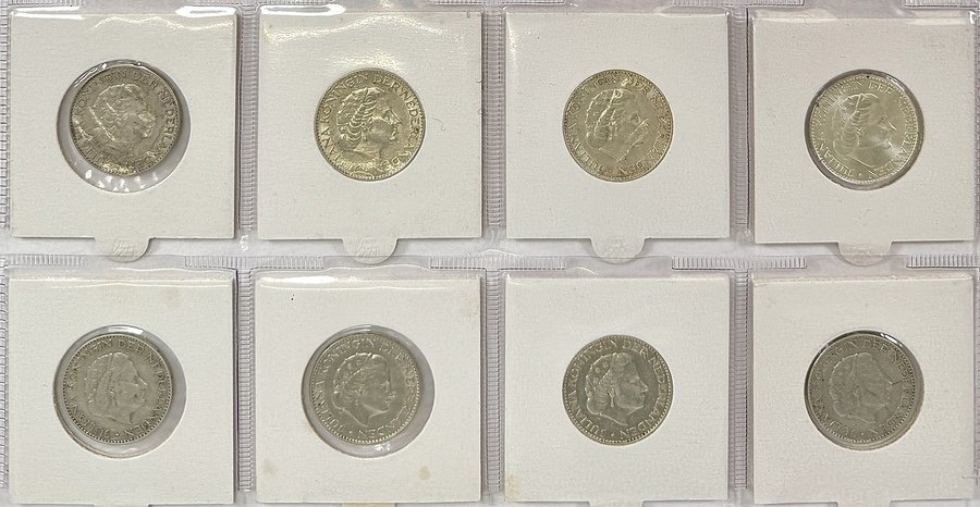 Acht Nederlandse guldens, geslagen tussen 1956 en 1967 onder koningin Juliana. Uitgevoerd in zilver 720/1000 en vervaardigd door stempeltechniek, in realistische klassieke stijl met portret van Juliana in profiel en wapen van Nederland met kroon. Alle exemplaren voorzien van jaartal en omschrift “JULIANA KONINGIN DER NEDERLANDEN”. Klaar om te bieden? Registreer je nu en doe mee aan de veiling! |