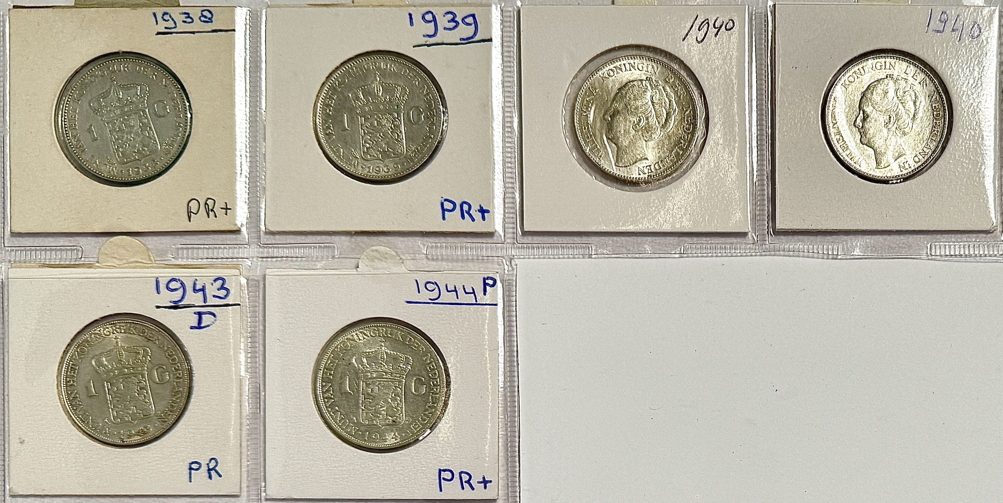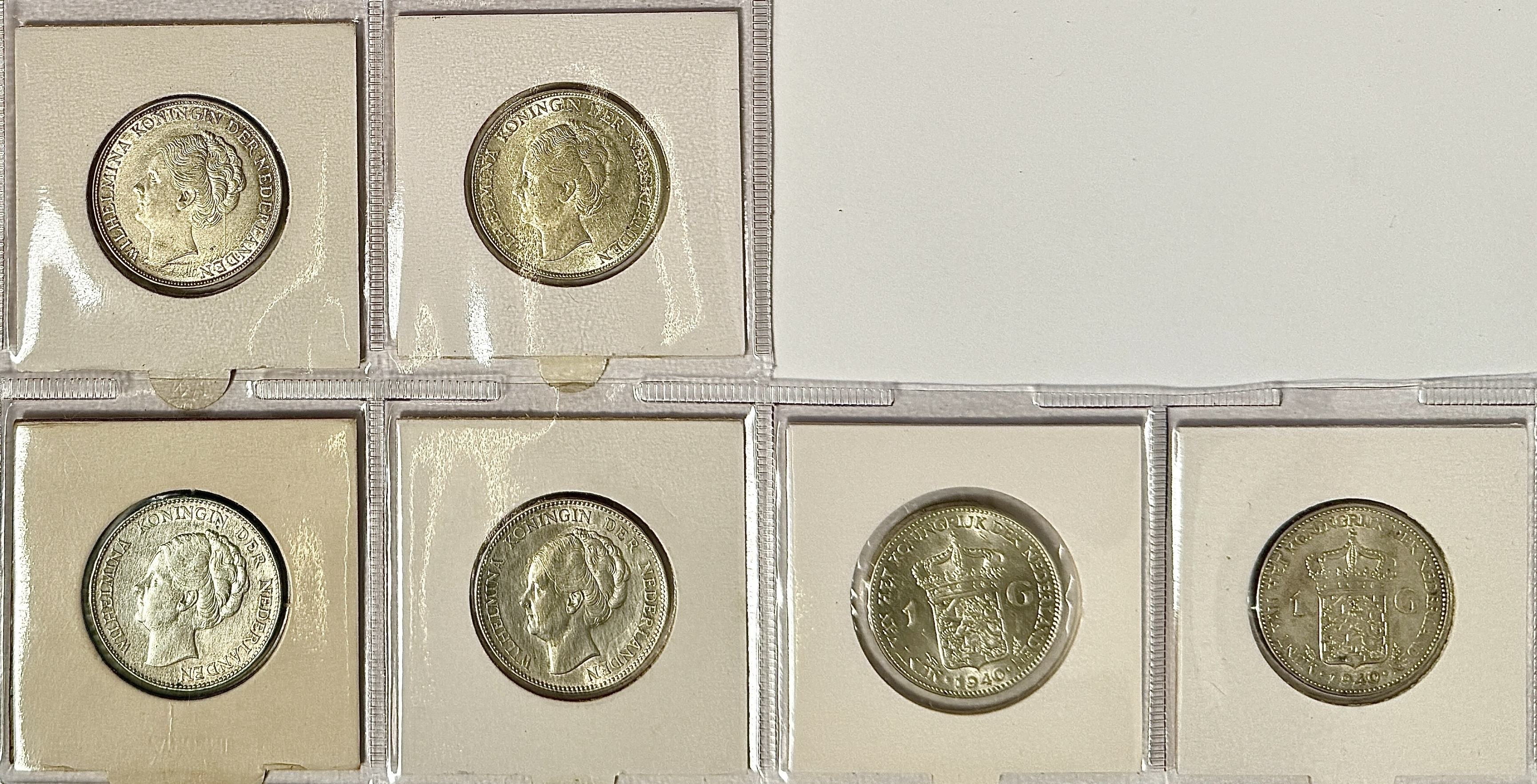 Zes Nederlandse zilveren munten van 1 gulden met portret van koningin Wilhelmina, daterend uit 1938, 1939, 1940, 1943 (D) en 1944 (P). Uitgevoerd in zilver met slagtechniek en voorzien van het Nederlandse rijkswapen op de keerzijde. De stijl weerspiegelt de numismatische traditie van het Koninkrijk der Nederlanden in de vroege tot midden twintigste eeuw, met varianten geproduceerd in de Verenigde Staten tijdens de oorlogsjaren. Geïnteresseerd? Bezoek onze kijkdagen voor een persoonlijke bezichtiging! |