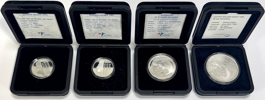Vier Nederlandse munten in moderne stijl, ontworpen door Bruno Ninaber van Eyben (1950), Hans van Houwelingen (1957) en Gerard Unger (1942–2018), vervaardigd in 1995 en 2001. Uitgevoerd in zilver 925/1000, geslagen in proof kwaliteit door de Koninklijke Nederlandse Munt. Twee zilveren guldens 2001, een 50 gulden 1995 en een 10 euro huwelijksmunt, met thematische ontwerpen en geprofileerde portretten. Wil je deze munten in het echt bekijken? Kom naar de kijkdagen op 29, 30 en 31 augustus! |