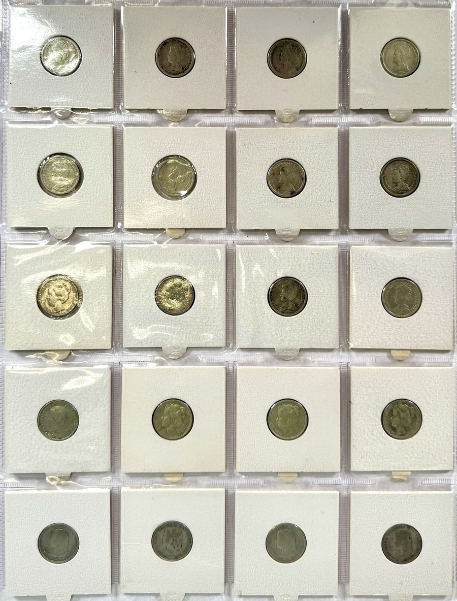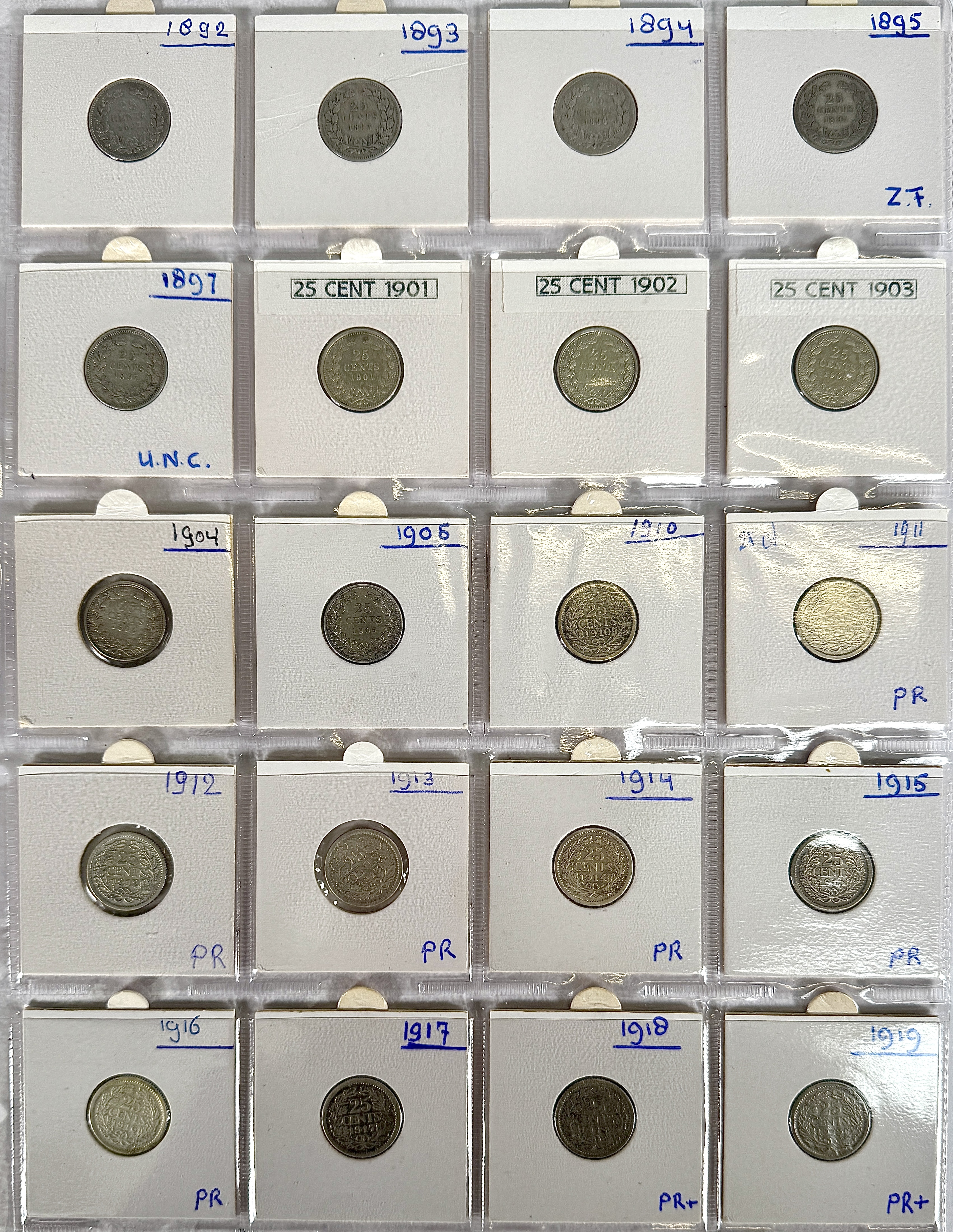Een kavel met twintig Nederlandse 25 cent munten uit de periode 1892-1919. De munten zijn vervaardigd van zilver met een gehalte van 640/1000. De ontwerpen waaronder portretten van Koningin Wilhelmina, door Pier Pander en het wapen van J.C. Wienecke, zijn geproduceerd door middel van muntpersing. De munten, met verschillende jaargangen, zijn opgeborgen in kartonnen houders waarop de jaartallen en enkele classificaties handgeschreven zijn. Jouw kans op deze munten begint met registreren – bied live of online mee! |