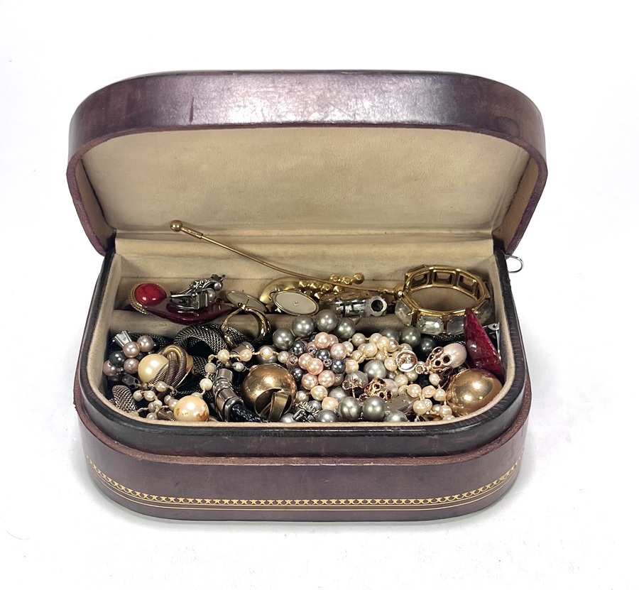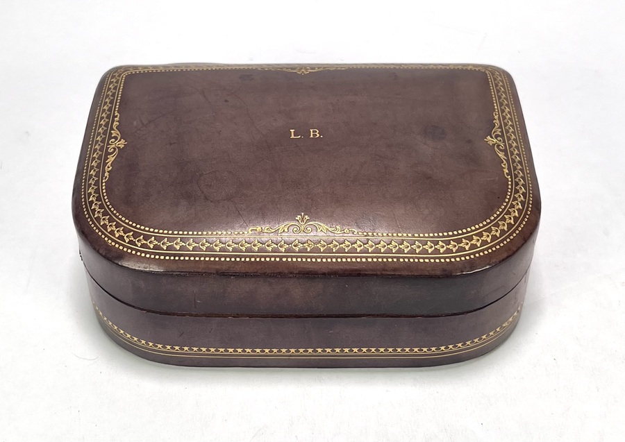 Lederen sieradendoos uitgevoerd in empire stijl, met initialen "L.B." op het deksel, midden 20e eeuw. De doos bevat een collectie vintage sieraden in diverse materialen zoals kunstparels, metaal, glas en kunststof, met technieken als emailleren, rijgen en vlechten. Inclusief opvallende rode oorclips, parelcolliers en metalen armbanden. Zelf beoordelen? Je bent welkom op onze kijkdagen op 29, 30 en 31 augustus! |