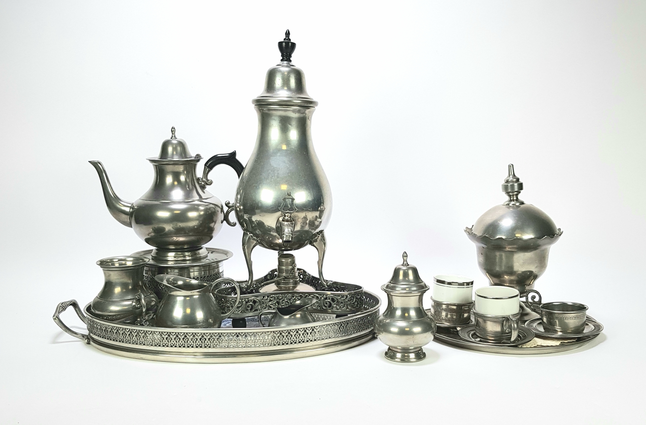 Tinnen servies in neoclassicistische stijl, omstreeks midden 20e eeuw, bestaande uit koffie- en theekannen, suikerpotten, roomkannetjes, kopjes met tinnen houders en bijpassende schotels, gepresenteerd op bijbehorende dienbladen. Geïnteresseerd? Bezoek onze kijkdagen op 29, 30 of 31 augustus van 11:00 tot 17:00 uur! |