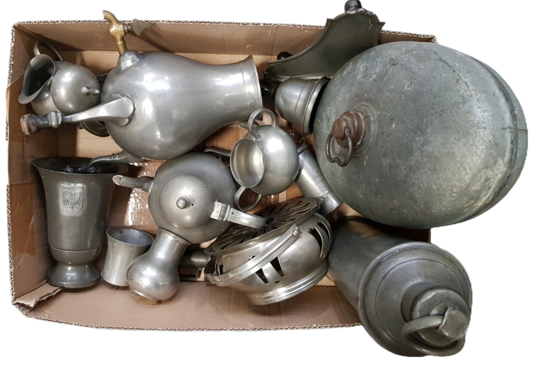 Een gevarieerd kavel van tinnen en metalen objecten, daterend van midden 20e eeuw. De collectie bestaat uit een mix van verschillende objecten waaronder theepotten, kannen, warmhouders en bekers. Wil je direct deelnemen? Plaats vanaf 22 augustus alvast een schriftelijk bod via onze website! |