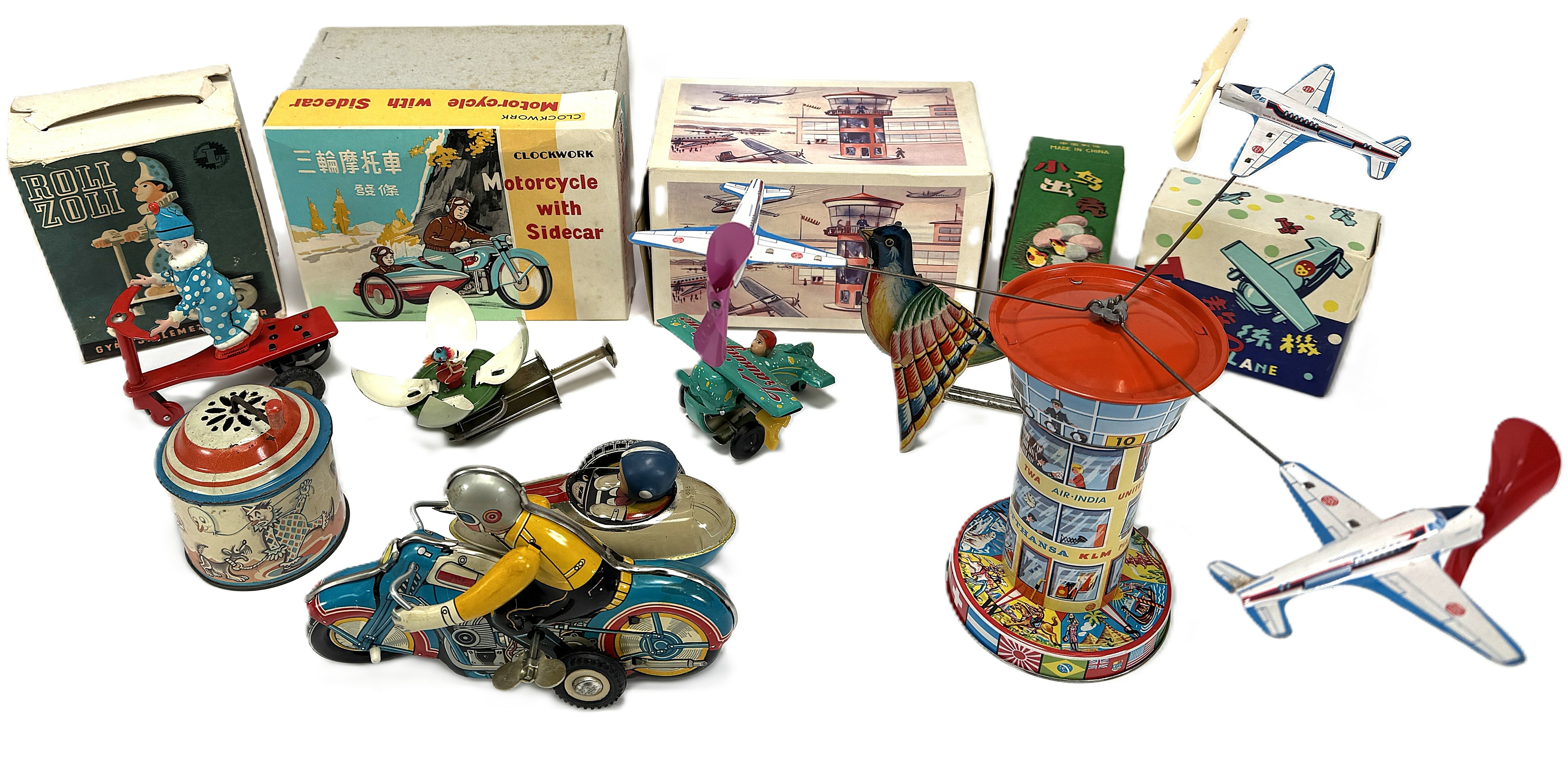 Deze verzameling vintage blikken speelgoed, daterend van omstreeks 1950-1970, omvat een mechanische clown op fiets, een motor met zijspan en diverse vliegende objecten, inclusief een toren met roterende vliegtuigen. De objecten zijn vervaardigd uit geperst en gelithografeerd blik. Diverse originele dozen zijn aanwezig, waaronder exemplaren met opschrift “Motorcycle with Sidecar”, “Roli Zoli” en “Airplane”. Kom langs tijdens de kijkdagen (29 t/m 31 augustus) en ontdek dit speelgoed zelf. |