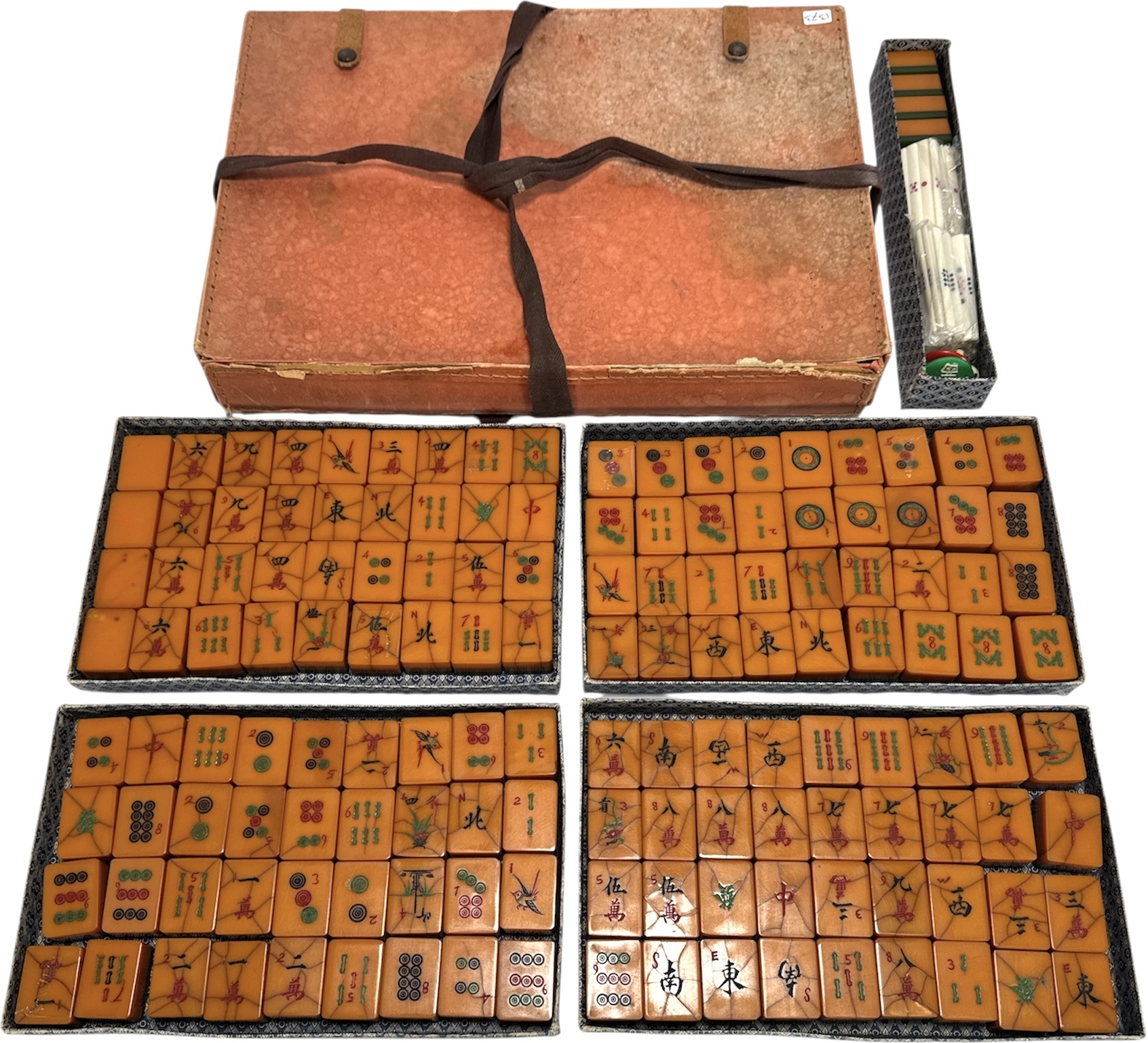 Mahjong spel uit omstreeks midden 20e eeuw, bestaande uit bakelieten tegels met ingegraveerde en ingekleurde symbolen in rood, groen en zwart, verpakt in de originele kartonnen doos met sluitriemen. De vintage set bevat puntentellers en dobbelstenen en is representatief voor machinaal vervaardigde spellen met handmatig ingekleurde details uit deze periode. Wil je direct deelnemen? Plaats vanaf 22 augustus alvast een schriftelijk bod via onze website! |