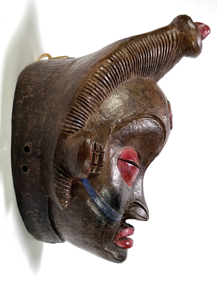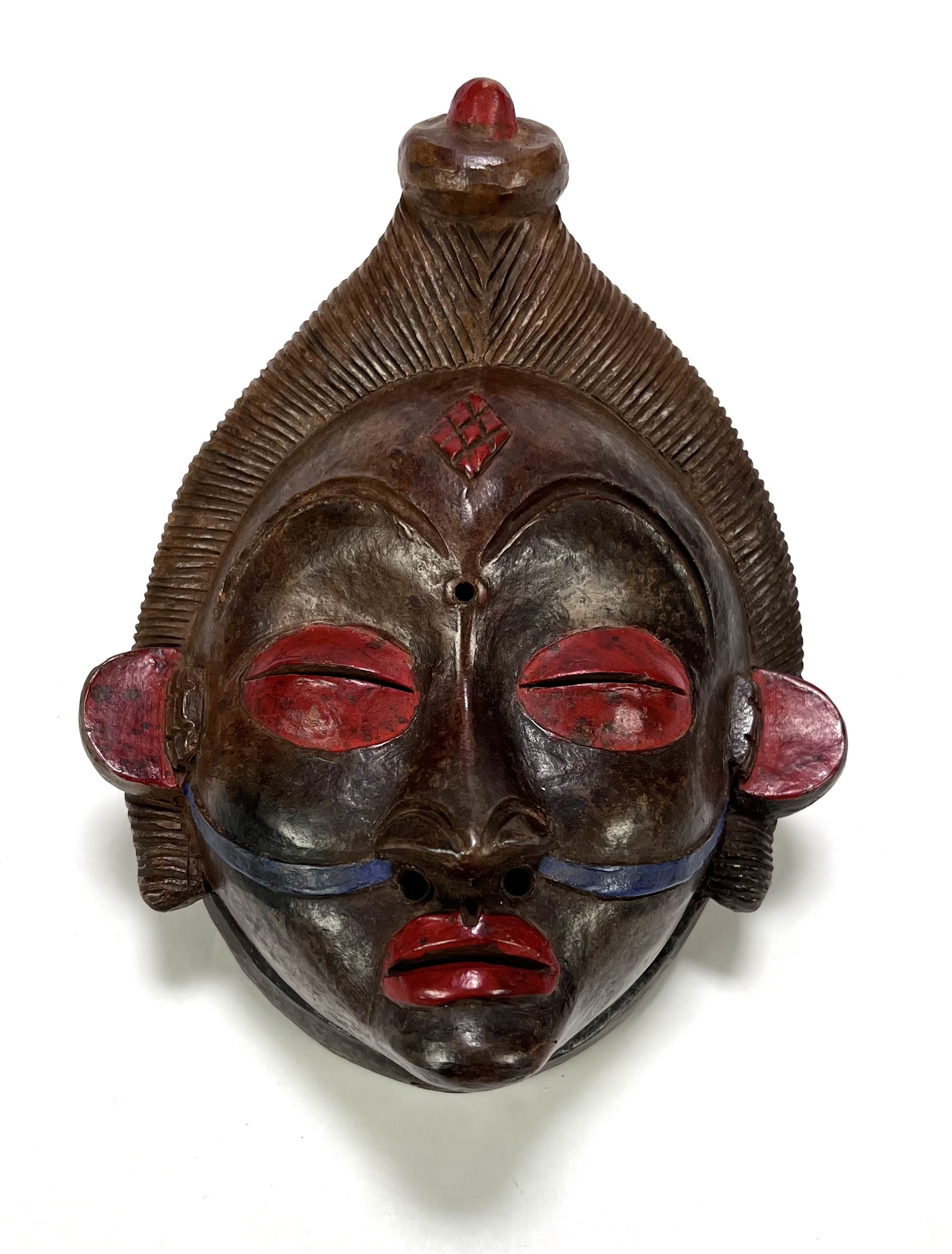 Een handgesneden houten masker in traditioneel Afrikaanse stijl, daterend uit de midden 20e eeuw. Het masker heeft gestileerde gelaatstrekken met rode ogen en lippen, aangevuld met blauwe lijnen op de wangen. Een opvallende geribbelde kuif met rode accentkleur siert de bovenzijde van het hoofd. Klaar om te bieden? Registreer je nu en doe mee aan de veiling! |