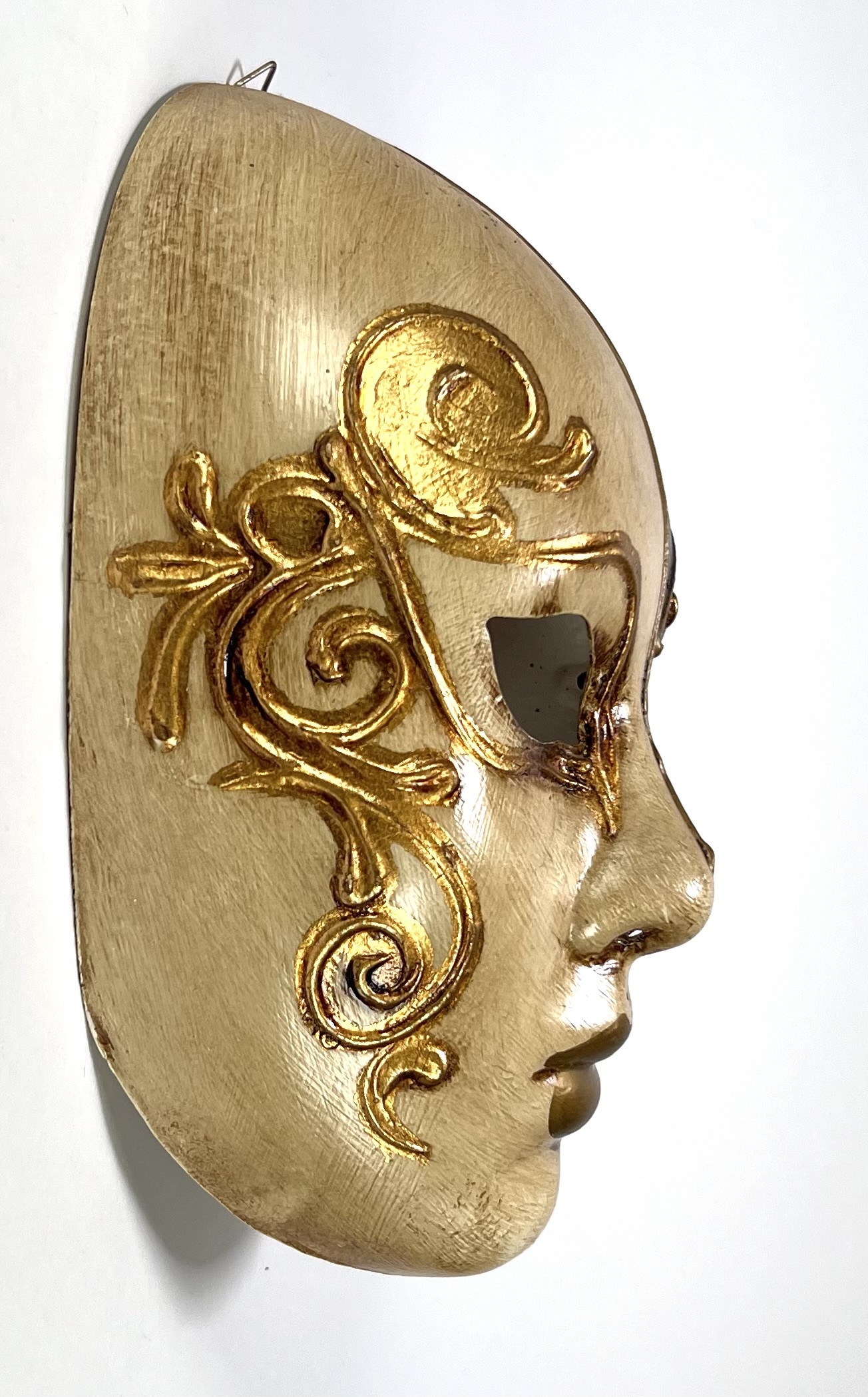Dit masker, daterend uit midden 20e eeuw (circa 1950-1980), is uitgevoerd in de Venetiaanse maskeradestijl. Het masker is gemaakt van papier-maché en asymmetrisch gedecoreerd in goud, zwart, roze en beige, met opvallende vergulde krulmotieven. Zwarte satijnen linten zijn bevestigd voor het dragen. Registreer nu en bied eenvoudig online mee op dit object! |