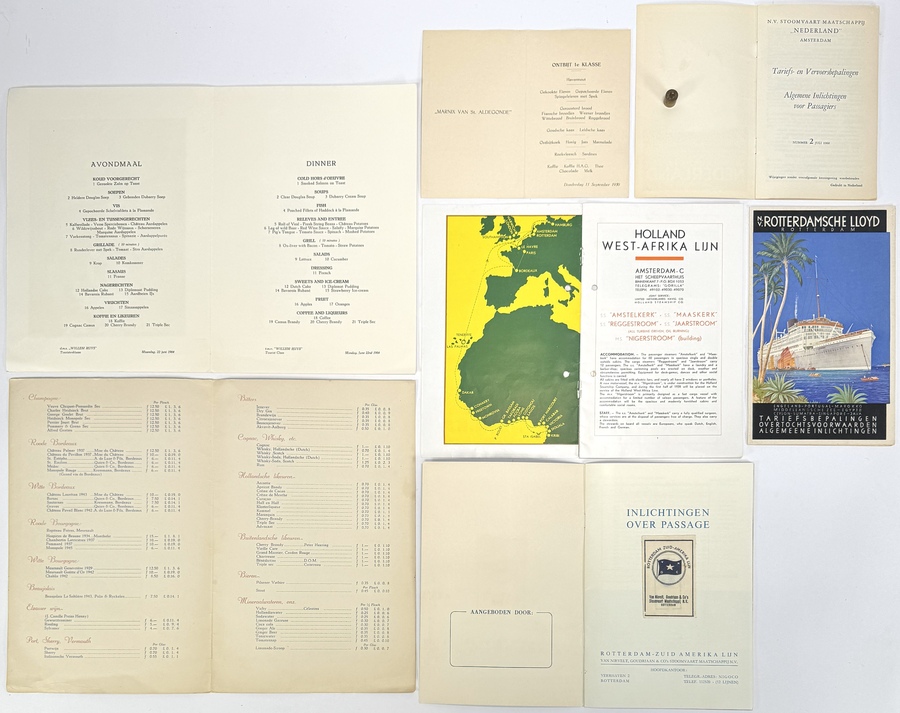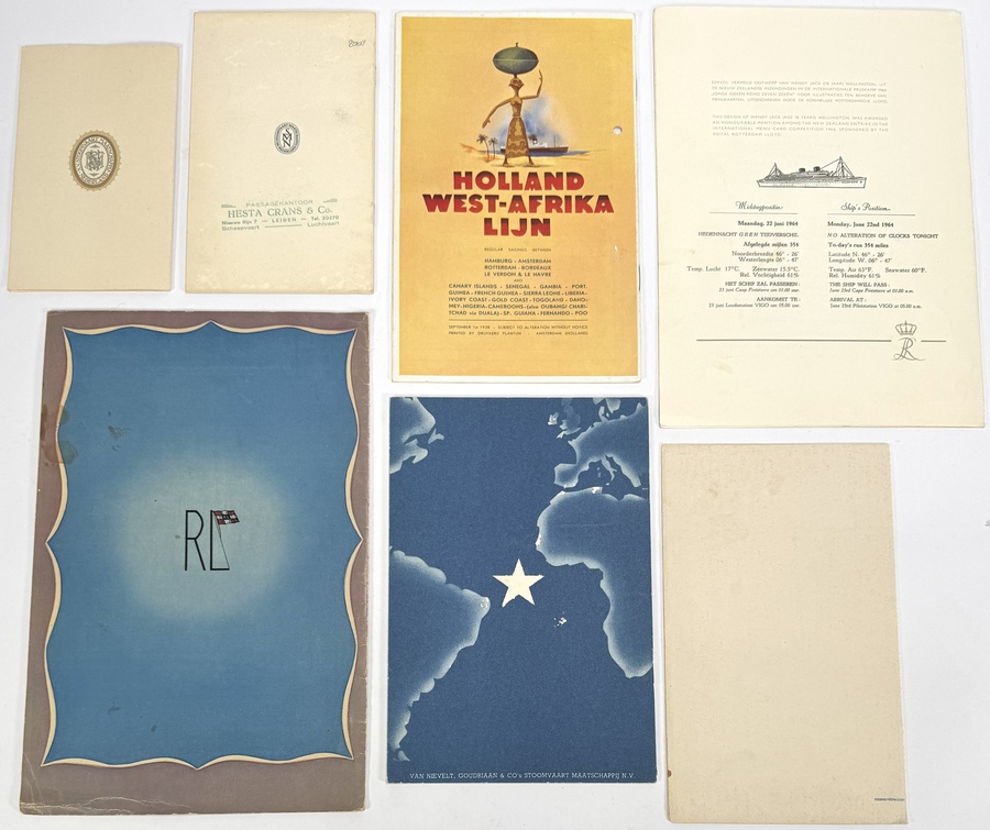 Collectie, circa 1940–1960, bestaande uit drukwerk van Nederlandse scheepvaartmaatschappijen, waaronder Rotterdamsche Lloyd, Holland West-Afrika Lijn en N.V. Stoomvaart Maatschappij Nederland. Uitgevoerd in offsetdruk en boekdruk op papier met reisinformatie, menukaarten, kaarten en illustraties. Opvallende visuele elementen zijn gestileerde schepen, tropische motieven en cartografie. Deze verzameling zelf beoordelen? Je bent welkom op onze kijkdagen op 29, 30 en 31 augustus! |