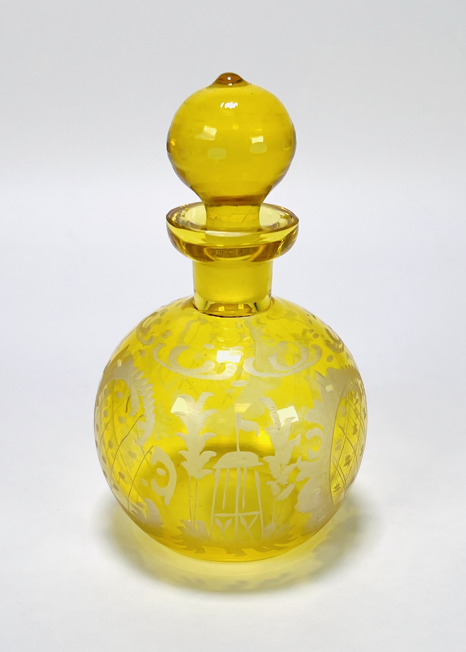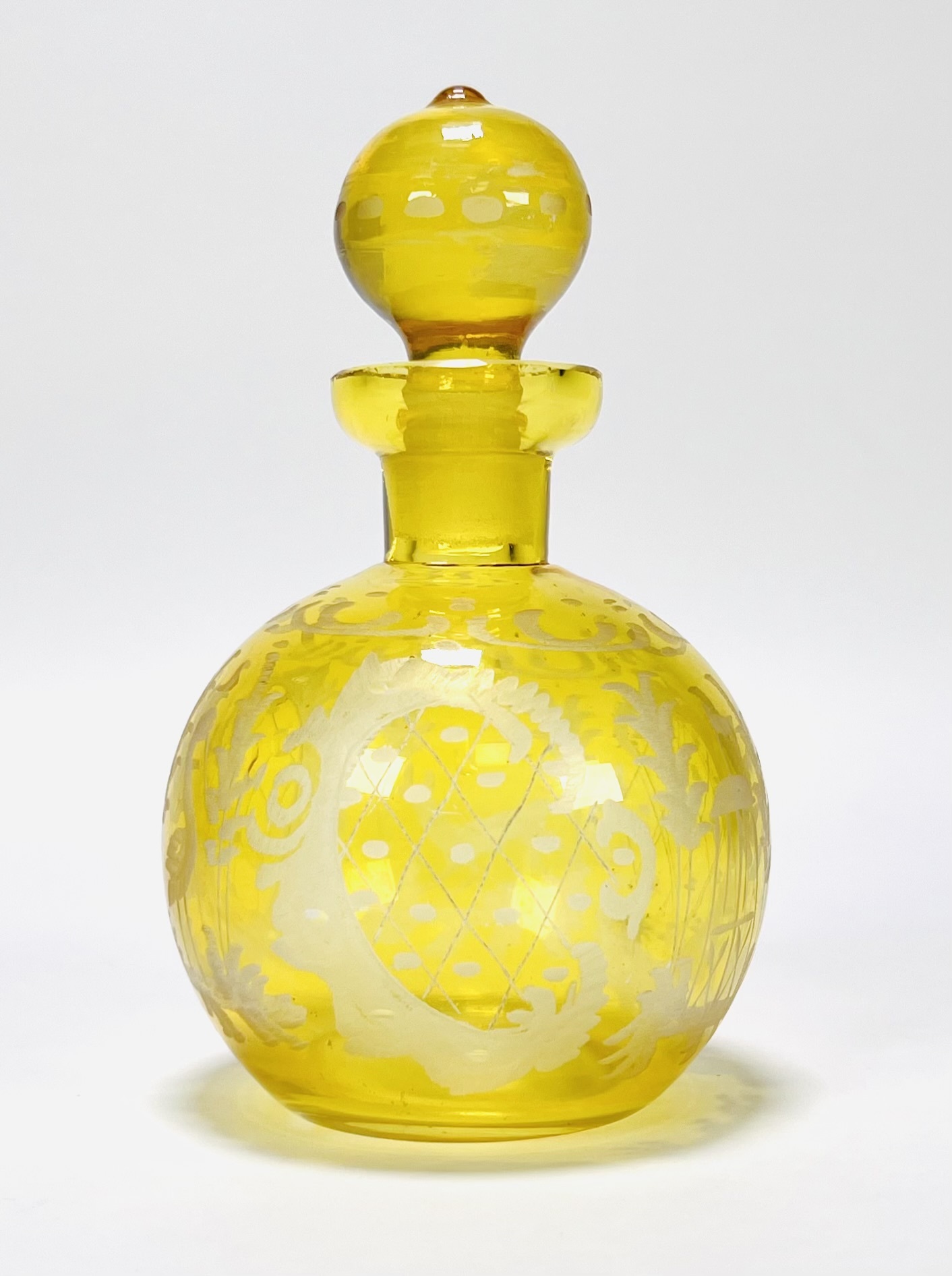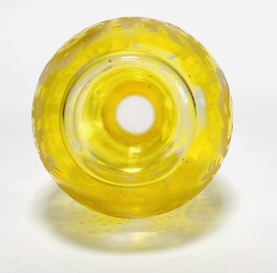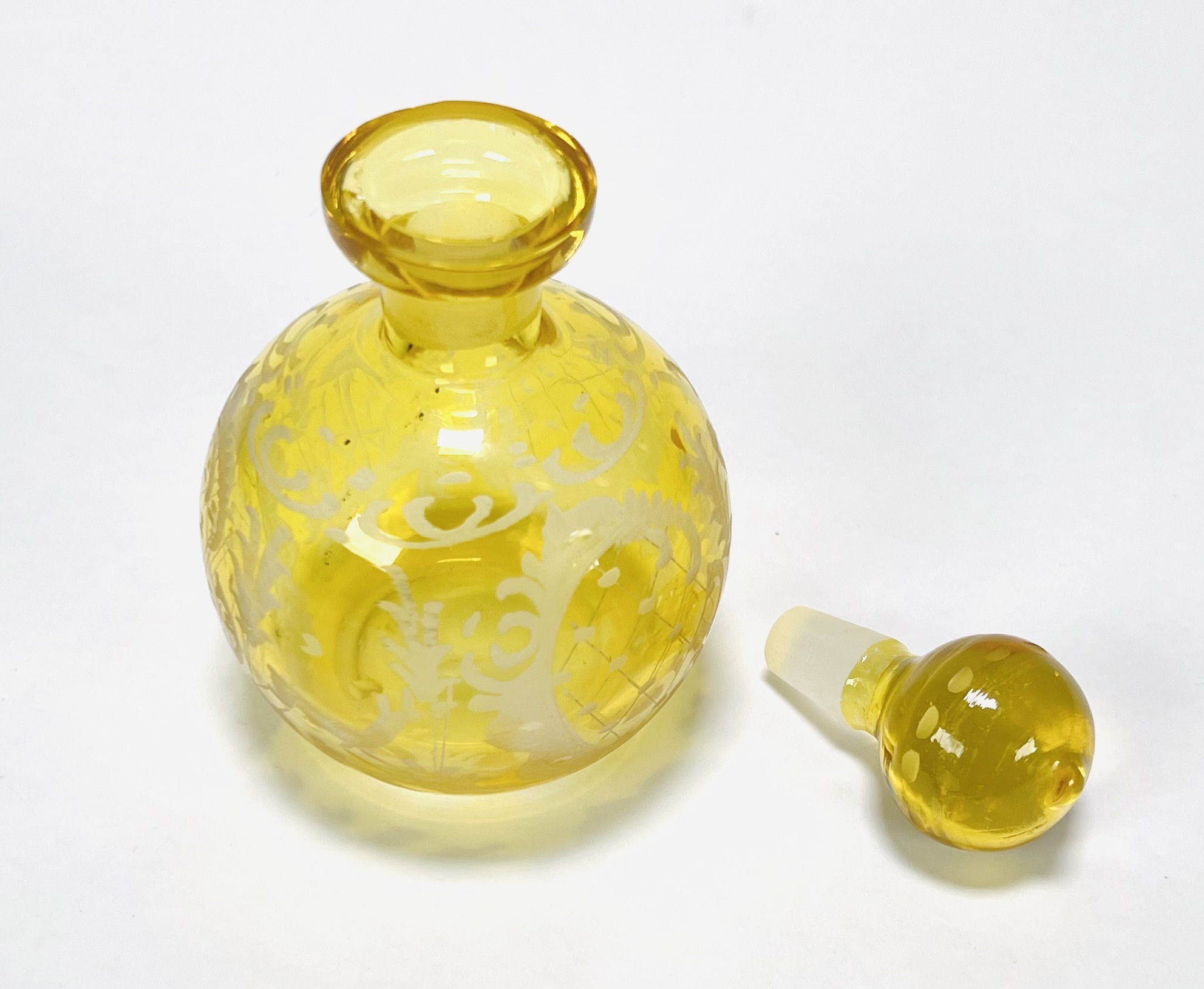 Vintage geel glazen parfumflesje met gravure, midden 20e eeuw