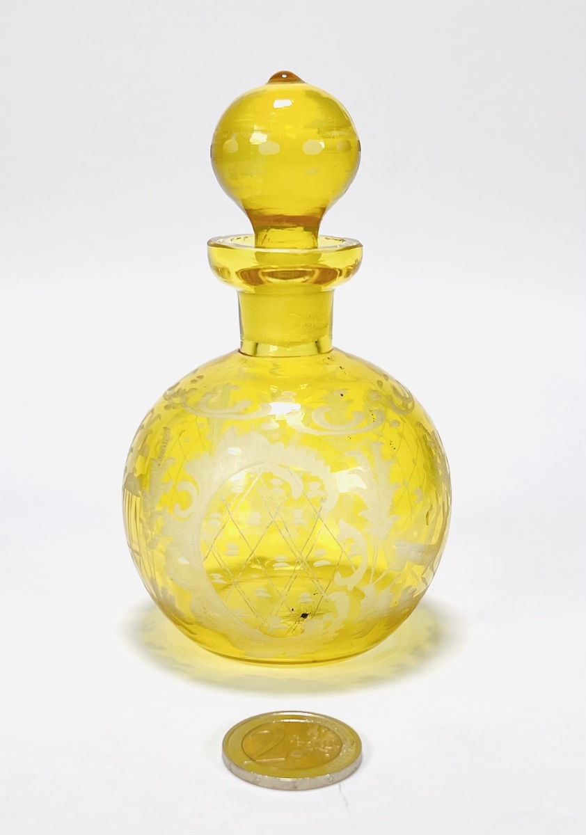 Geel glazen parfumflesje met stop, uitgevoerd in transparant glas met deels gematteerde florale decoraties en vogelmotieven. Midden 20e-eeuws object, vervaardigd in geslepen en geëtst glas, met bolvormig lichaam en bijpassende bolstop. De stijl vertoont invloeden van Midden-Europese sierglasproductie. Zelf beoordelen? Je bent welkom op onze kijkdagen op 29, 30 en 31 augustus! |