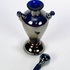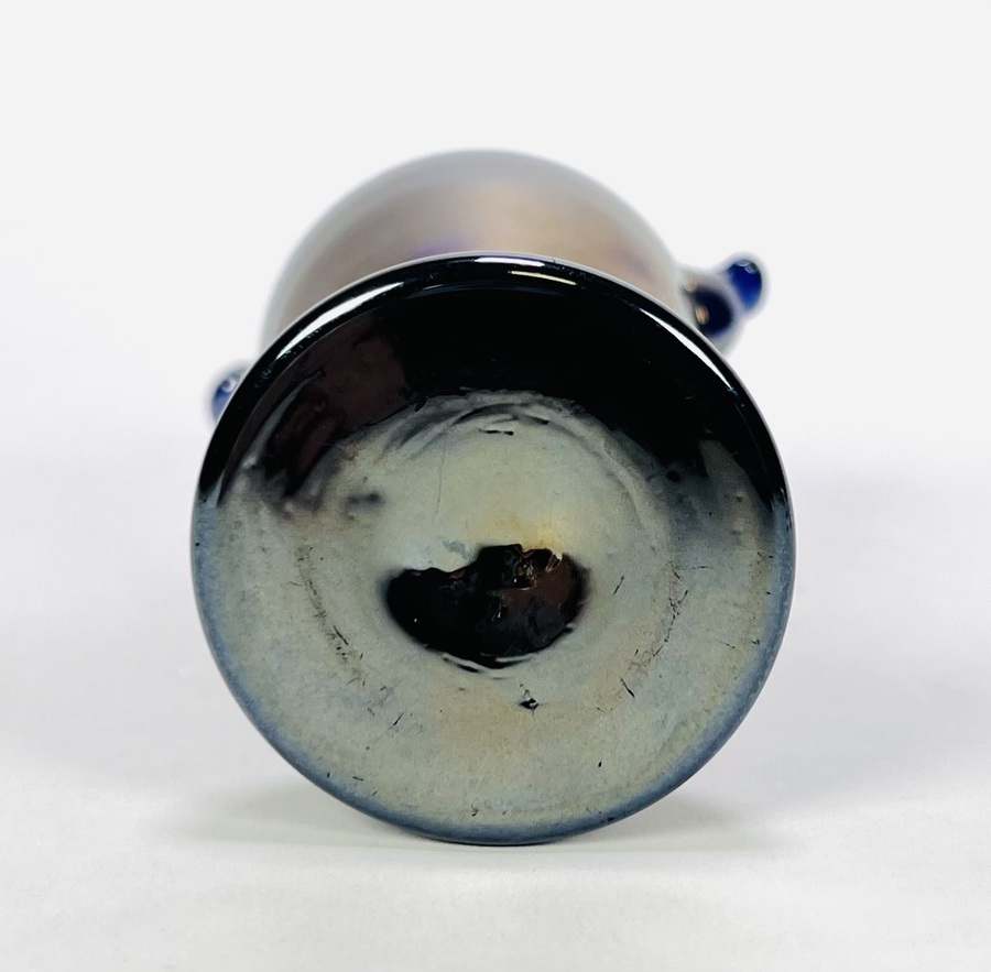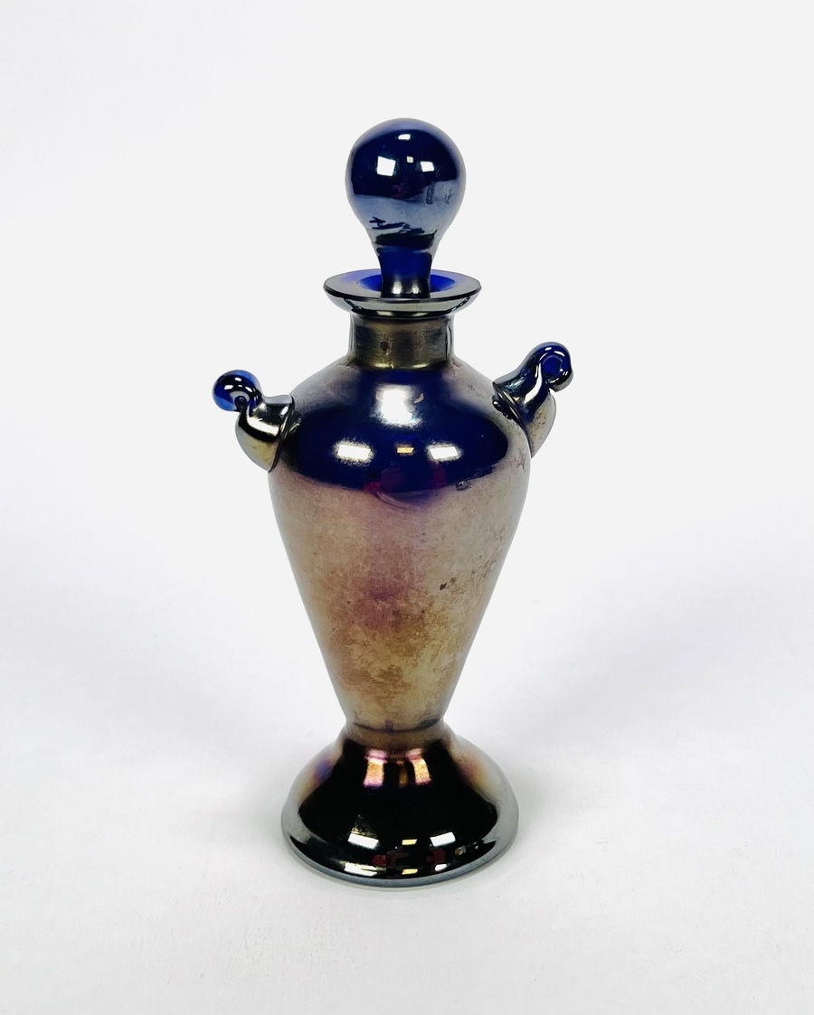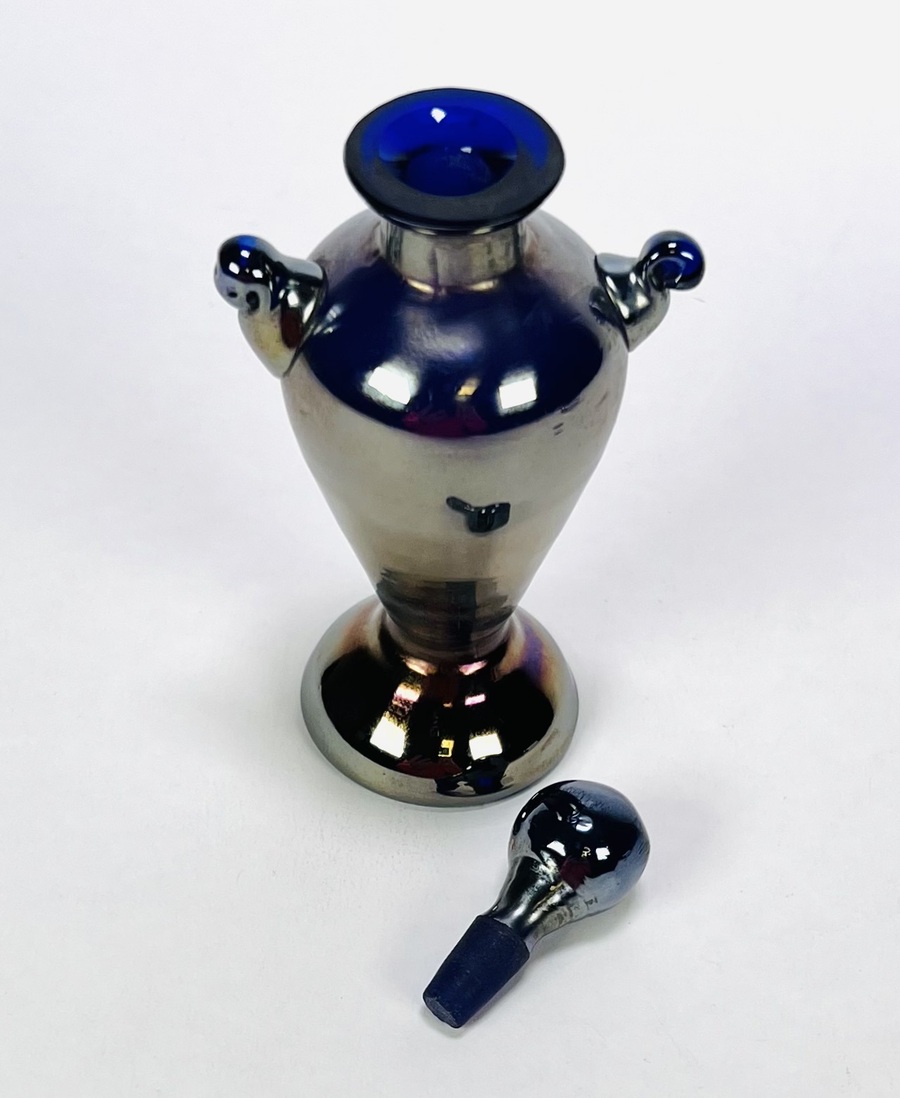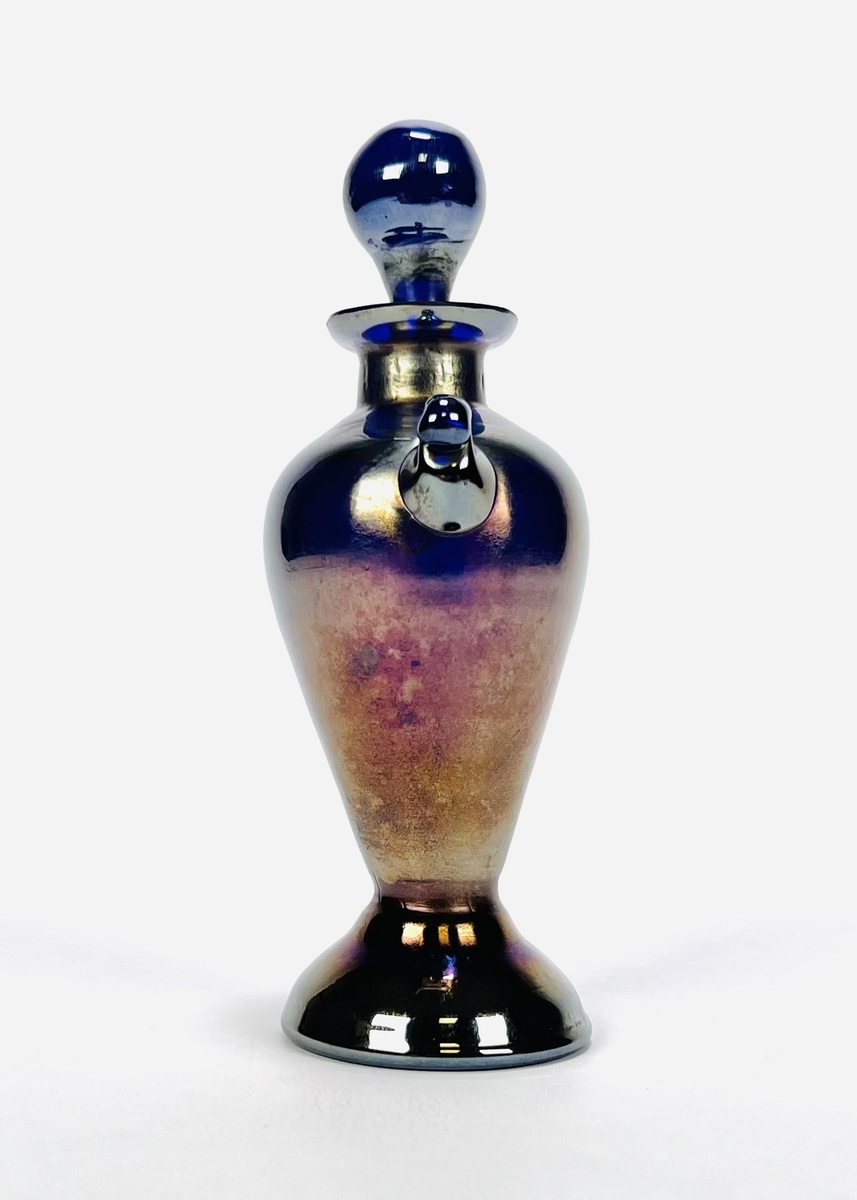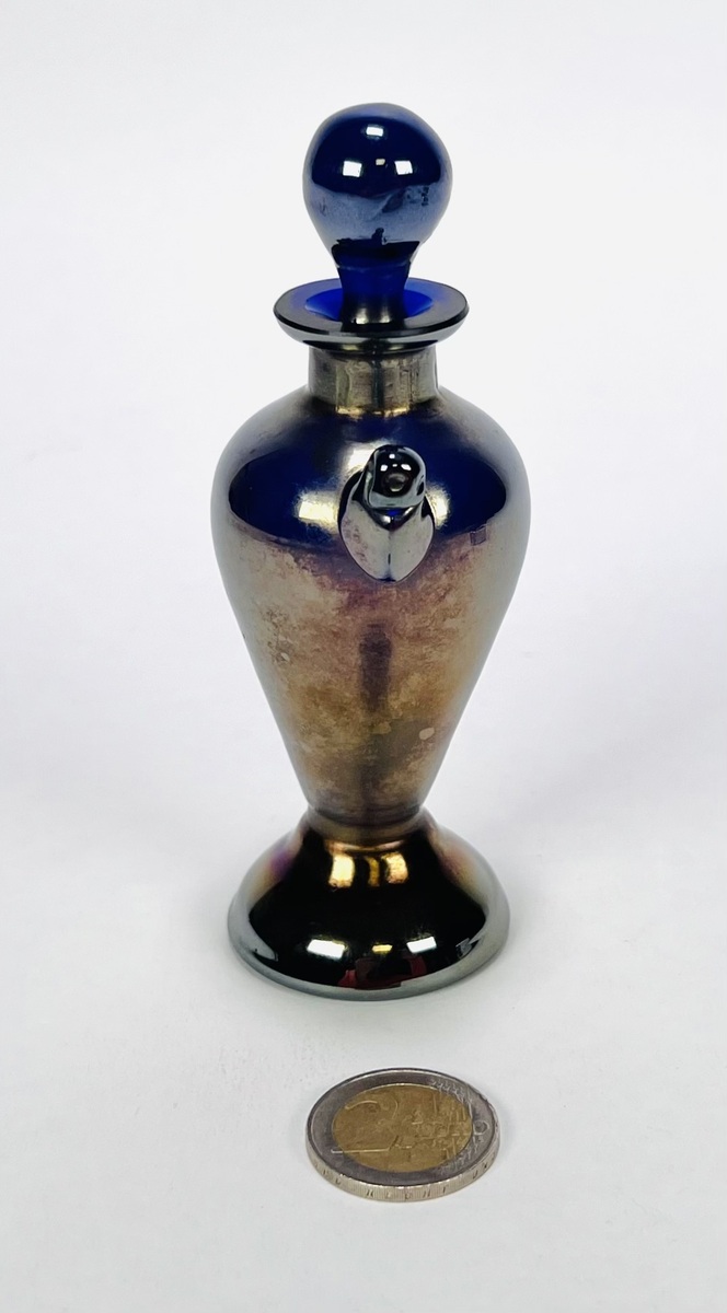 Art Deco parfumflesje uit kobaltblauw glas met metallic irisatie uitgevoerd in een amfoorvorm met twee oren en ronde stop, vervaardigd in handgeblazen techniek. Het object toont kleurverloop van diepblauw naar goudbruin en is voorzien van een passende glazen stop. Geïnteresseerd? Bezoek onze kijkdagen op 29, 30 of 31 augustus van 11:00 tot 17:00 uur |