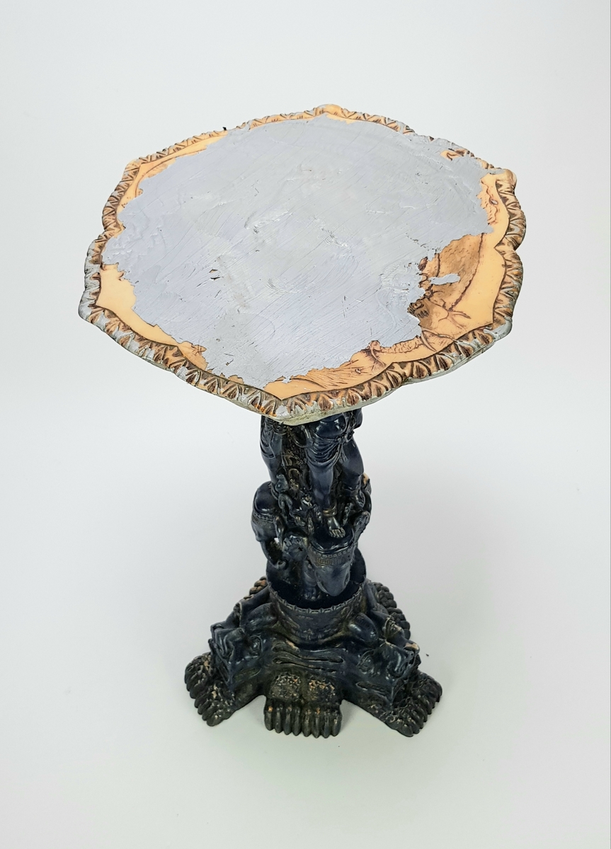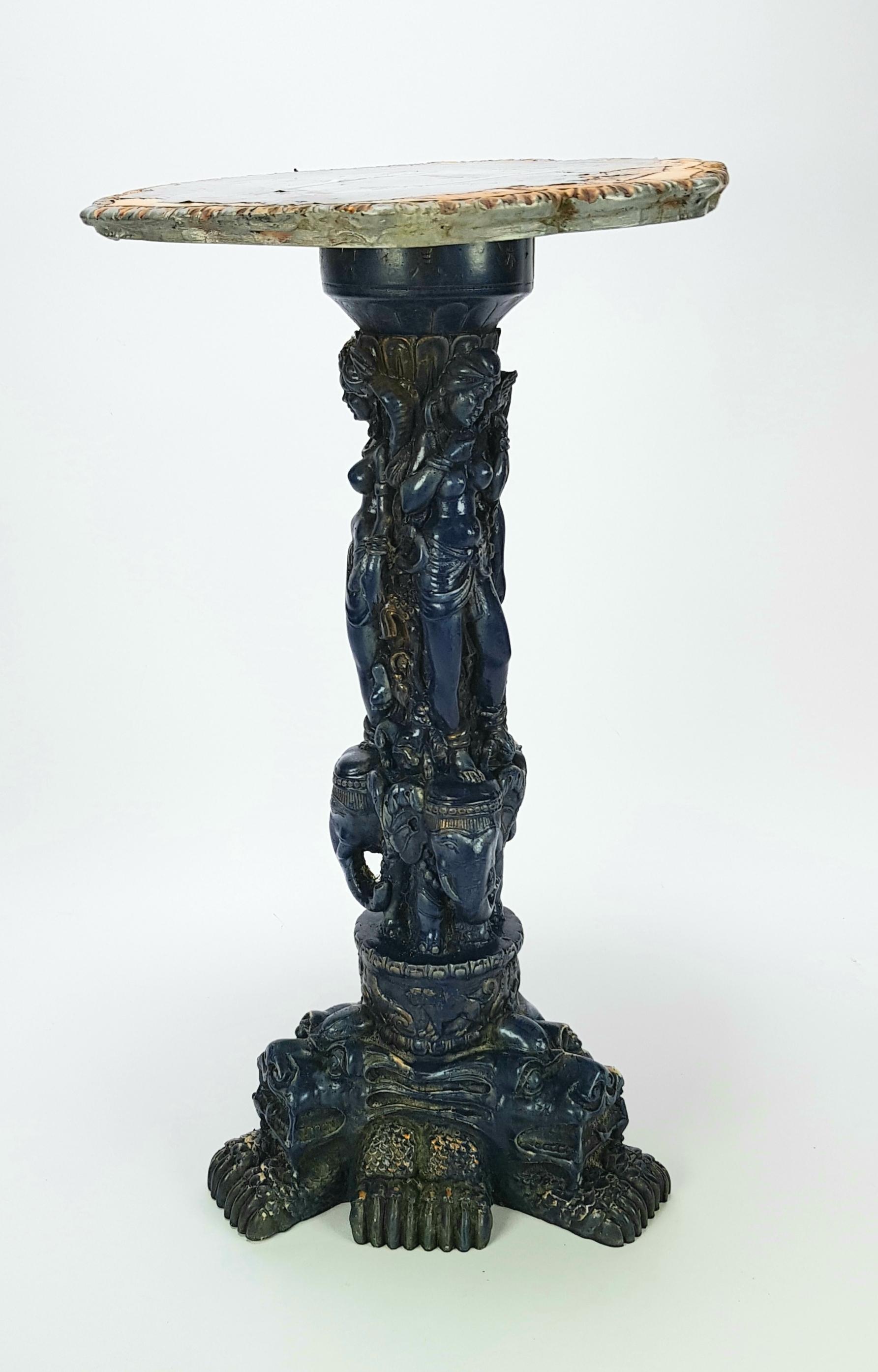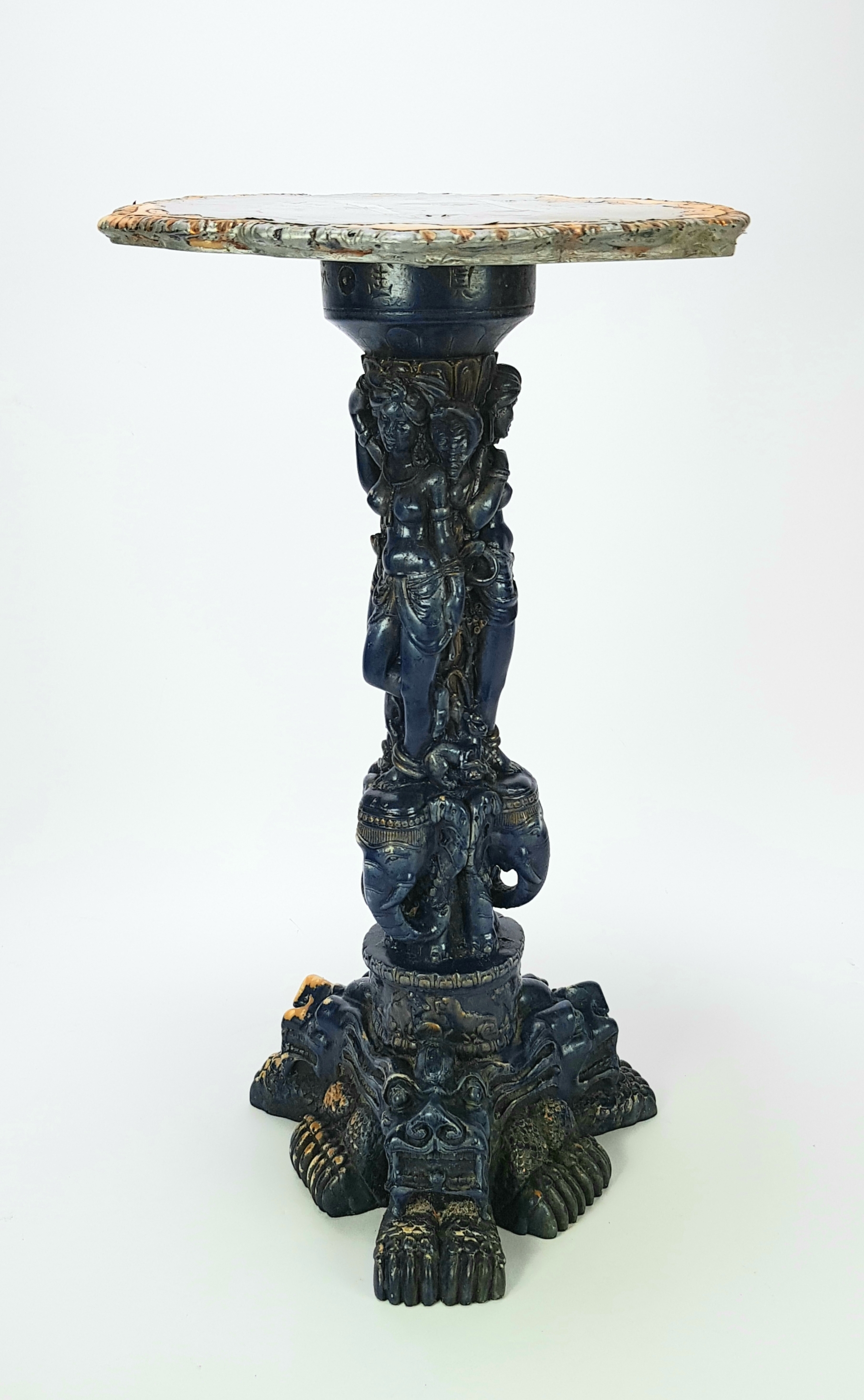 Piëdestal in Indische revivalstijl, 20e eeuw, vervaardigd uit blauw geverfde polystone. De zuil toont drie vrouwenfiguren op olifanten, ondersteund door mythische leeuwenkoppen aan de voet. De bovenkant is rond met decoratieve rand en deels grijs overschilderd oppervlak. Kom langs tijdens de kijkdagen (29 t/m 31 augustus) en ontdek deze piëdestal zelf! |
