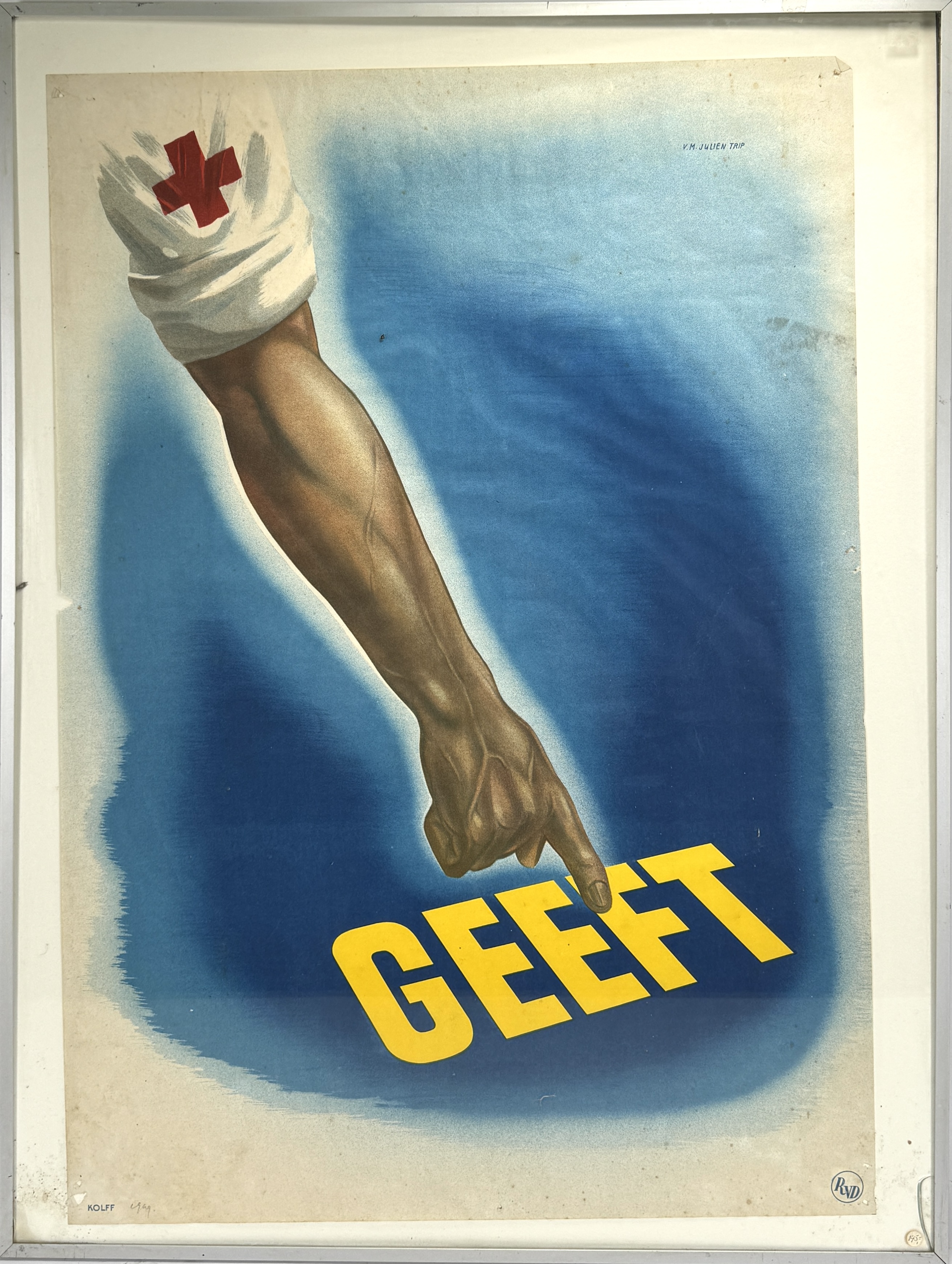 Deze poster van het Rode Kruis, midden 20e-eeuws, is gemaakt door V.M. Julien Trip en uitgegeven door Kolff. De poster toont een verplegersarm met rood kruis die wijst naar het woord "GEEFT" in gele letters op een donkerblauwe achtergrond. Dit werk uitgevoerd als lithp op papier, dient een wervingsdoel en is typerend voor de propagandastijl van de vroege 20e eeuw. Gemonogrammeerd RVD rechtsonder. Klaar om te bieden op deze poster? Registreer je nu en doe mee aan de veiling! |