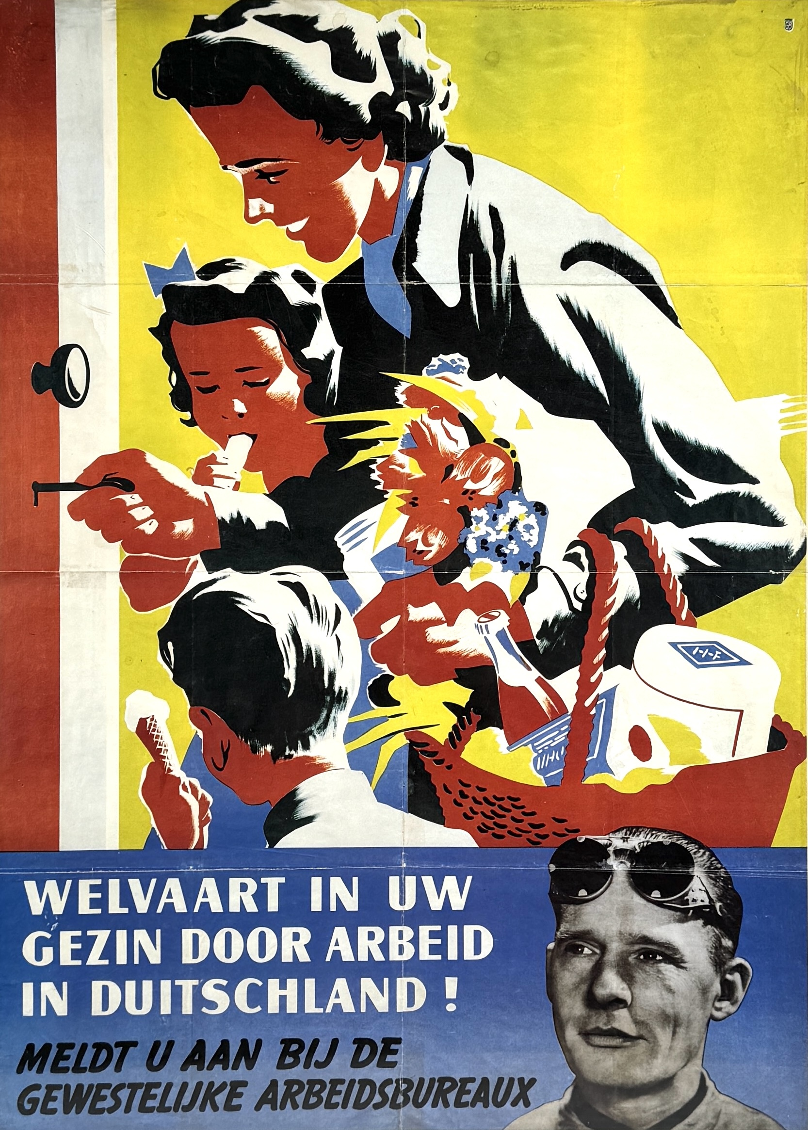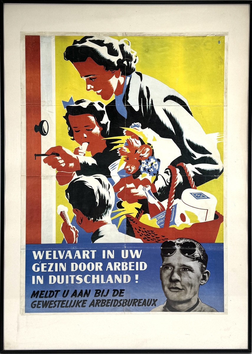 Affiche in propagandistische stijl, gedrukt in lithografische techniek op papier, circa 1942–1943. Het affiche toont een idealiserend gezin met producten, begeleid door de tekst “Welvaart in uw gezin door arbeid in Duitsland!”. Oorspronkelijk gebruikt als wervingsmateriaal voor de Arbeitseinsatz. Gedrukt in sterke kleuren. Wil je direct deelnemen? Plaats vanaf 22 augustus alvast een schriftelijk bod via onze website! |