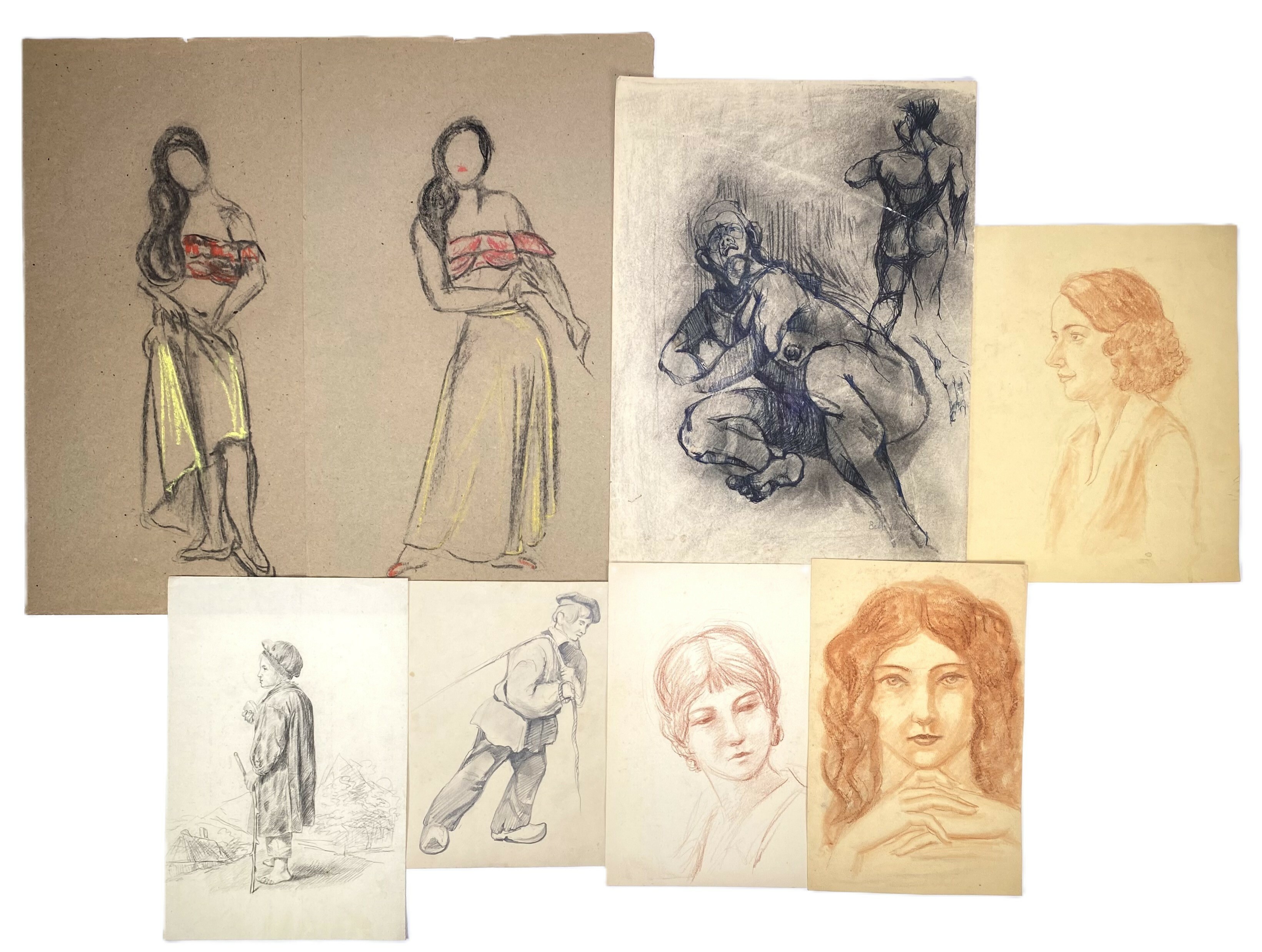 Verzameling van acht ongesigneerde studies en portretten op papier, uitgevoerd in diverse technieken waaronder grafiet, rood krijt en contékrijt, deels op getint papier. De set omvat zowel klassieke portretstudies als karaktervolle figuren en anatomische oefeningen. Enkele bladen met kleuraccenten in rood en geel. Eén studie toont een dynamisch naakt in beweging met rug- en zijaanzicht. Omstreeks midden 20e eeuw. Eerst deze schetsen zien voordat je biedt? Bezoek onze kijkdagen op 29, 30 en 31 augustus van 11:00 tot 17:00 uur! |