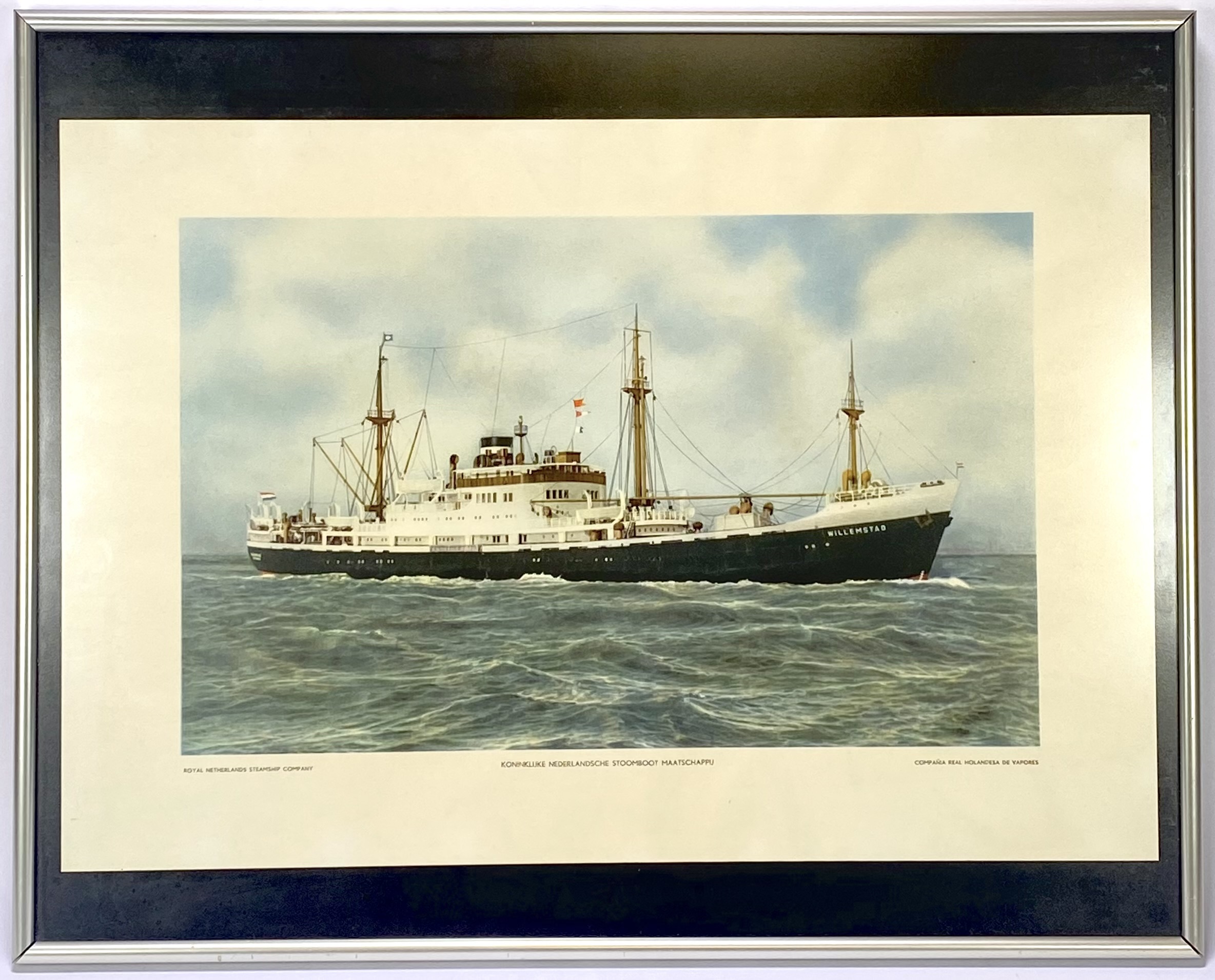 Een prent van het stoomschip 'Willemstad' uit circa 1950. De afbeelding is een offsetdruk die de realistische stijl van een schilderij benadert. Het schip vaart op een woelige zee met de Nederlandse vlag in top. Aan de onderzijde van de prent zijn de namen van de rederij in drie talen vermeld, waaronder de Koninklijke Nederlandse Stoomboot Maatschappij. Deze prent zelf beoordelen? Je bent welkom op onze kijkdagen op 29, 30 en 31 augustus! |