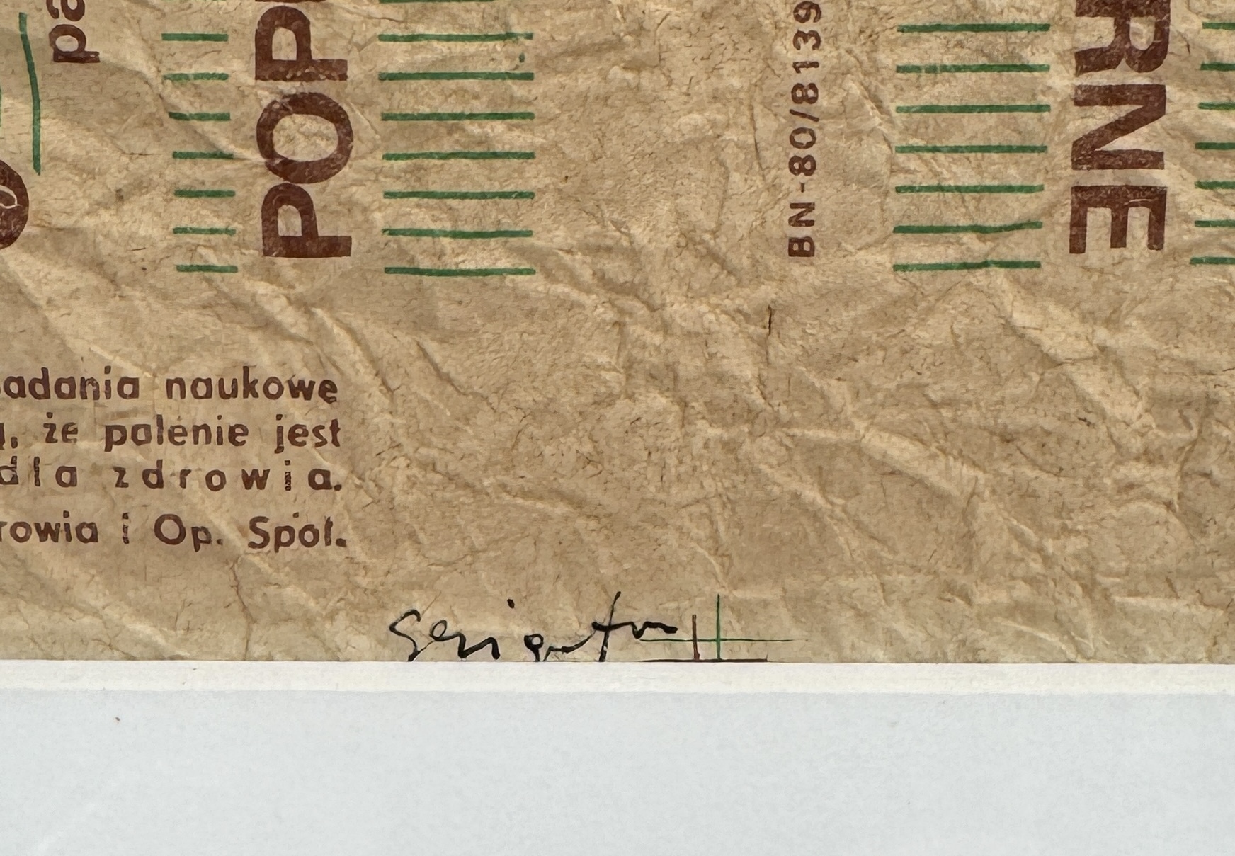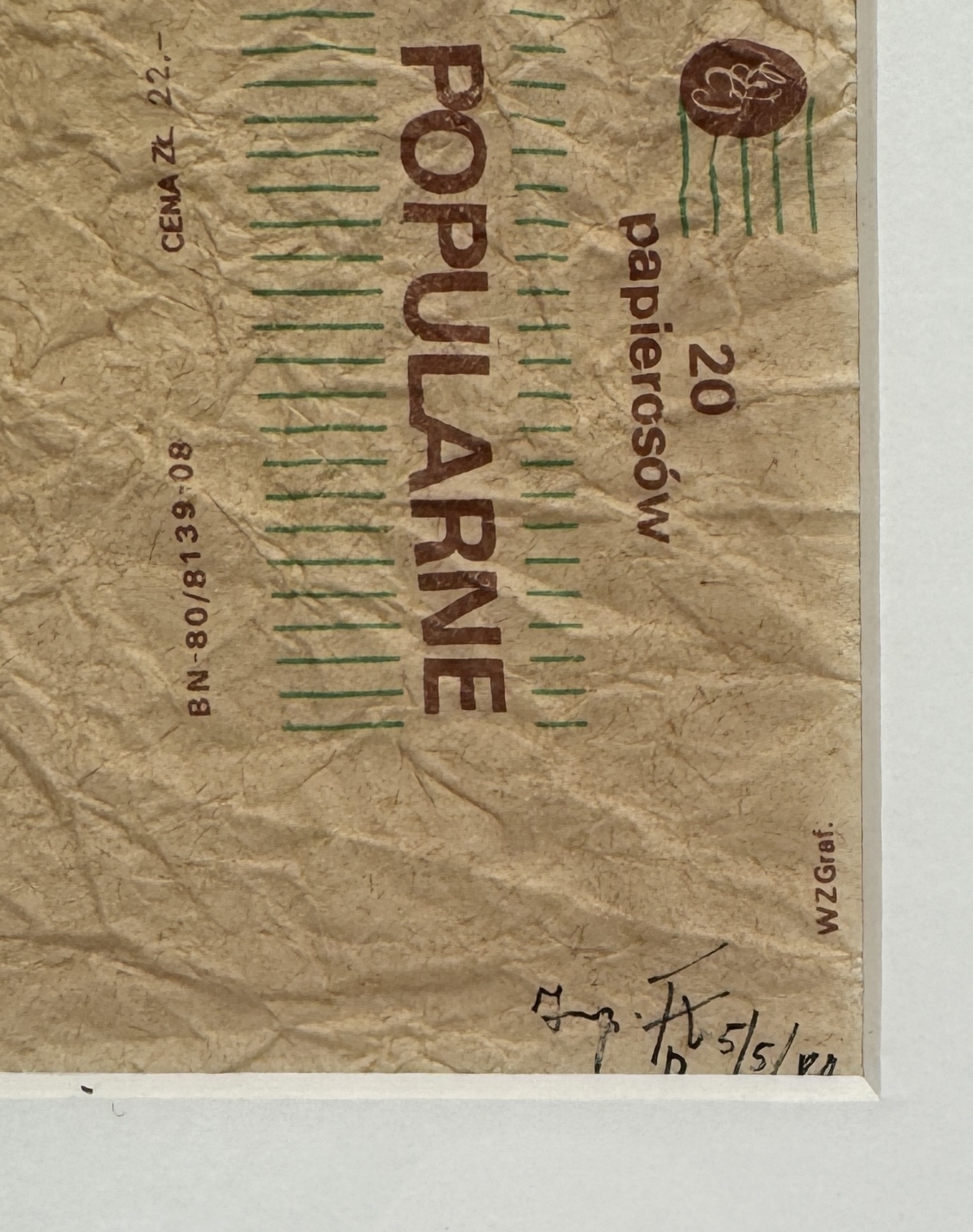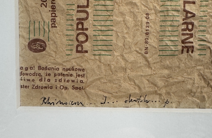 Tekening van Andrzej Dudek-Dürer (1953), gedateerd 5 mei 1989 en gesigneerd rechtsonder. Afbeelding van Dürers rhinoceros met zelfportret van de kunstenaar, gedrukt op Pools sigarettenpapier van het merk “Popularne”. Visuele herhaling van merktekens vormt een kritische verwijzing naar consumptie, massaproductie en identiteit binnen postcommunistische context.