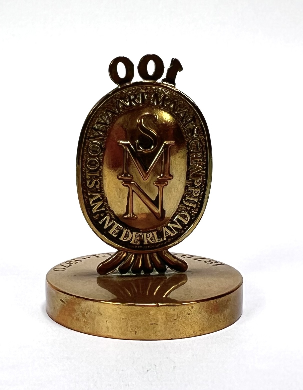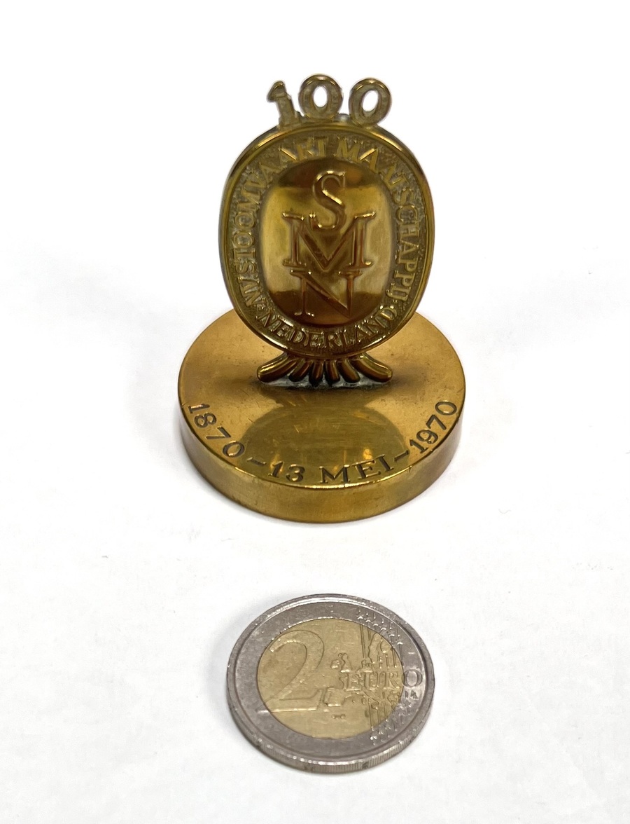 Messing presse-papier ter ere van het 100-jarig jubileum van de Stoomvaart Maatschappij Nederland (SMN) 1970. Uitgevoerd in reliëftechniek met de inscriptie “1870 – 13 MEI – 1970” aan de voorzijde. Het object toont centraal het bedrijfslogo met de letters “SMN” omgeven door de naam van de rederij. Vervaardigd in 1970. Kom langs tijdens de kijkdagen (29 t/m 31 augustus) en ontdek deze presse-papier zelf. |
