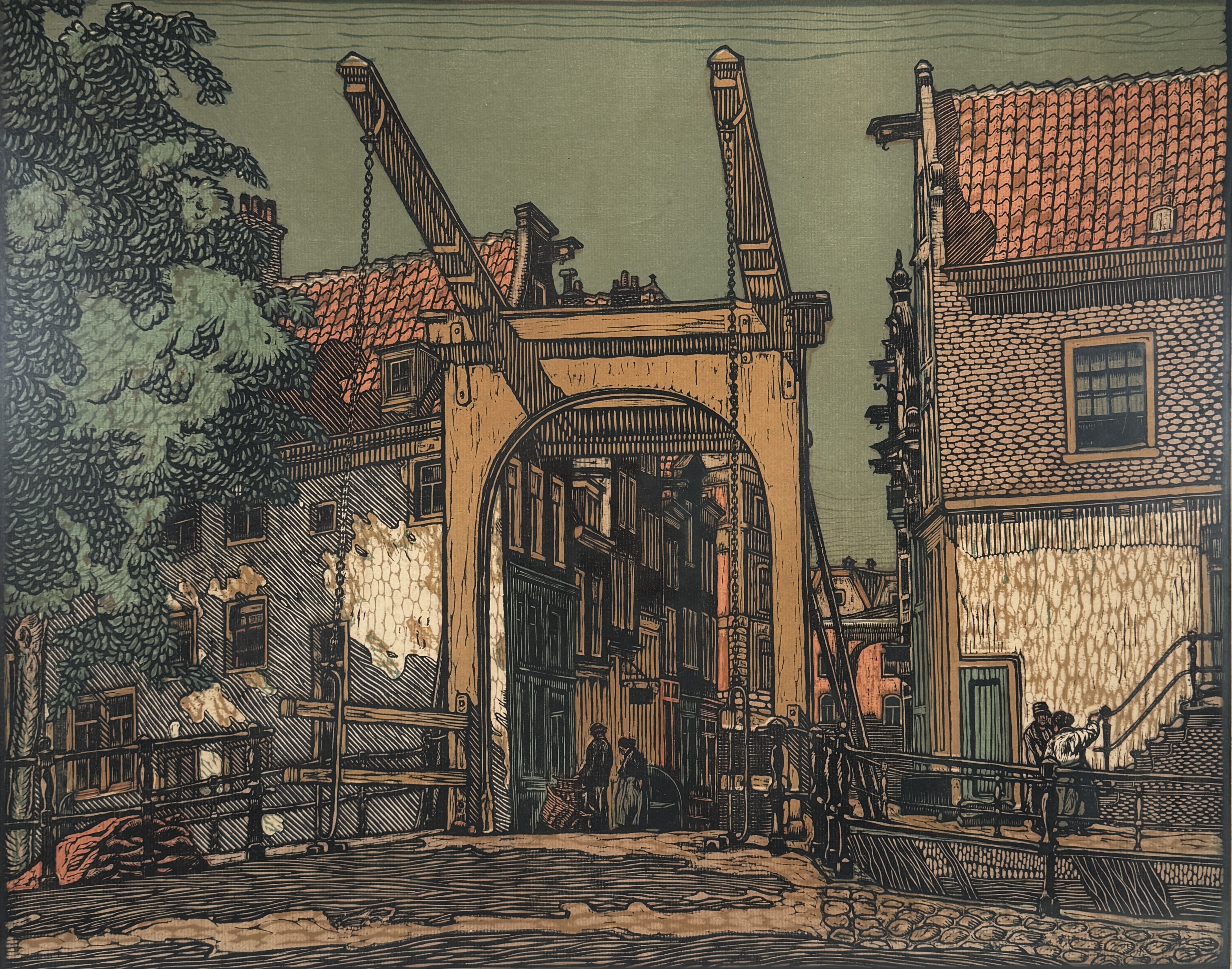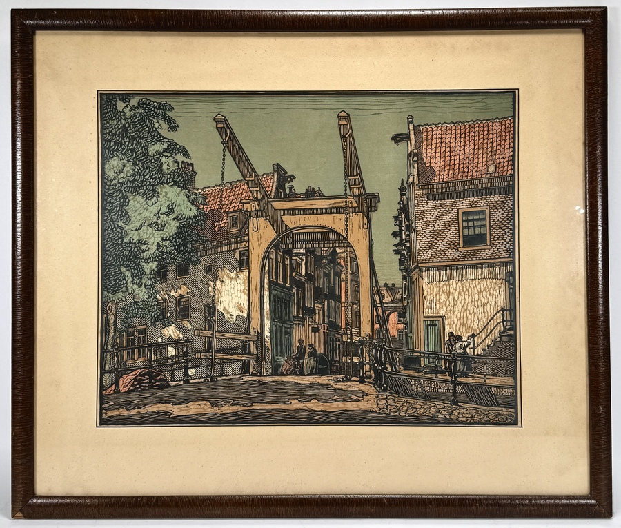Een kleuren-houtsnede van Wilm Wouters (1887-1957), gedateerd 1932. De realistische voorstelling toont een stadsgezicht met een ophaalbrug, omliggende gebouwen met rode daken en figuren op straat. Het werk is uitgevoerd met sterke contouren en ongemengde kleurvlakken in groen, bruin en oranje, kenmerkend voor de houtsnedetechniek. Voeg dit toe aan je verzameling en doe een bod! |