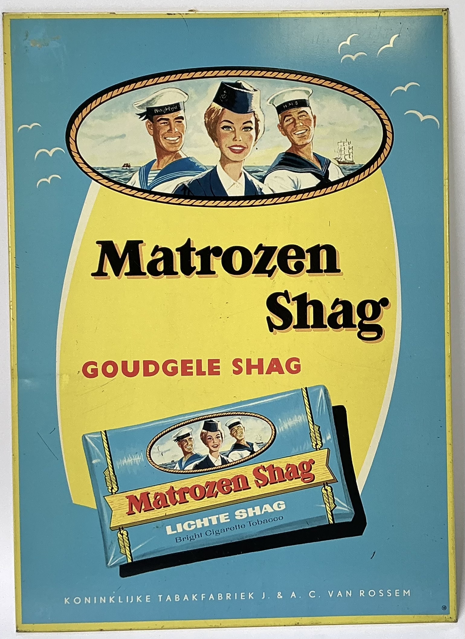 Blikken reclameborden Hartevelt, Matrozen Shag en Snelle Sprong midden 20e eeuw