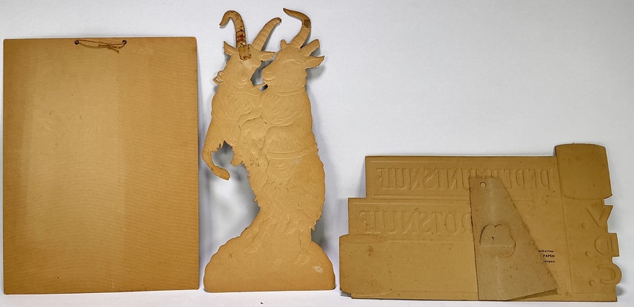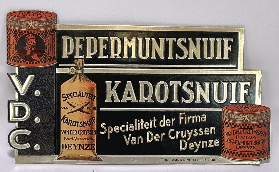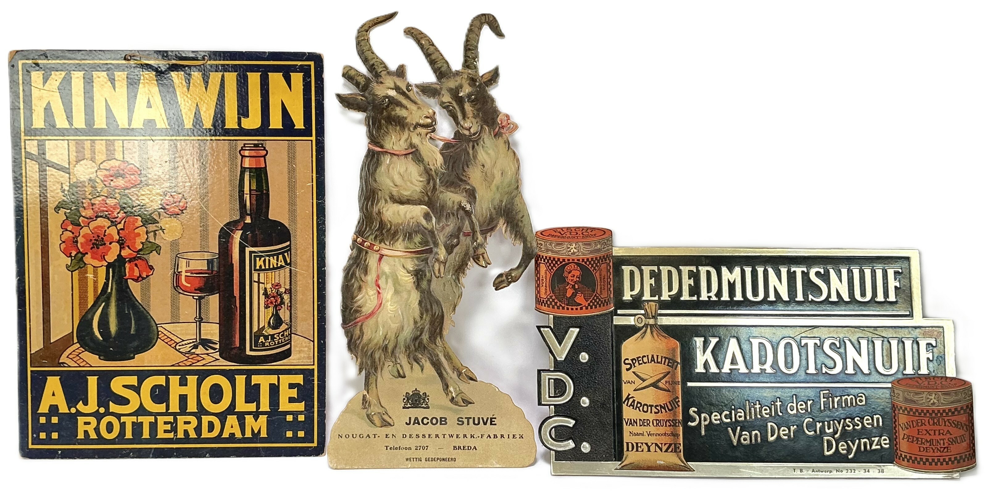 Drie reclameborden uit circa jaren 1920–1930, gedrukt op karton. De borden tonen product reclame voor Van Der Cruyssen Pepermunt- en Karotsnuif (Deynze), Jacob Stuvé Nougat- en Dessertwerkfabriek (Breda) en A.J. Scholte Kinawijn (Rotterdam). Uitgevoerd in chromolithografie met kenmerkende Art Deco en Art Nouveau stijlelementen en opvallende illustratieve product afbeeldingen. Zeker zijn van deelname? Plaats vanaf 22 augustus een schriftelijk bod online! |