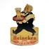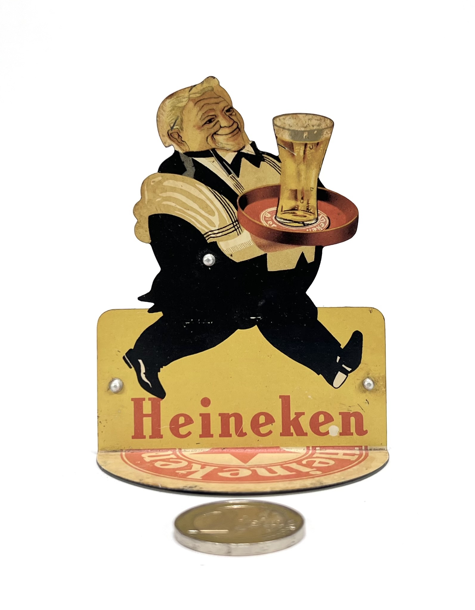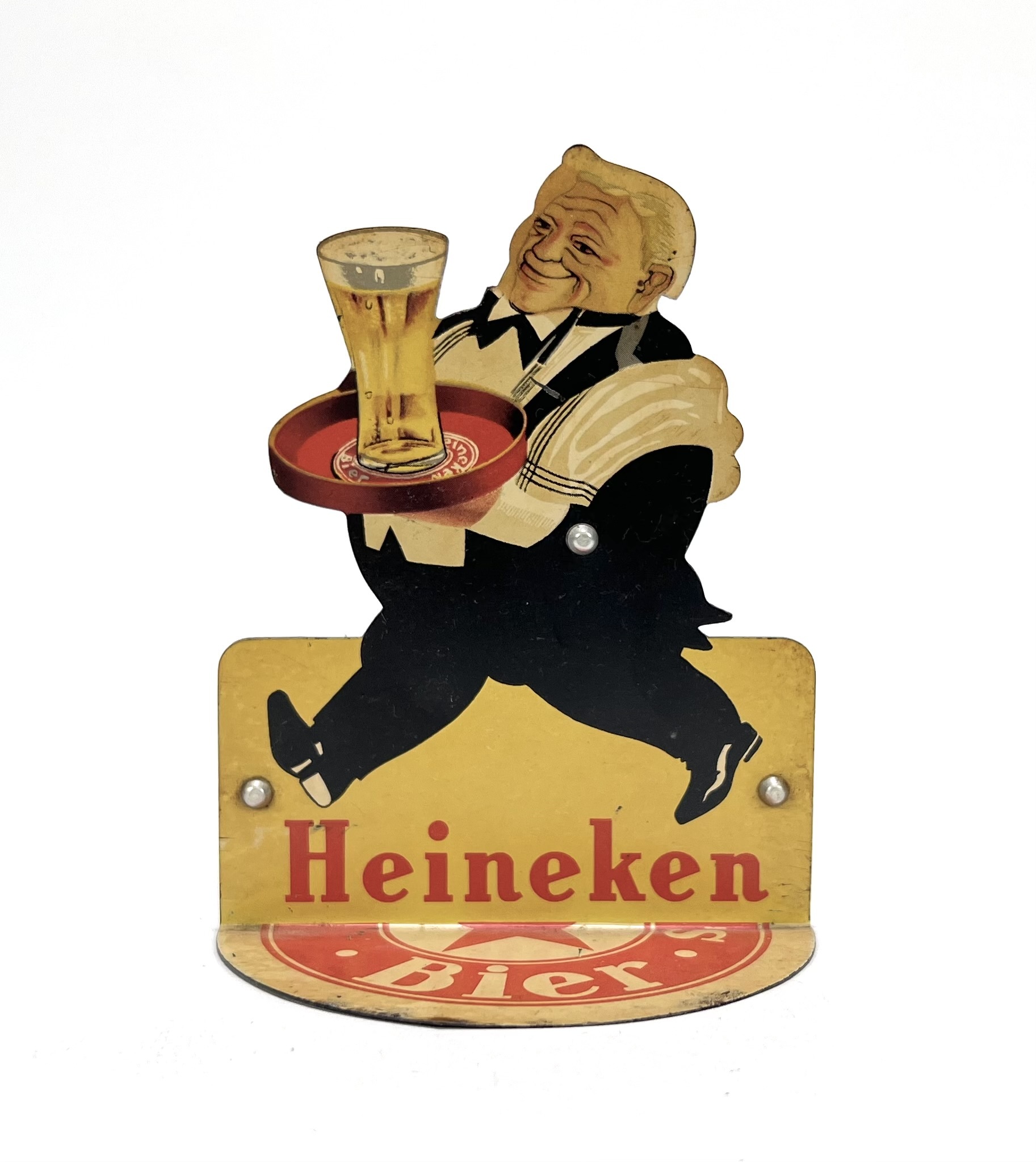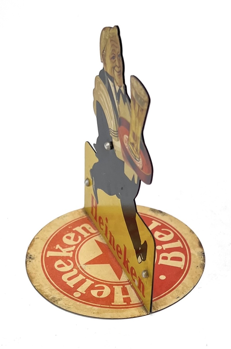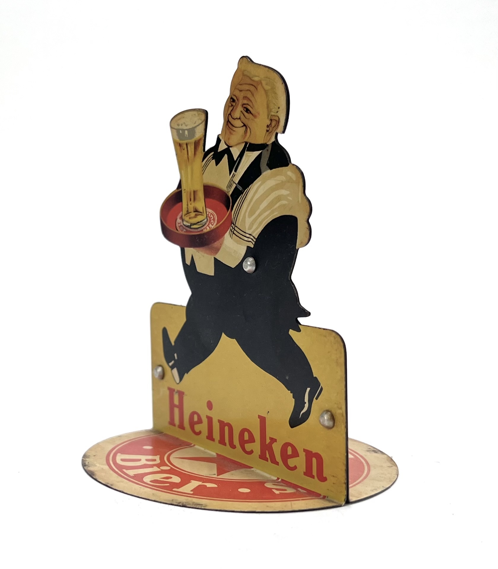 Metalen Heineken reclameobject uitgevoerd als vrijstaande tafeldisplay, vervaardigd uit bedrukt metaal met lithografische opdruk, midden 20e eeuw. Voorstellend een ober met dienblad en bierglas, op een ronde voet met het klassieke rode ster-logo en opschrift “Heineken Bier”. Kenmerkend door het kleurrijke ontwerp en het gebruik als reclamemateriaal in horecaomgevingen. Registreer je nu en bied eenvoudig online mee op dit reclameobject! |